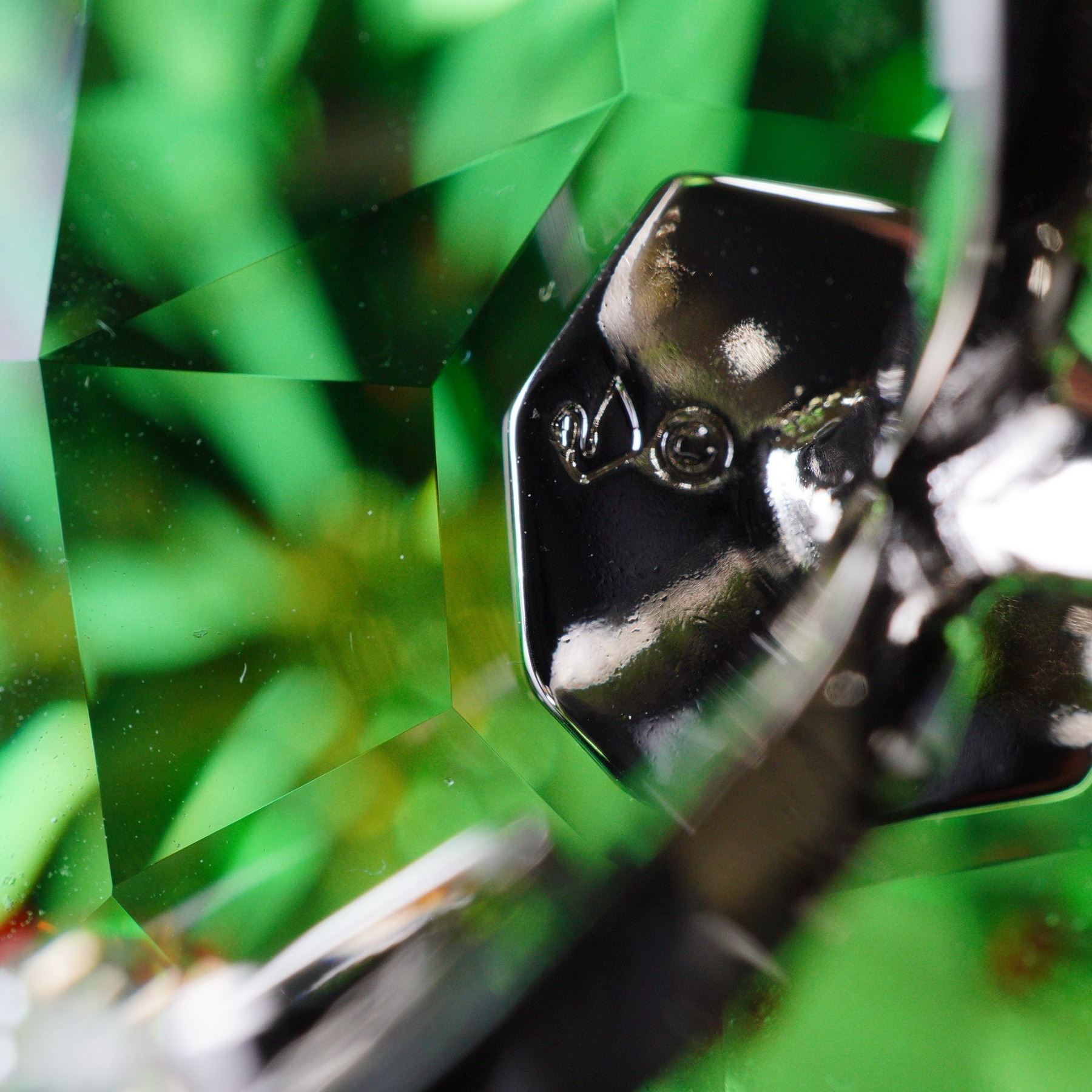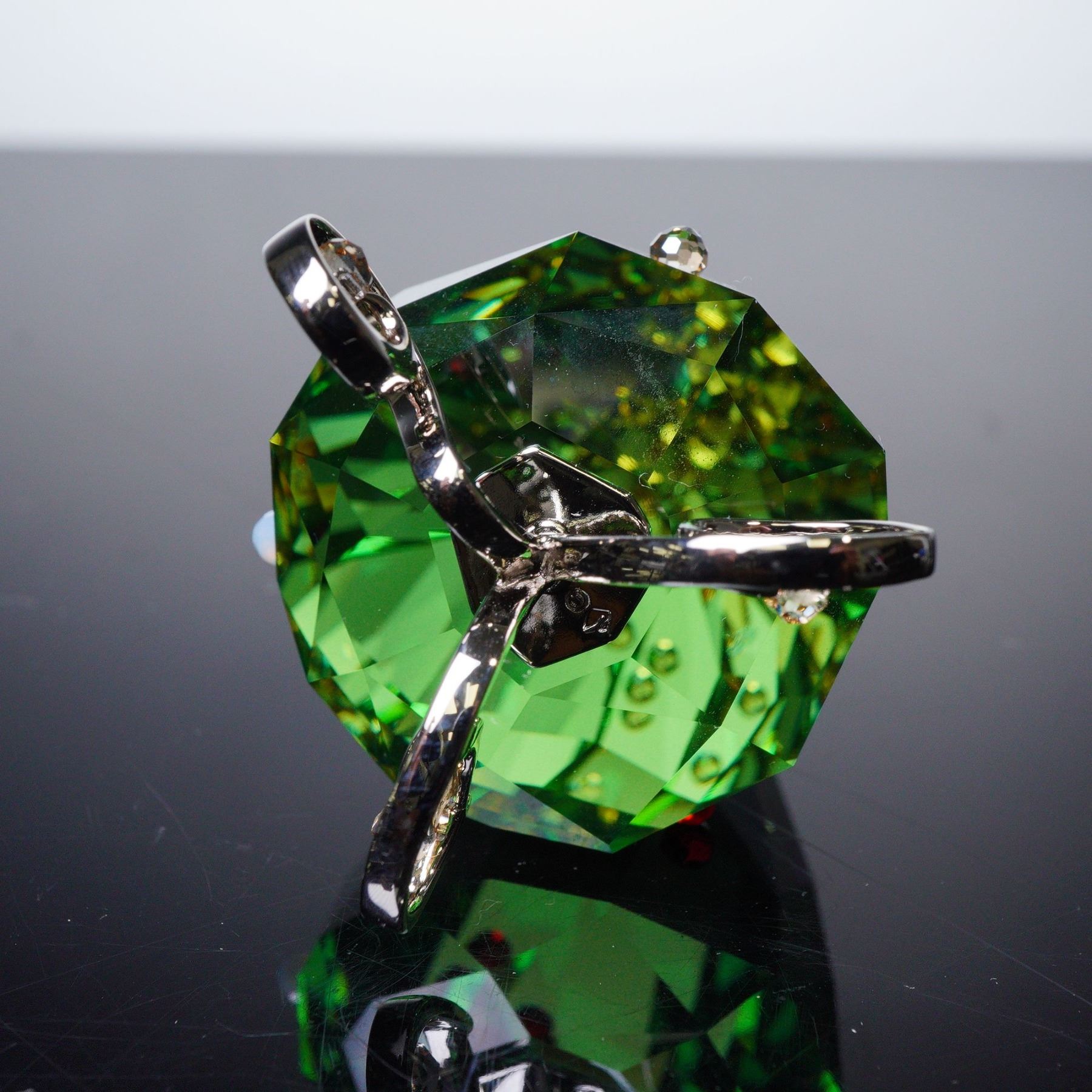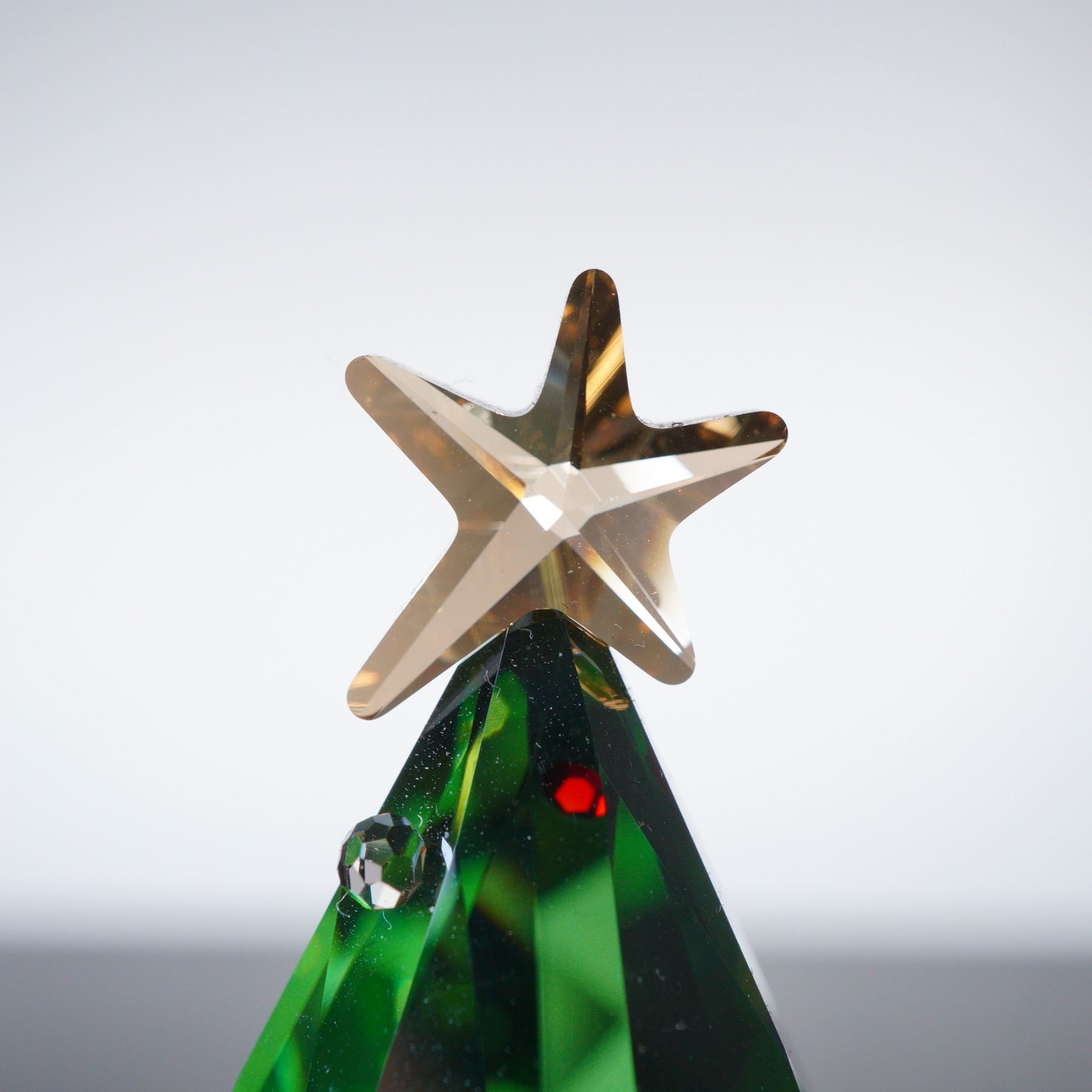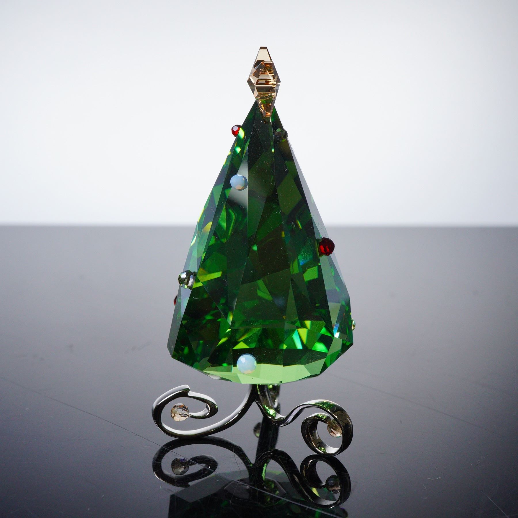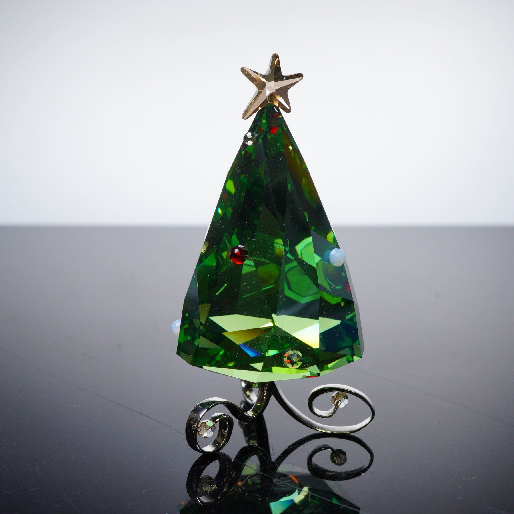 Festive tree figurine, crafted in brilliant emerald green crystal with multicolored ornament accents and a golden crystal star topper. The tree rests on a graceful polished metal scroll base, reflecting Swarovski's signature precision-cut brilliance. Includes original Swarovski box. 5464888.
