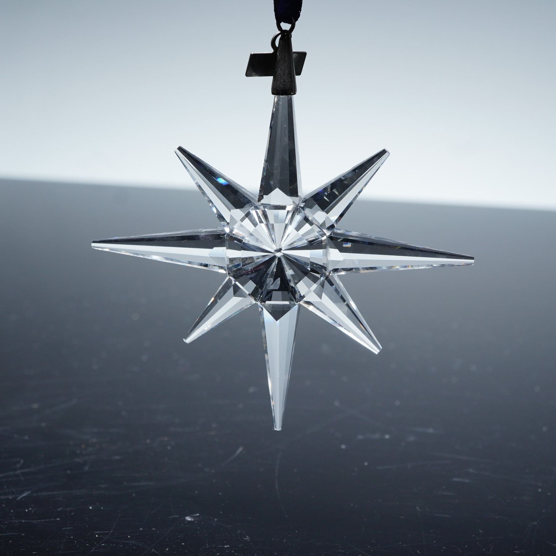 Swarovski crystal holiday ornament, 1995 annual edition star 191367, featuring a radiant eight-pointed clear crystal design with precisely cut facets that sparkle beautifully. The ornament is suspended from a deep blue ribbon and includes a metal tag engraved with the year 1995. Presented with its original white triangular box decorated with a stylized holiday tree motif. This striking early annual edition is a sought-after collector's piece that brings brilliance and charm to holiday decor. Swarovski backstamp.