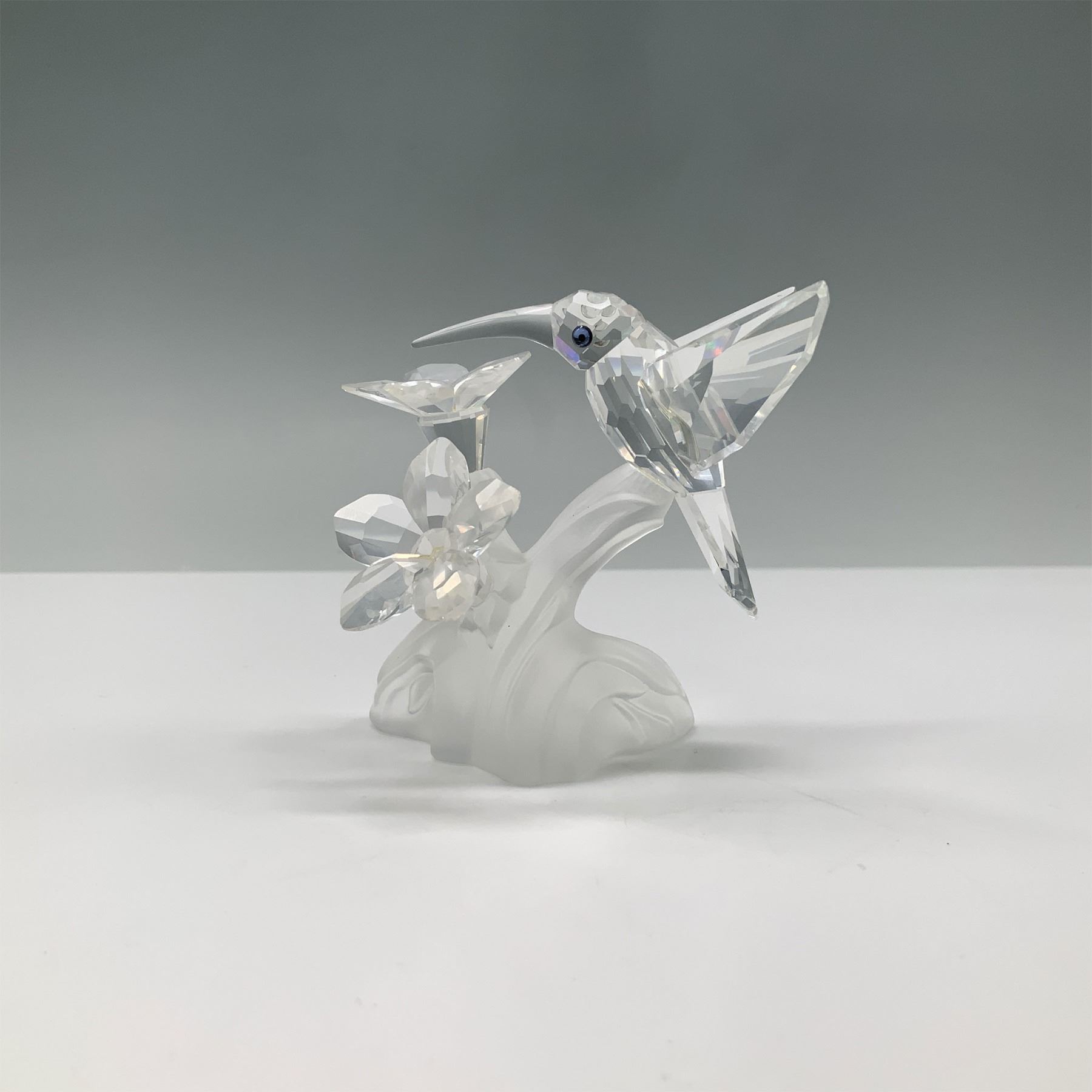 Swarovski Crystal Hummingbird figurine, designed by Claudia Schneiderbauer. This piece was introduced in 1992 and retired in 2007. The hummingbird features faceted clear crystal wings and body, perched near a frosted crystal flower on a smooth base. It is part of the Swarovski Silver Crystal collection and includes the original box and packaging. Marked "Made in Austria" with the item number 166184, this figurine is a charming representation of Swarovski's nature-inspired designs.