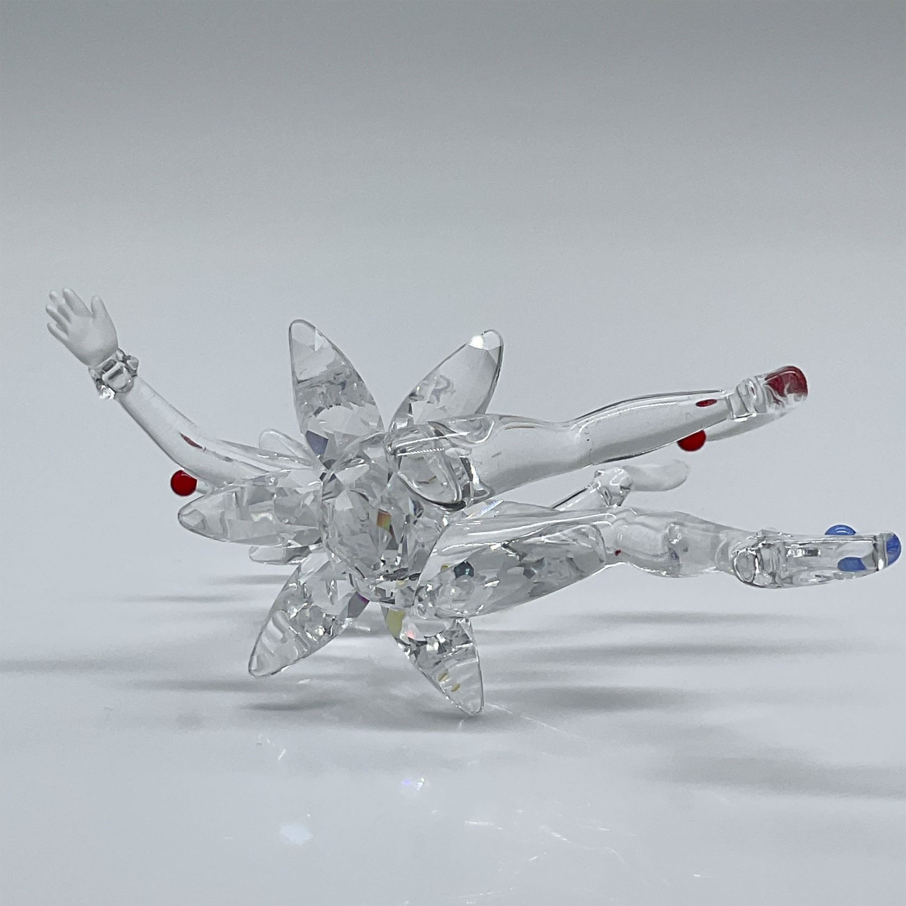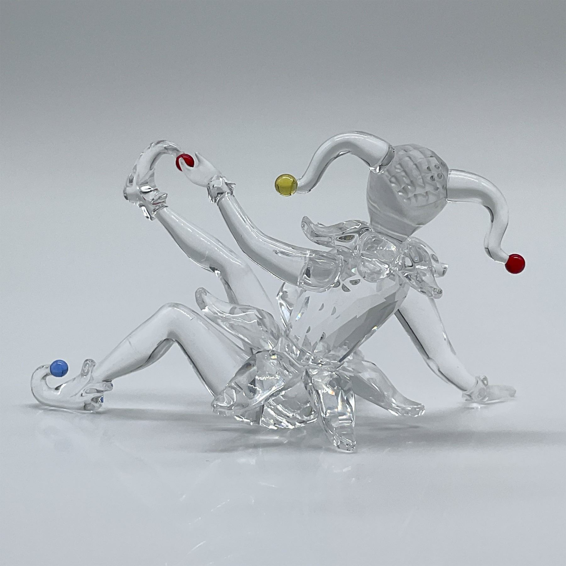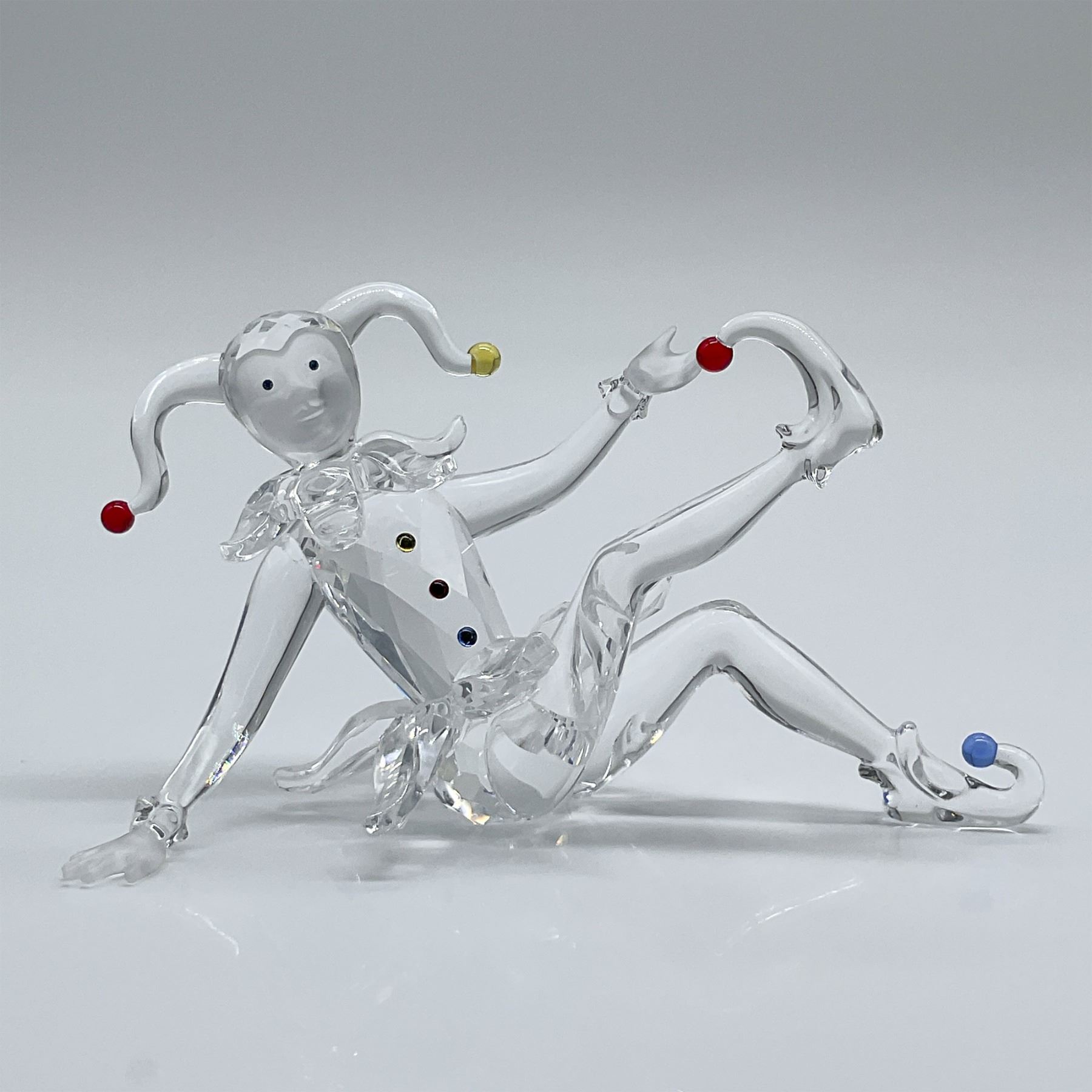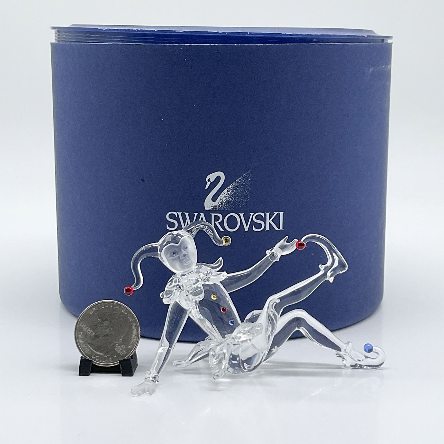 Presenting a delightful Swarovski Crystal Jester figurine, crafted with exceptional detail and precision. This playful piece features a seated jester adorned with colorful accents, including red, yellow, and blue highlights on the hat and costume, adding a whimsical touch. The figure is marked with the Swarovski acid-etched swan logo, ensuring its authenticity. As noted by The Crystal Lodge, this design continues to be a favorite among collectors for its unique charm and exceptional craftsmanship. The original box accompanying this piece measures 5 inches high, while the figurine itself stands at 1.75 inches tall. A perfect addition for Swarovski enthusiasts or collectors of unique crystal figures. Item Number: 275555.