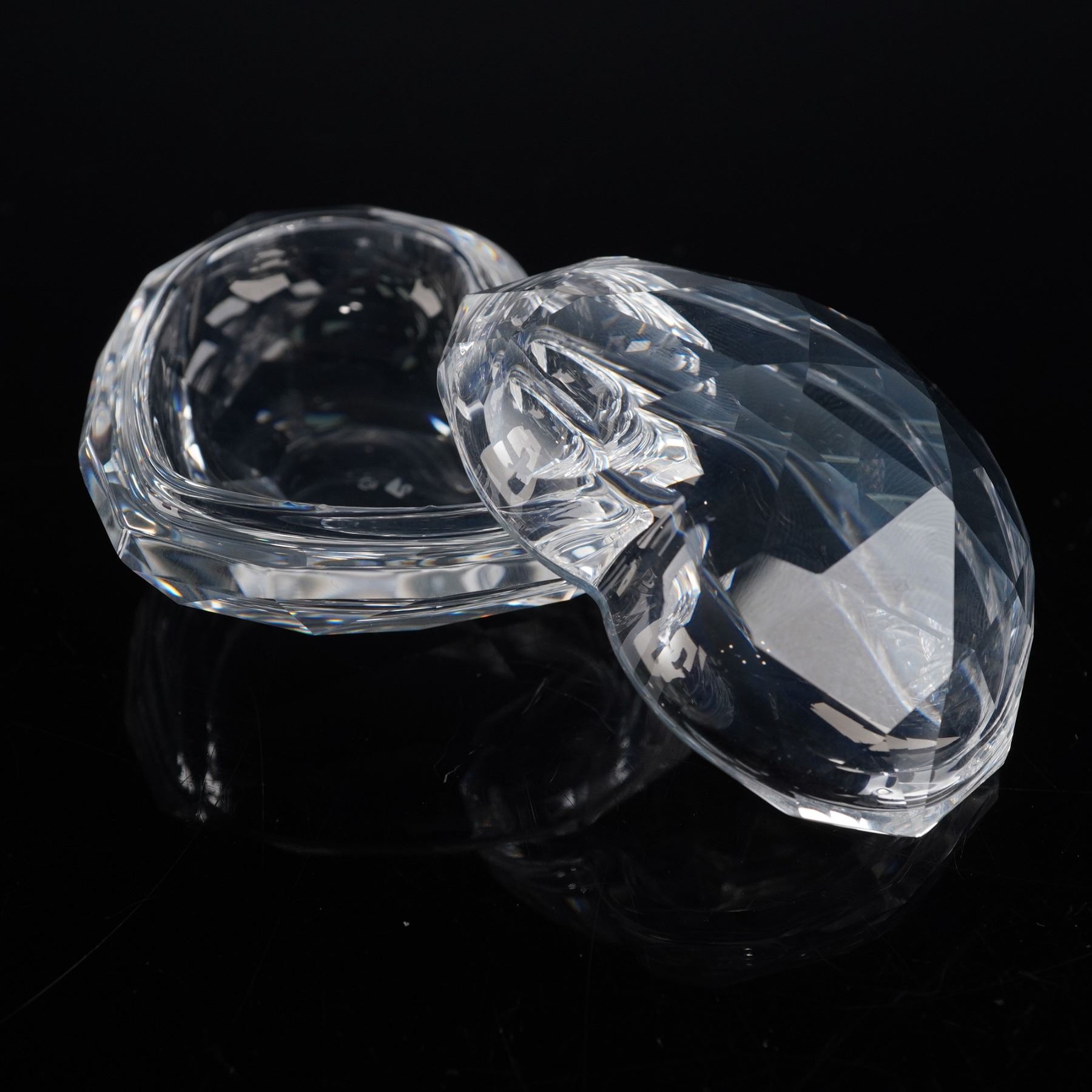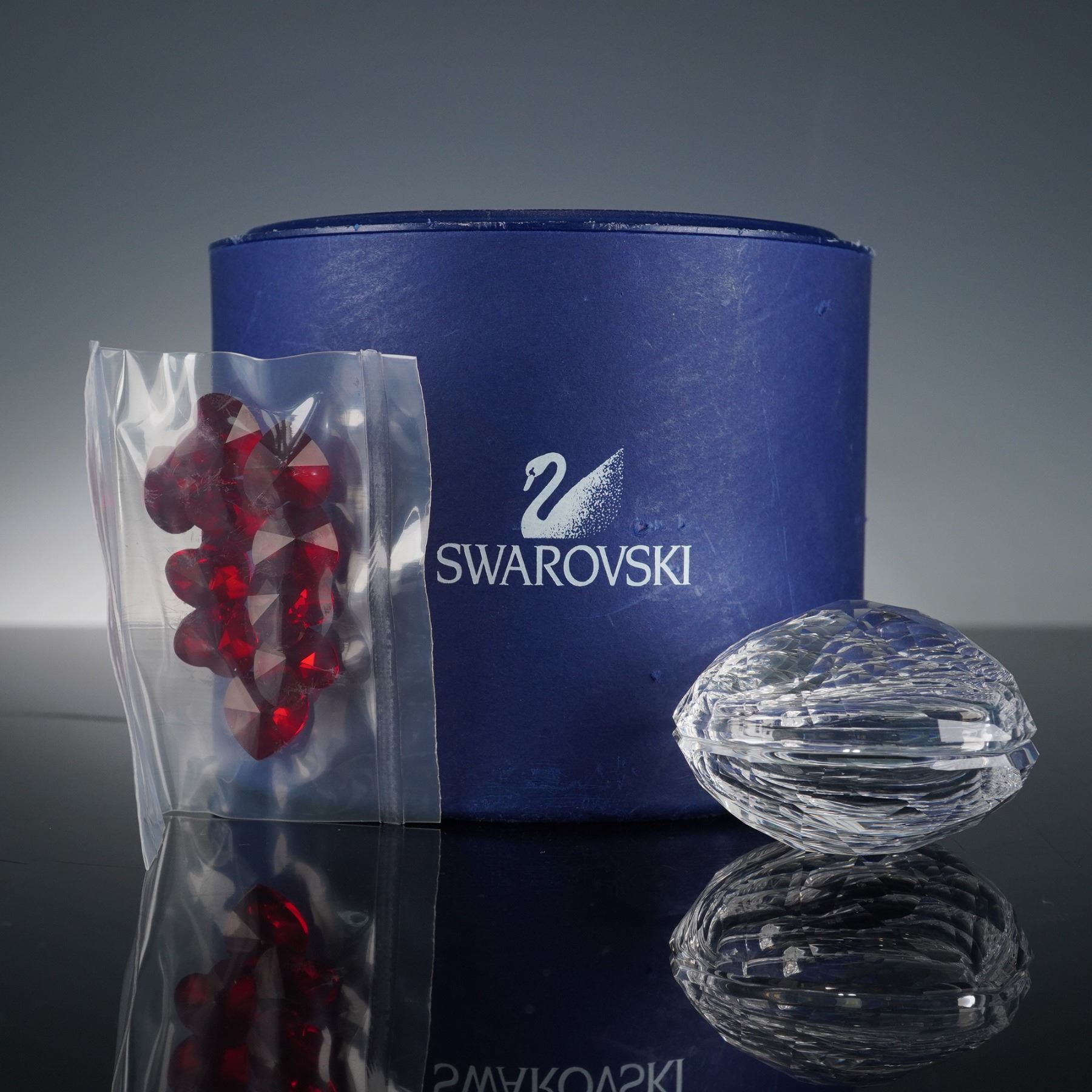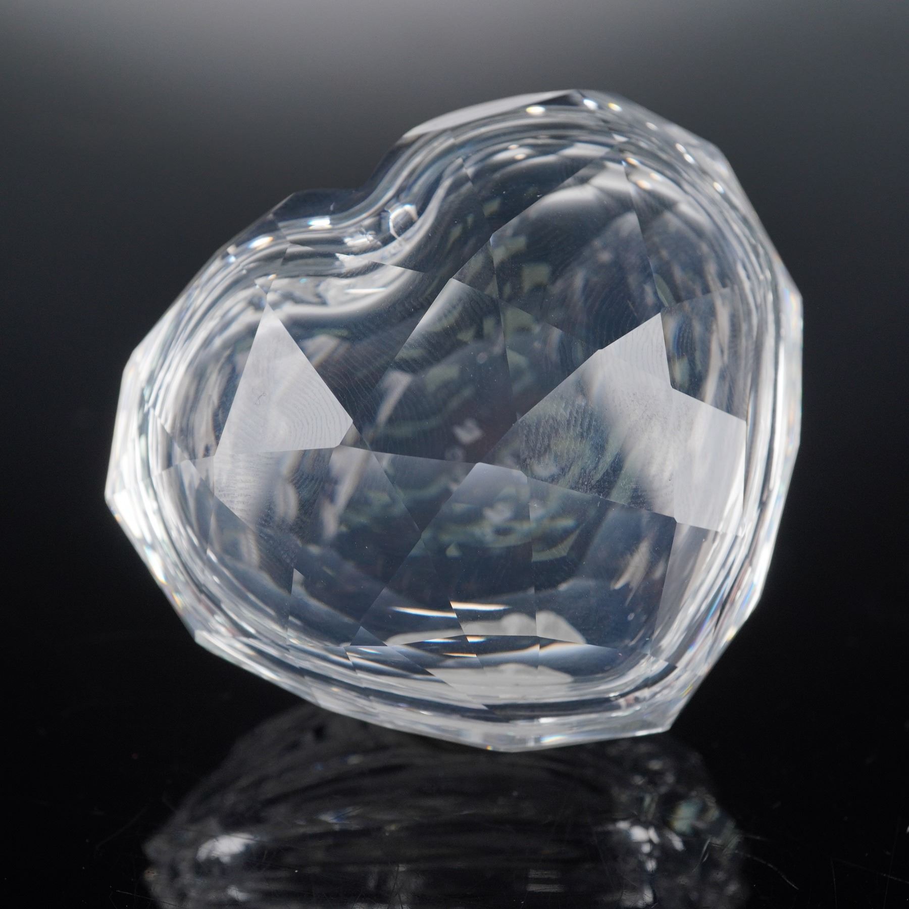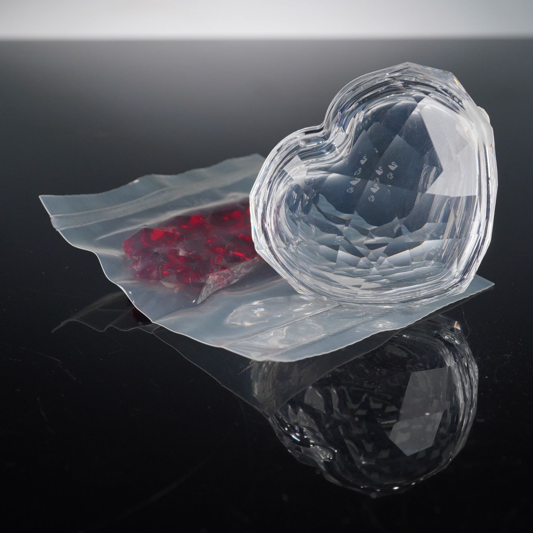 Romantic Swarovski Crystal Jewel Heart Box, designed by Edith Mair for the Crystal Moments collection. This beautifully faceted clear crystal heart box opens to reveal an interior compartment perfect for holding the included set of brilliant red crystal hearts. The piece embodies Swarovski's signature craftsmanship and emotional symbolism, representing love, devotion, and timeless elegance. The vibrant red crystal hearts provide a striking contrast to the precision-cut clear crystal form, making this a standout piece for collectors or as a heartfelt gift. Includes original Swarovski presentation box and packaging. 693910.