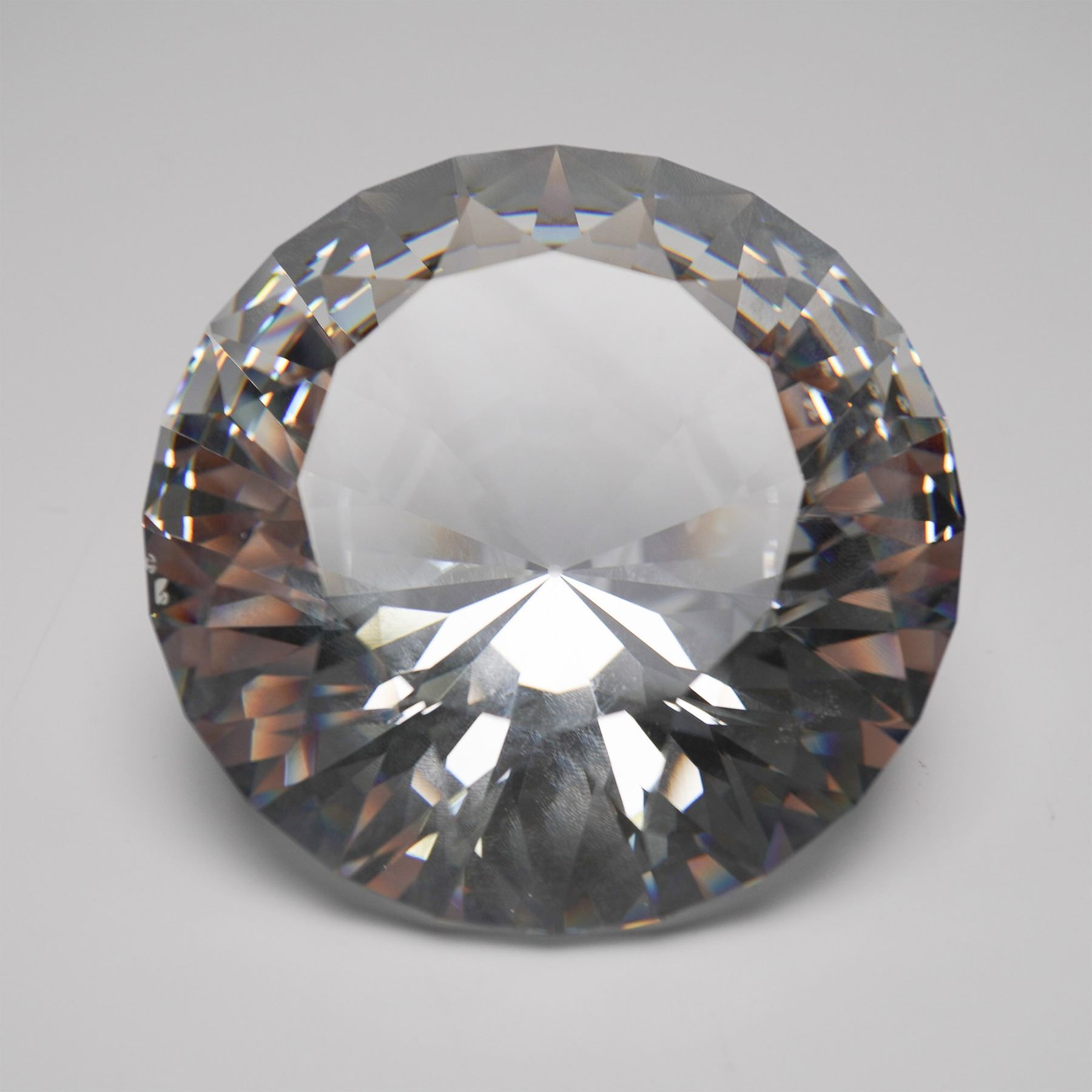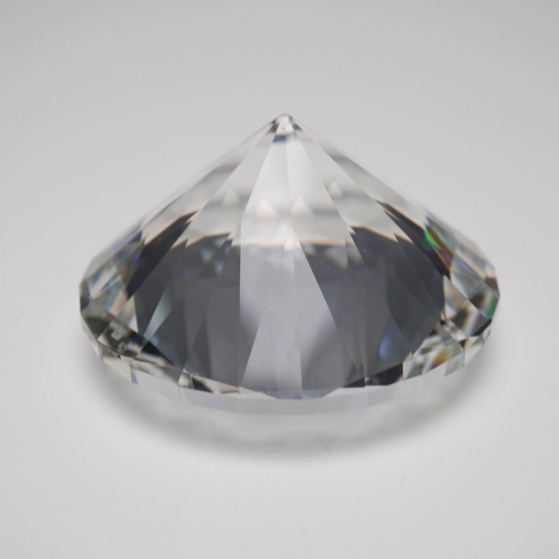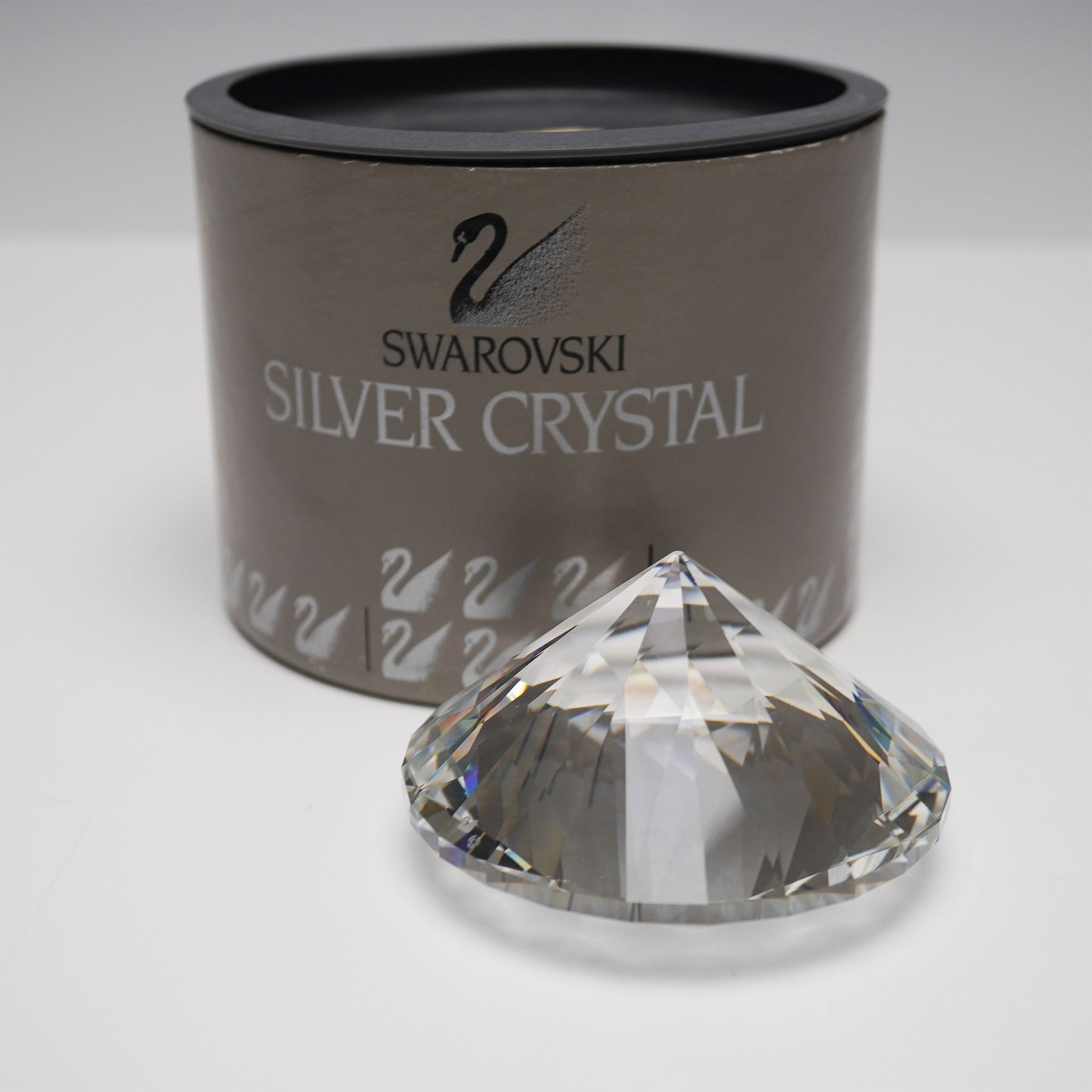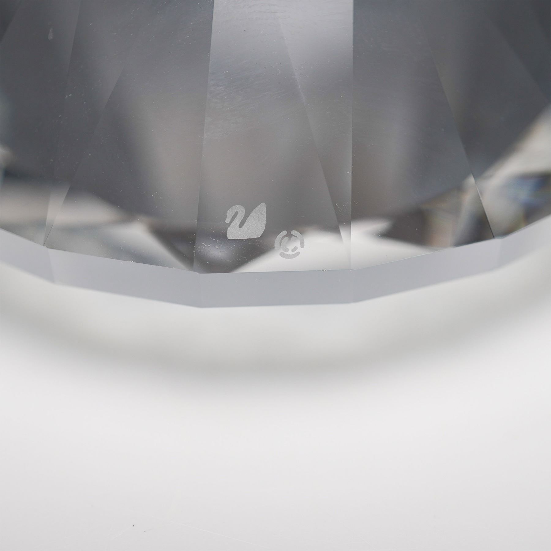 This stunning Swarovski Crystal Large Chaton Paperweight features a dazzling cut in the shape of a large diamond, reflecting light in an impressive array of colors. The paperweight is etched with the signature swan logo and an acid mark, denoting its authenticity as a genuine Swarovski piece. It comes in its original box, ensuring its pristine condition and offering collectors an excellent opportunity to add a classic Swarovski design to their collection.