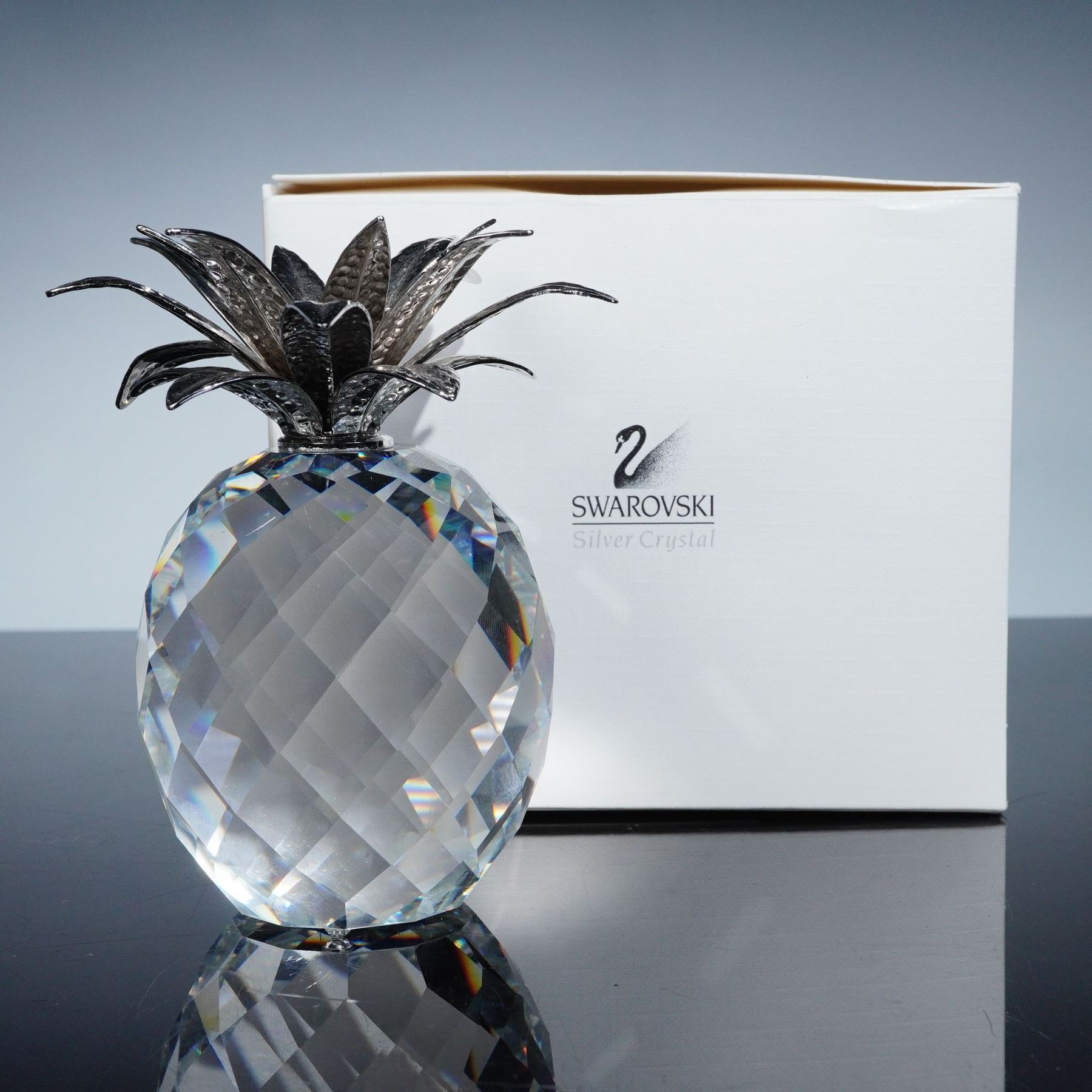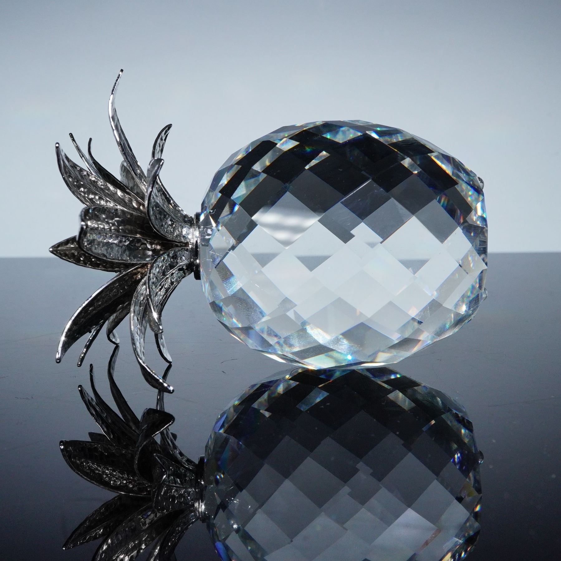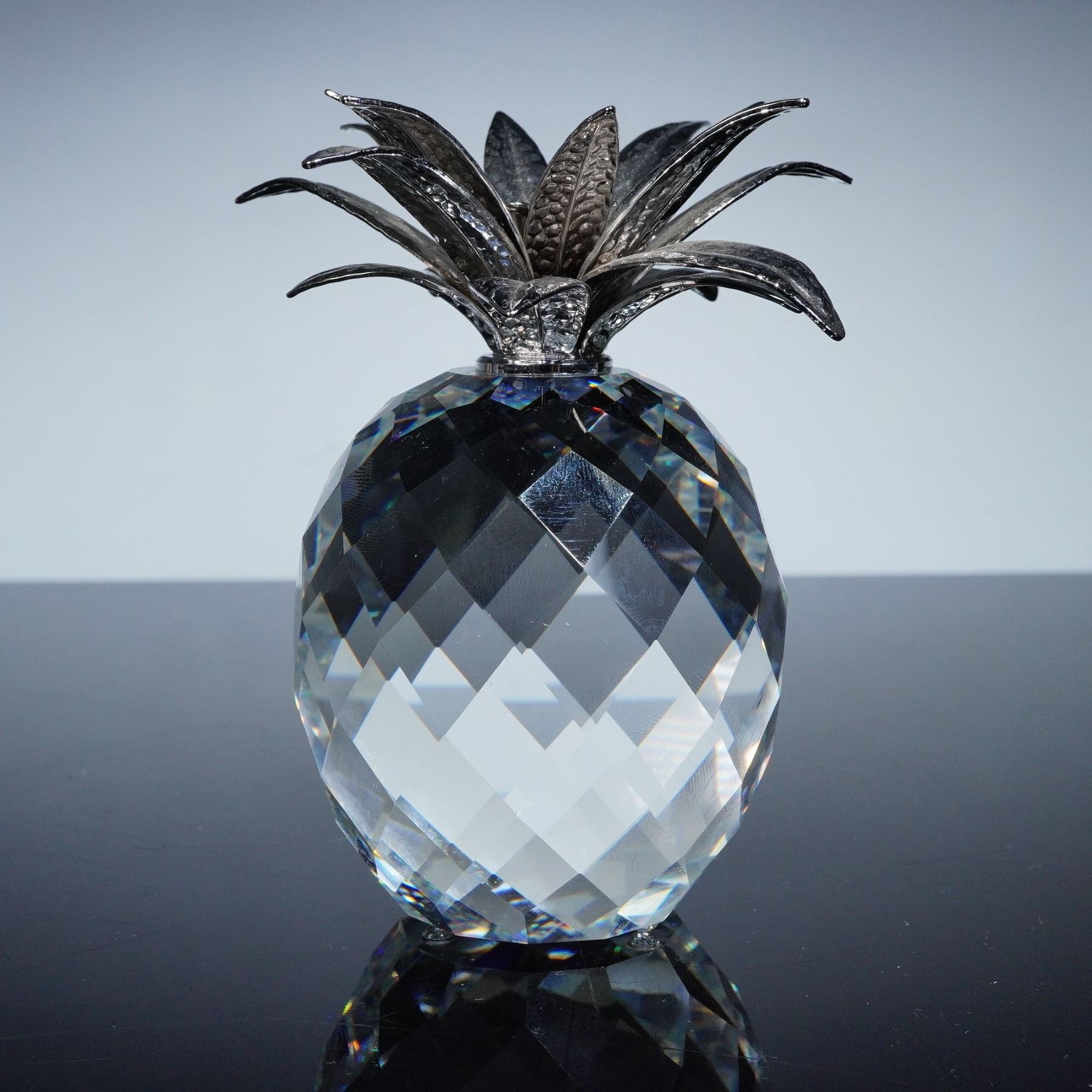 Brilliant Swarovski Silver Crystal figurine depicting a large pineapple, designed by Max Schreck. The piece features a faceted clear crystal body with exceptional brilliance and a sculptural crown of hammered rhodium-plated metal leaves, combining sparkle with rich metallic texture. This striking design reflects Swarovski's mastery in merging fine crystal artistry with luxurious finishes. The pineapple, a traditional symbol of hospitality and friendship, makes a stunning centerpiece or gift. The figurine bears the Swarovski block logo and includes its original box. 010081.