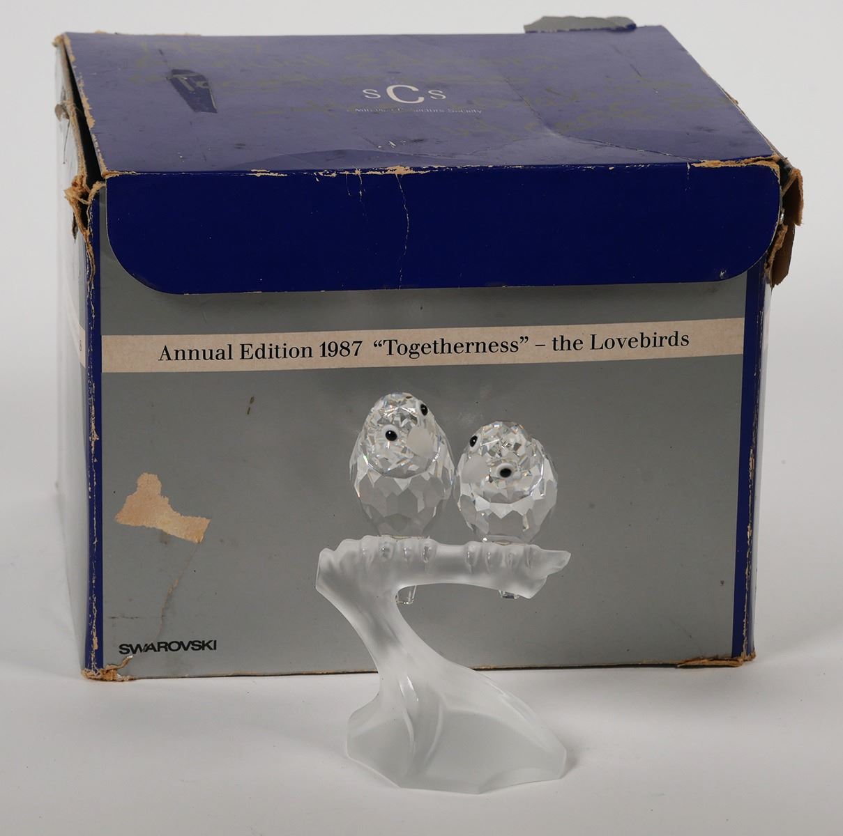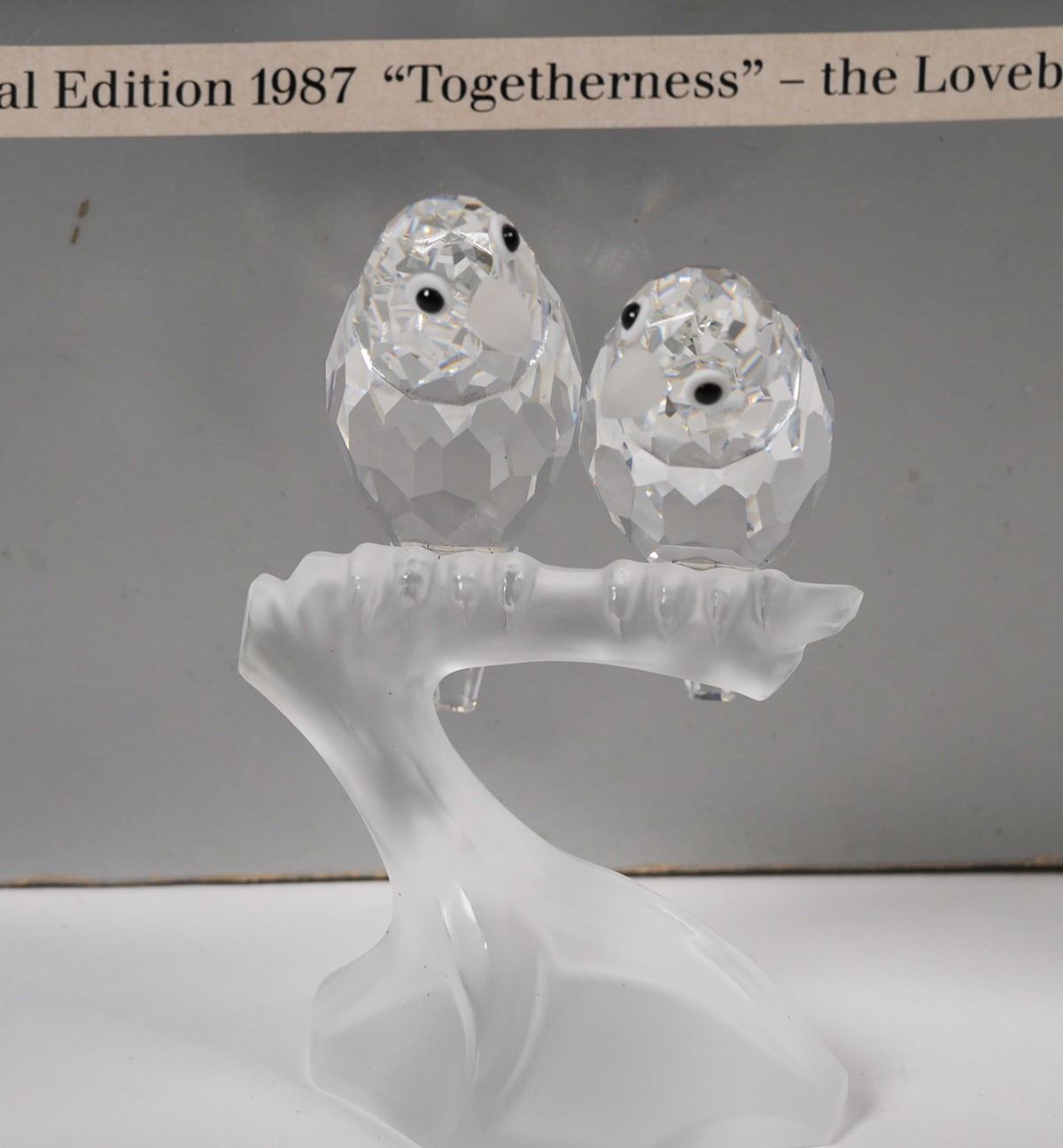 Retired 1987 SCS Annual Edition "Togetherness" - the Lovebirds 013560 / DO1X861. Lovebirds figurine is free of damage, box is missing original packing and has tears. See photos for more details on condition. Please see our other lots from a huge estate collection of rare and hard to find large Swarovski SCS and small Swarovski Silver figurines.