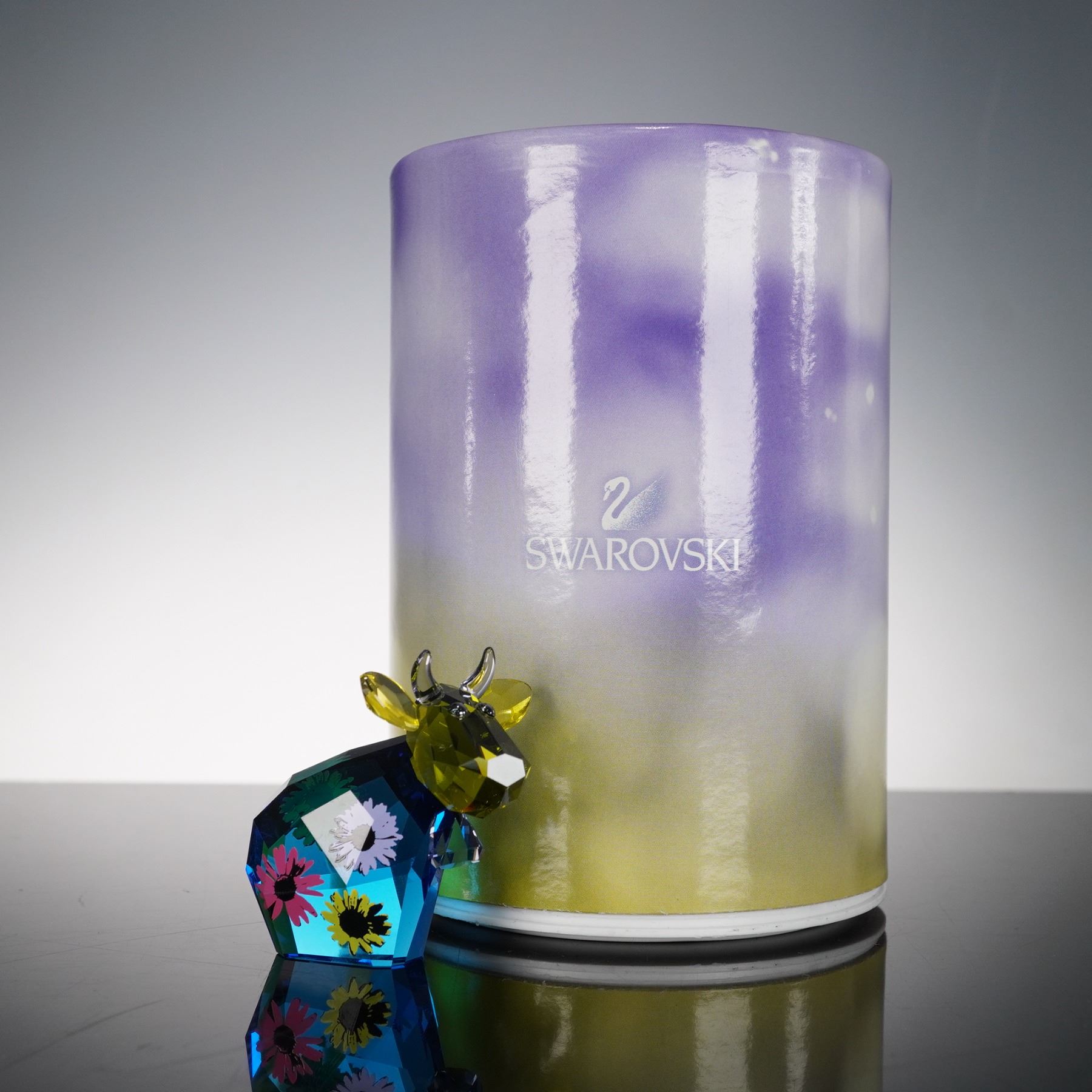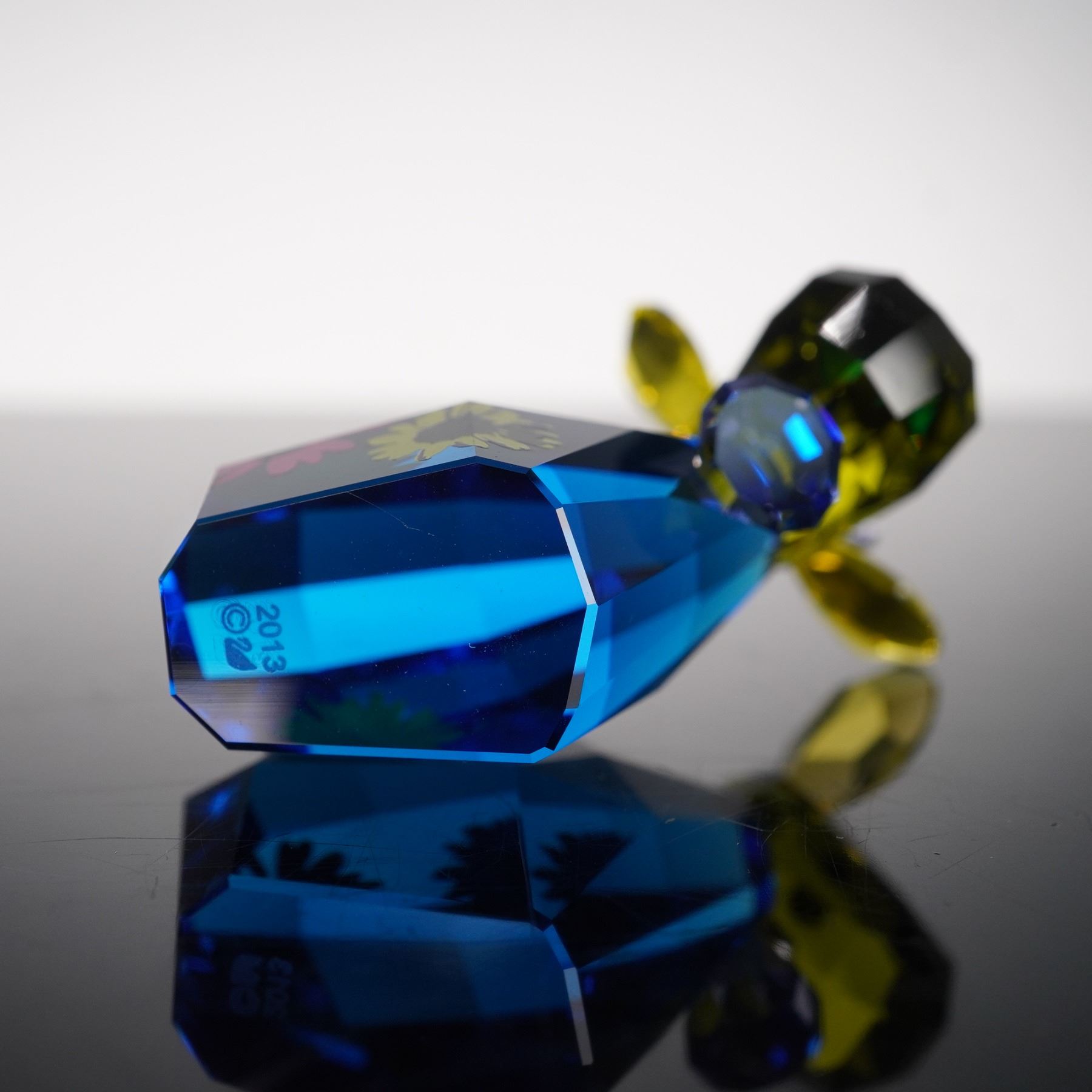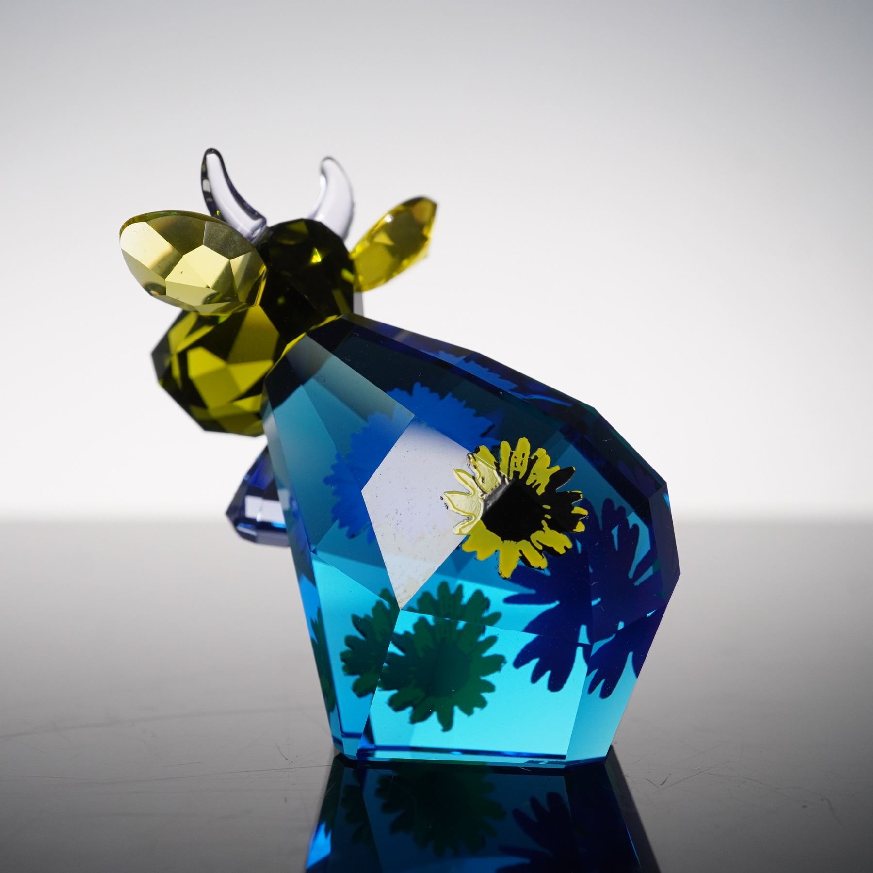 A vibrant figurine showcasing the playful cow motif adorned with faceted crystal in vivid blue tones, accented with a contrasting yellow crystal head and ears. The body features colorful printed florals along the body. This unique collector's piece was exclusively available online in 2013. Swarovski backstamp. This item has its original box.