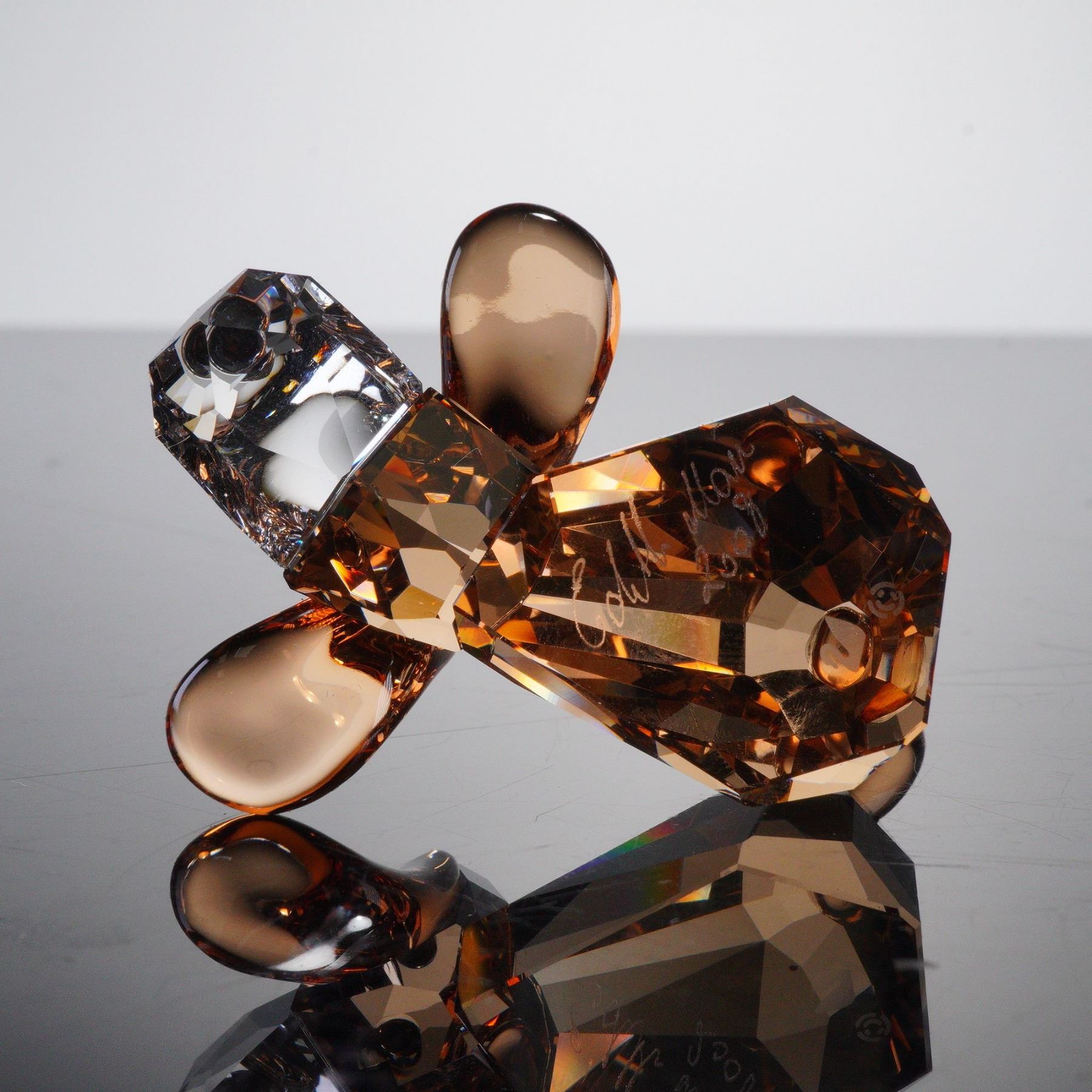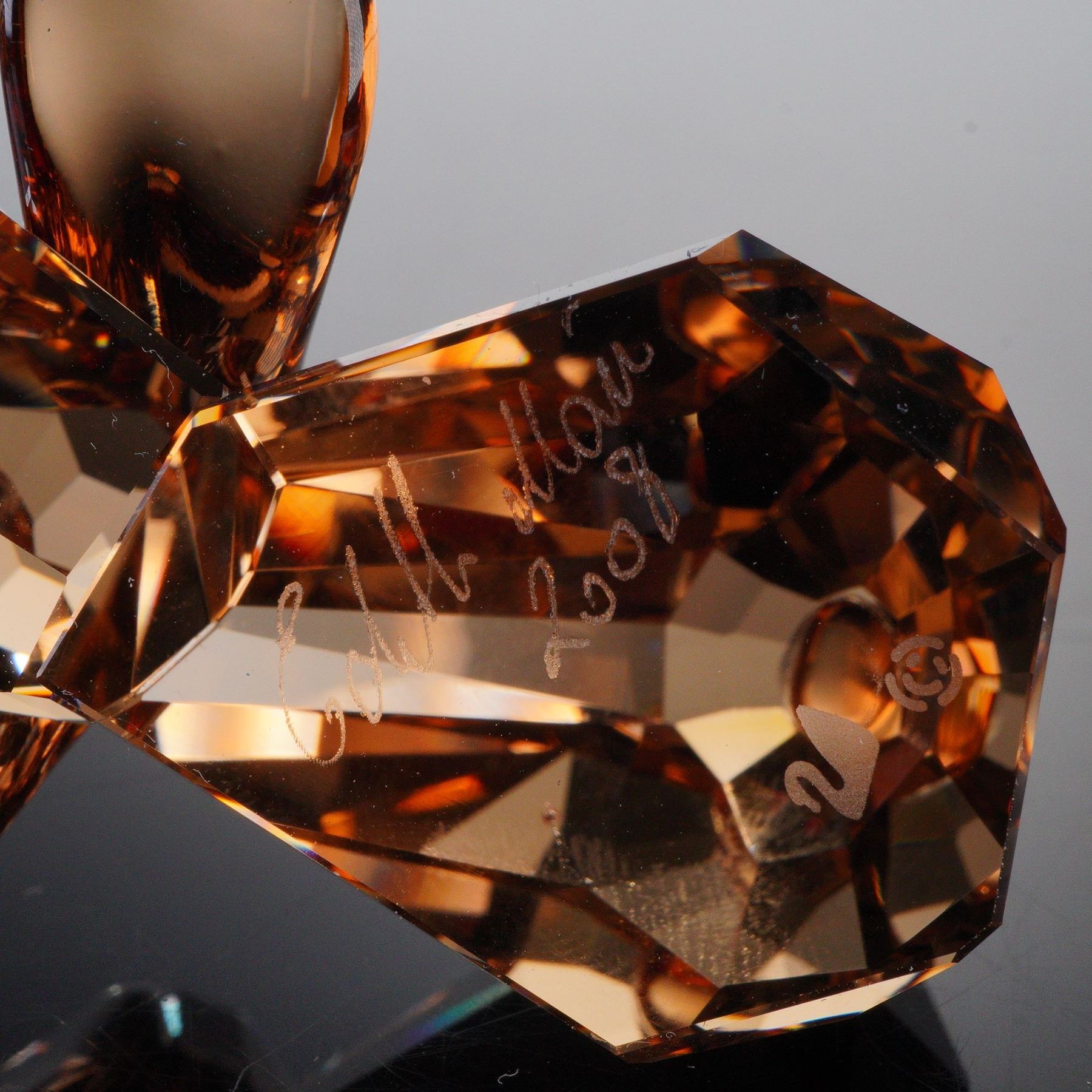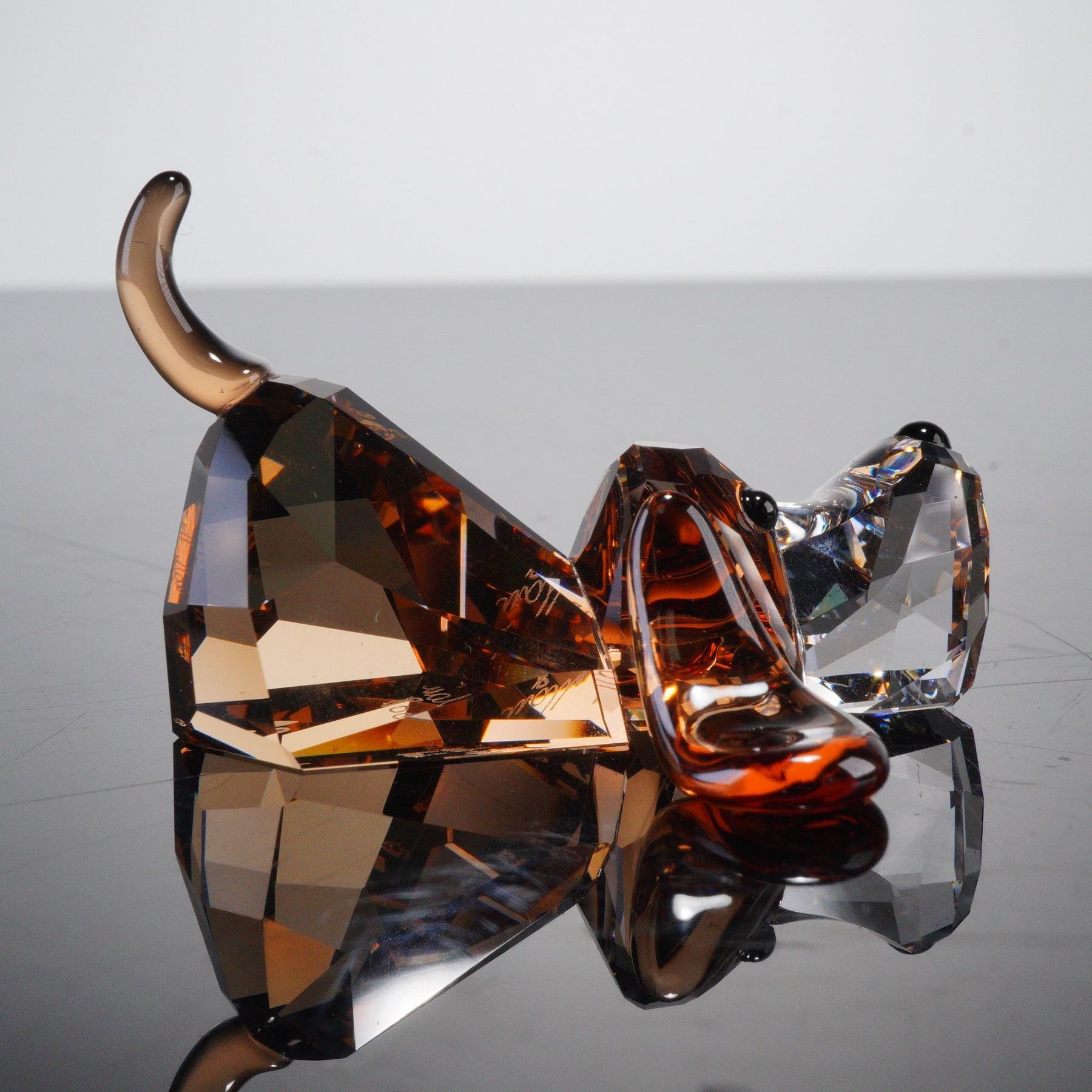 This Lovlots figure presents Peppino from the Gang of Dogs series, formed in faceted Light Smoked Topaz crystal with a clear crystal snout and jet-toned eyes. The sculpting emphasizes the elongated body and floppy ears characteristic of the design. The base shows marks including the artist's signature, 2008 date, and the Swarovski swan logo. The figurine is accompanied by its original cylindrical box. Model 935720.