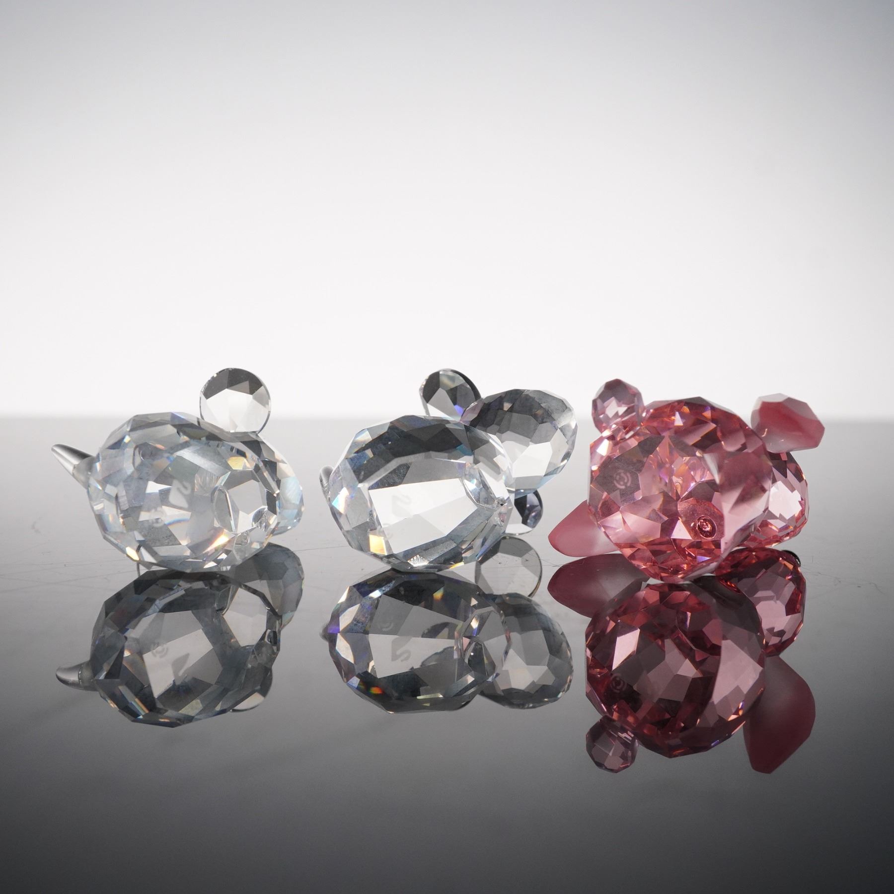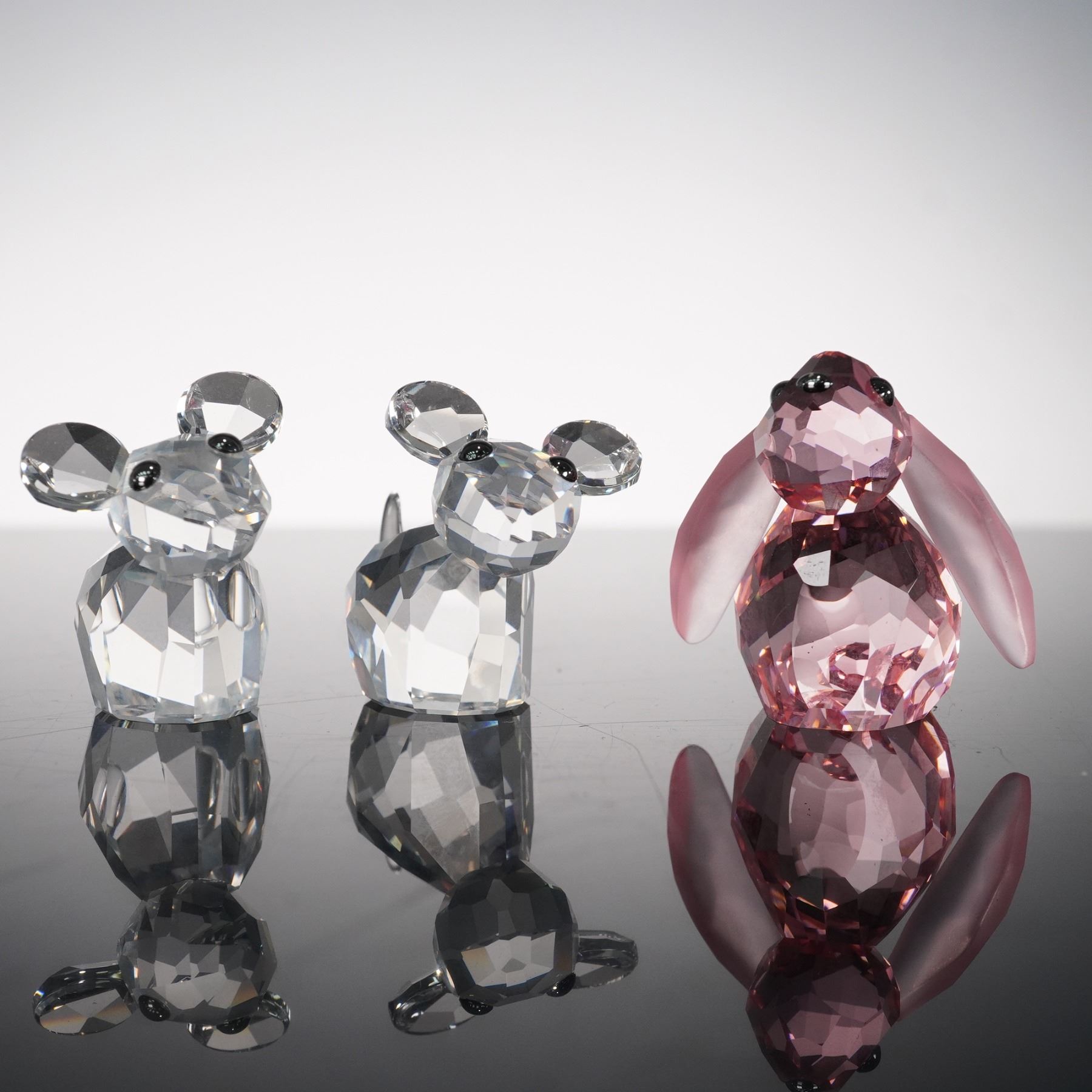 Three crystal figures comprising Lovlots Pioneers Jo & Harry Mice 843090 and Lovlots City Park Bella The Rabbit 1039867. These two mice team up as the cool duo all set for adventure, made of fully faceted clear crystal with sparkling and alert eyes in Jet Hematite crystal. Bella the rabbit is sure to win your heart as you look into her Jet Hematite crystal eyes filled with innocence. Swarovski backstamp. These item have its original boxes.