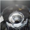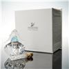A striking Swarovski Crystal Memories flacon featuring frosted crystal dolphins leaping over a light blue wave stopper, set atop a faceted clear crystal bottle. The piece includes a vial of loose crystal accents and is etched with the Swarovski swan logo. Comes complete with its original box.