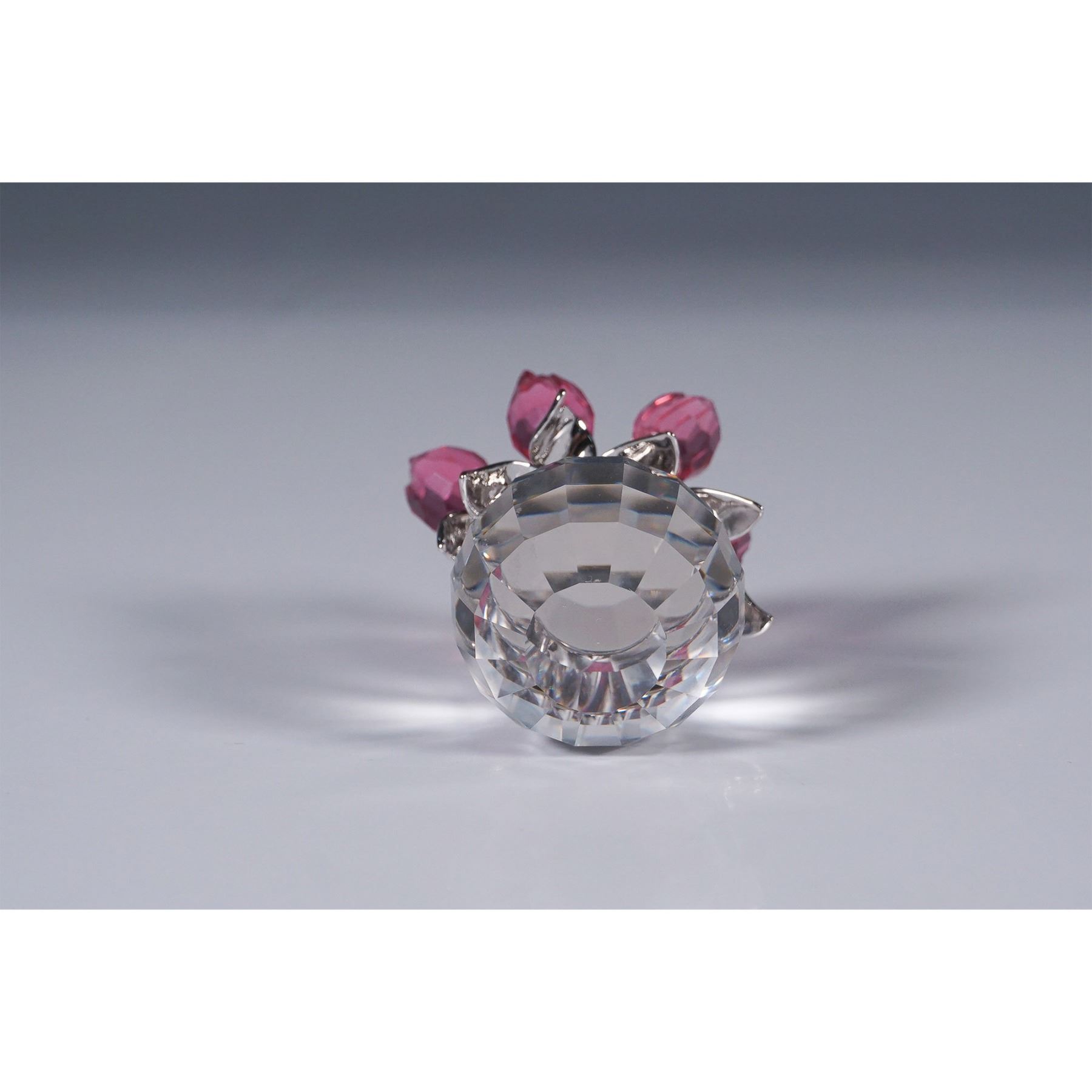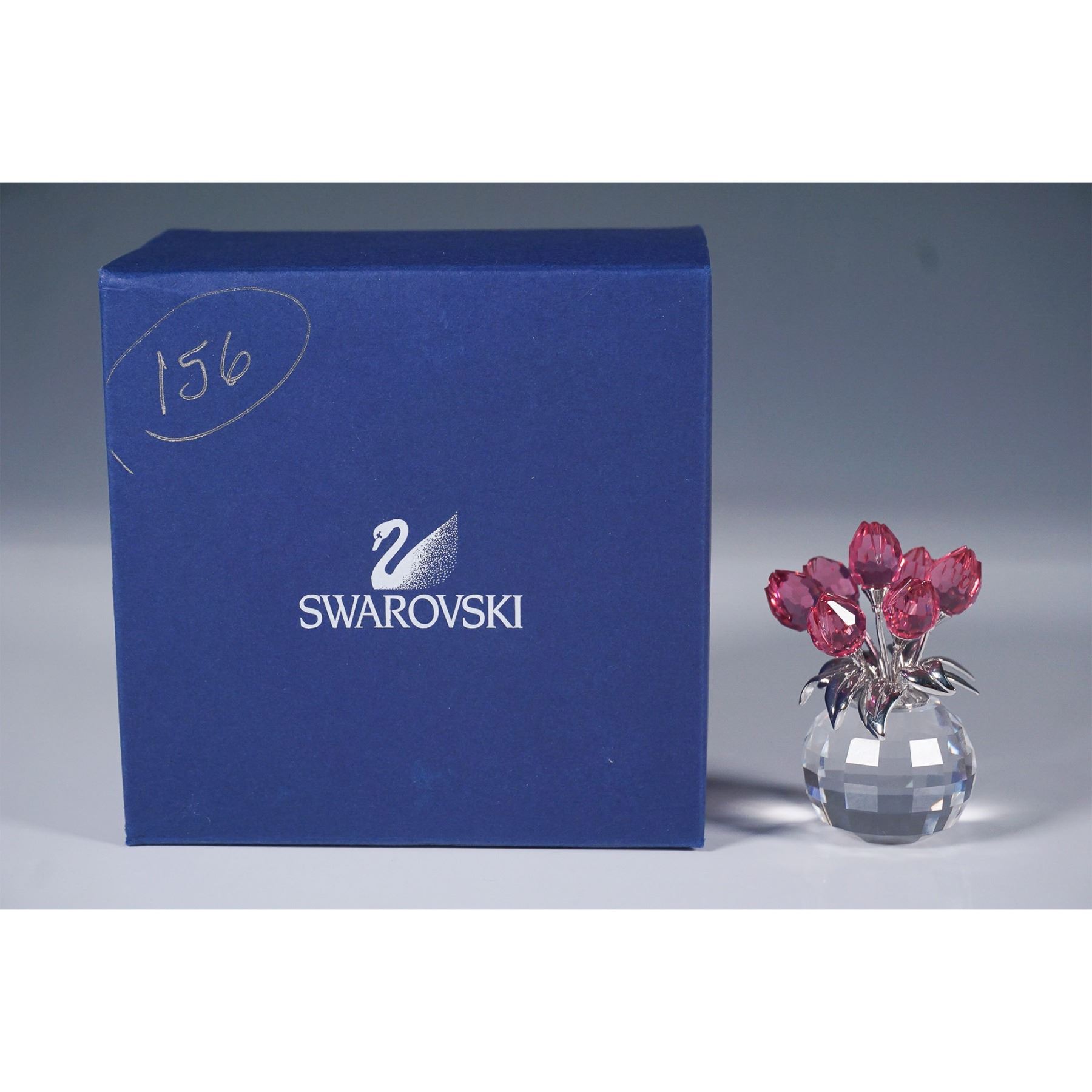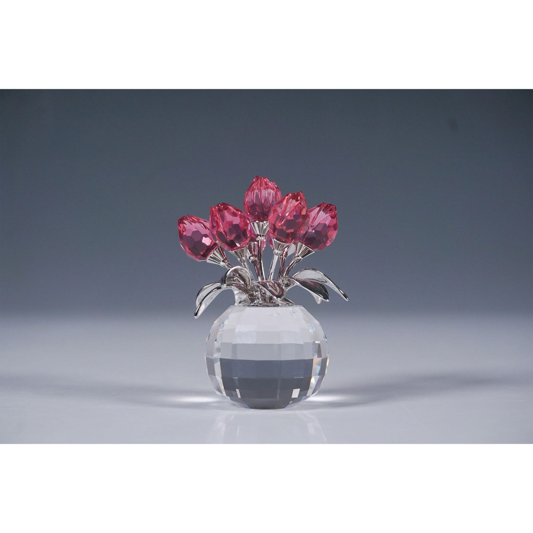Elegant Swarovski Crystal Tulip Bouquet, model number 626874. This stunning floral arrangement features six beautifully faceted pink crystal tulips with silver-tone metal stems and leaves, gracefully arranged in a multi-faceted clear crystal vase. The delicate craftsmanship and vibrant pink hues make this a captivating piece for any Swarovski or floral-themed collection. Includes the original box.