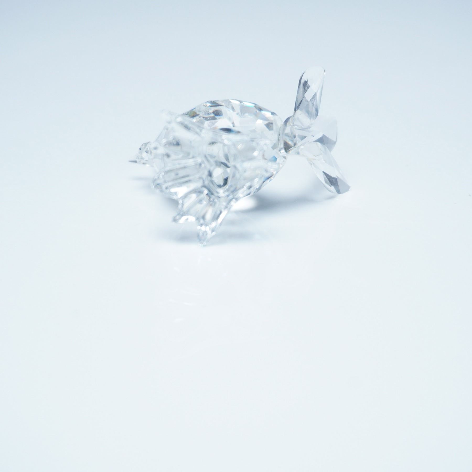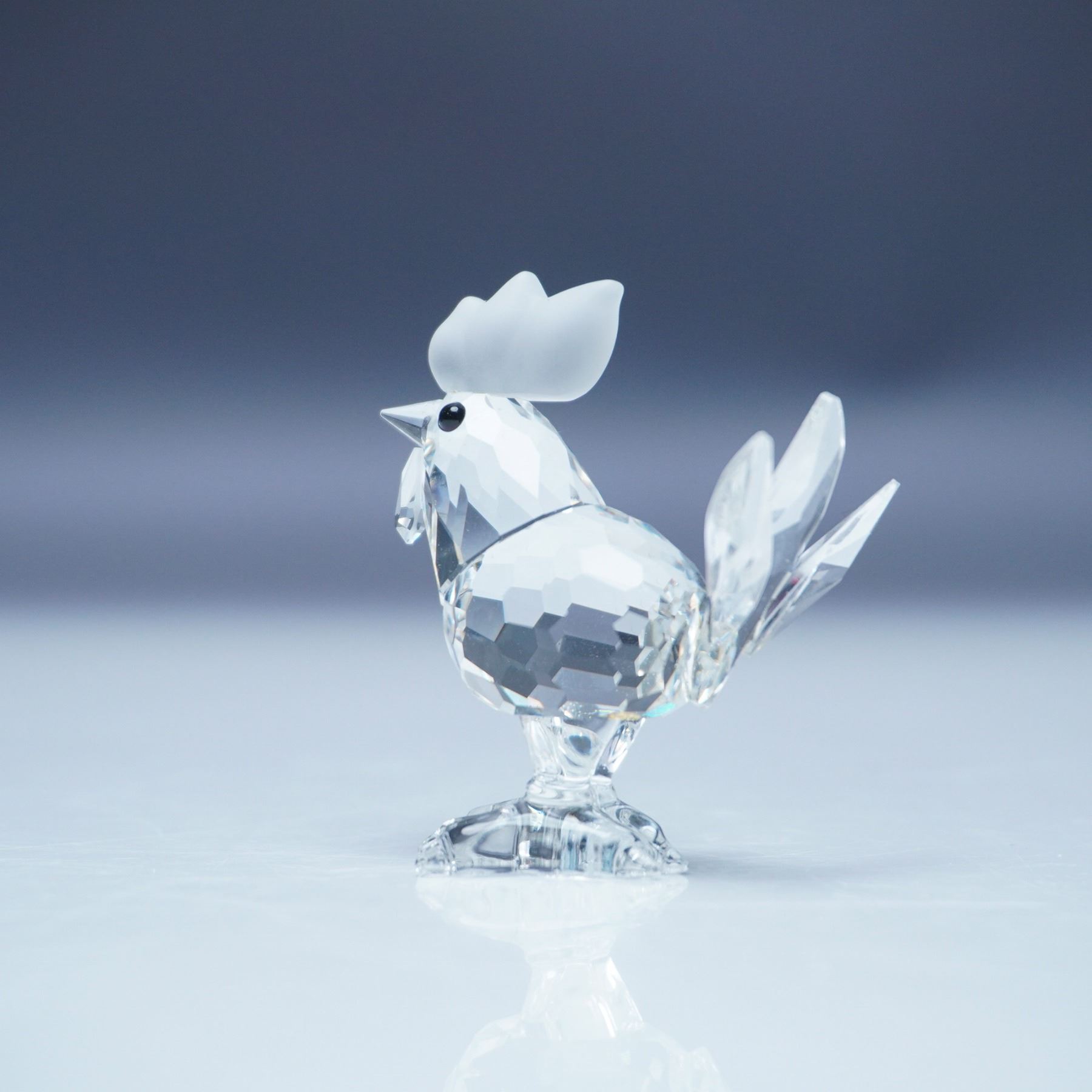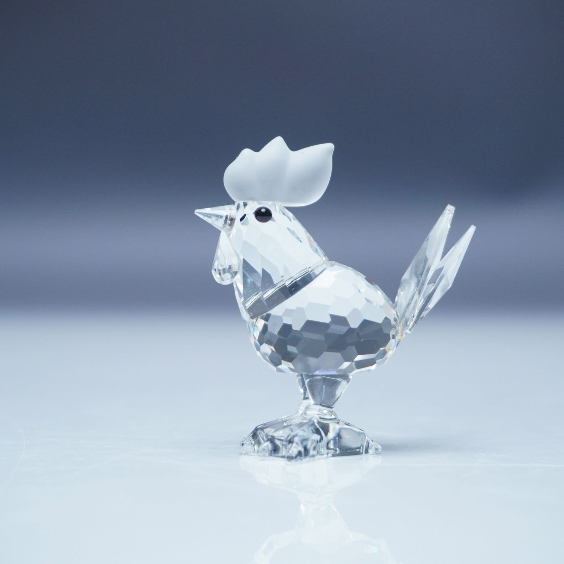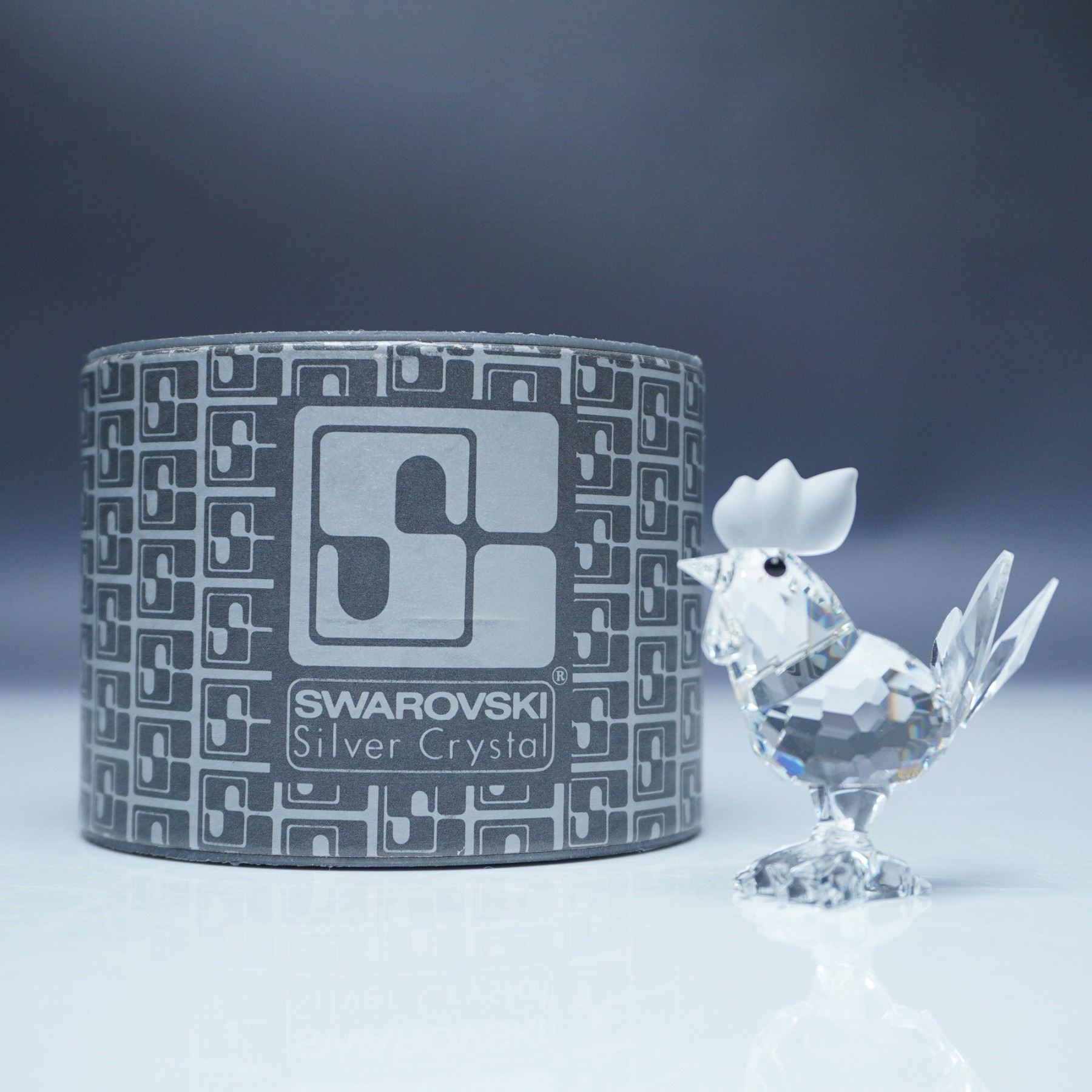 This retired Swarovski crystal figurine is part of the 'Barnyard Friends' collection. The rooster is crafted from clear faceted crystal, featuring black eyes and a frosted comb. It includes the Swarovski mark, signifying authenticity. The figurine comes with its original box. A charming addition to any Swarovski collection. 014497.
