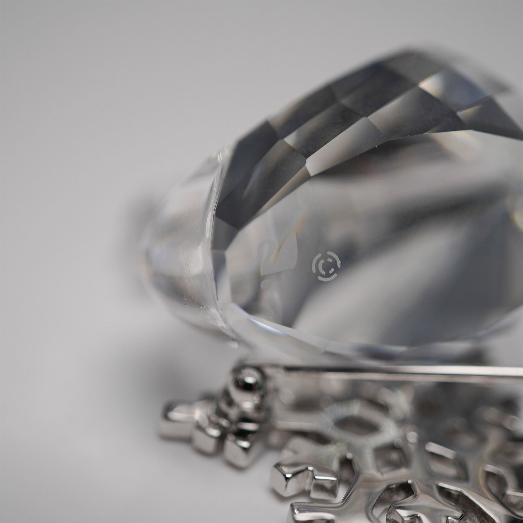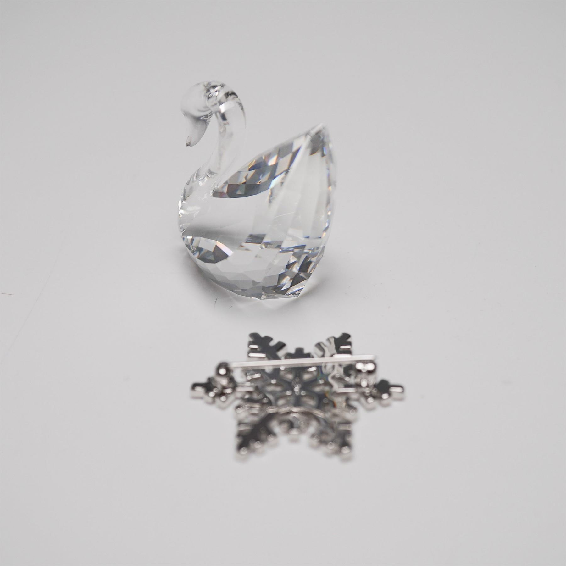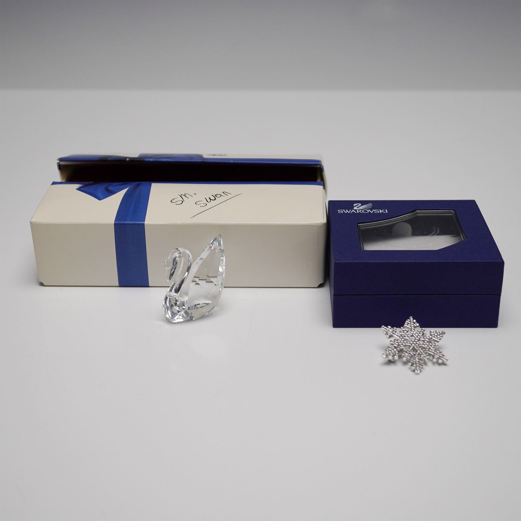 This Swarovski lot features a beautiful faceted crystal mini swan and a delicate snowflake pin. Swarovski Mini Swan: A classic symbol of the brand, this elegant swan figurine is crafted from clear faceted crystal, capturing the grace and beauty of this majestic bird. Swarovski Snowflake Pin: A sparkling, intricately designed snowflake brooch, adorned with brilliant crystals, perfect as a wearable piece or collectible accessory.