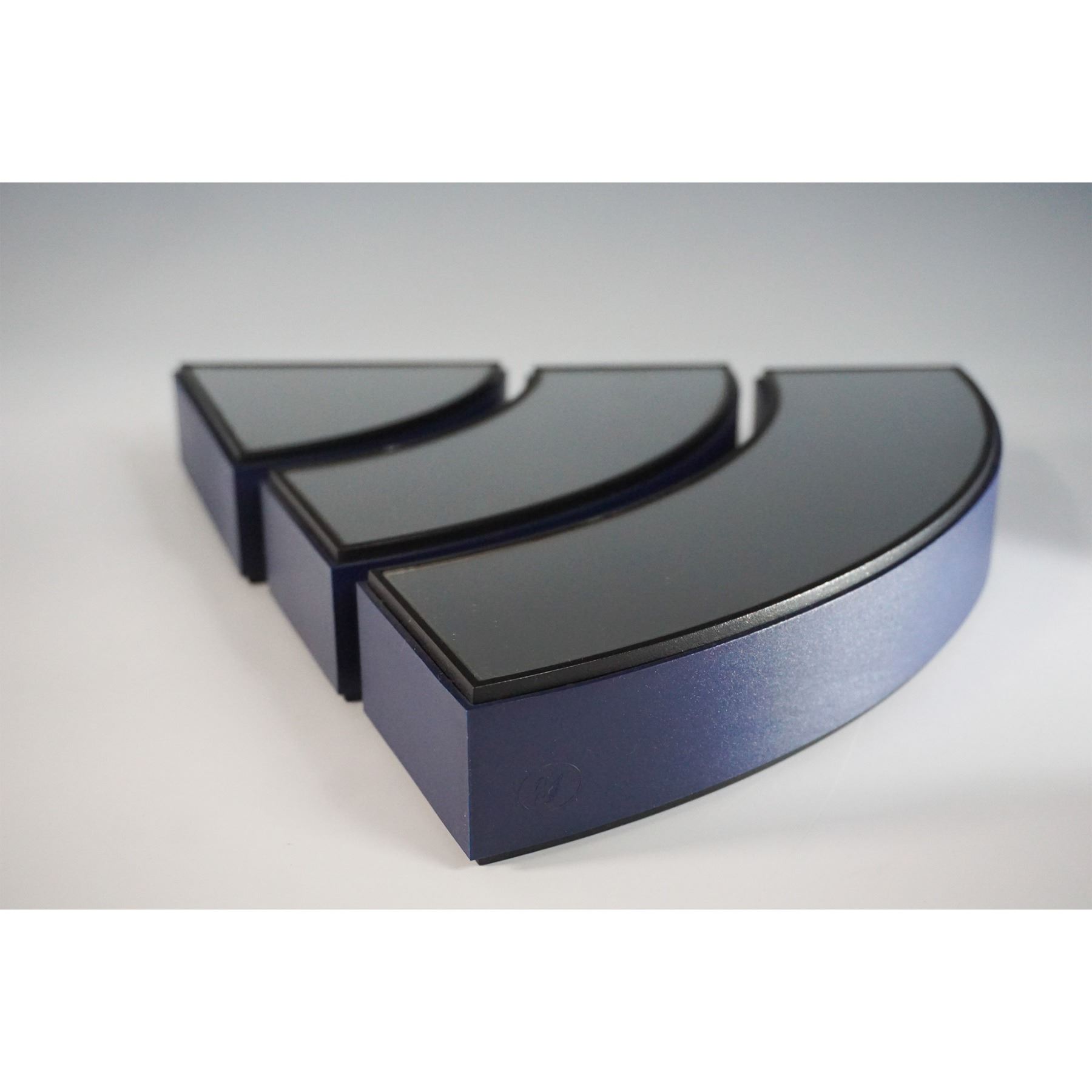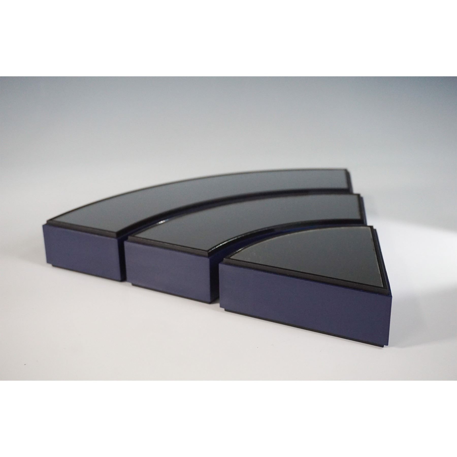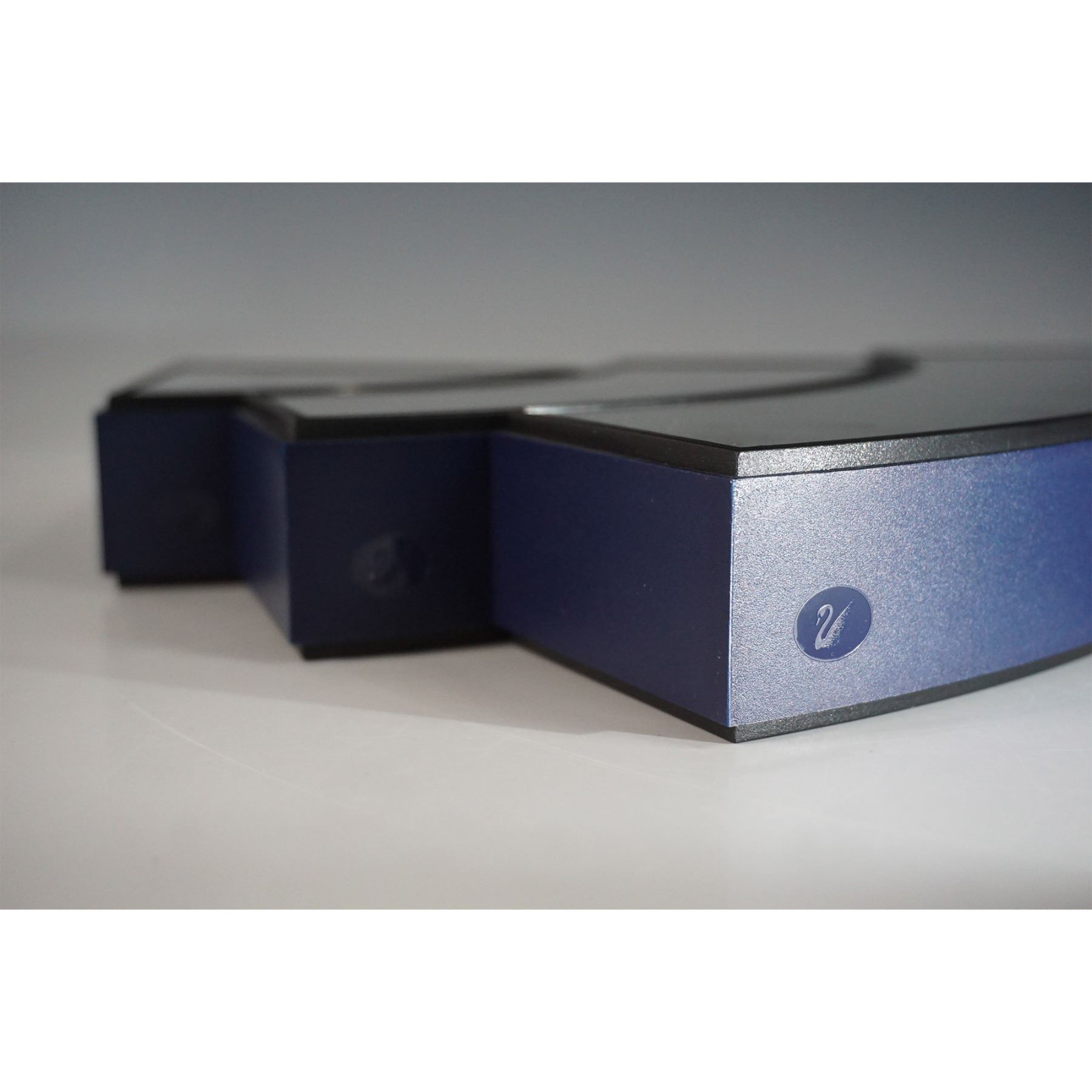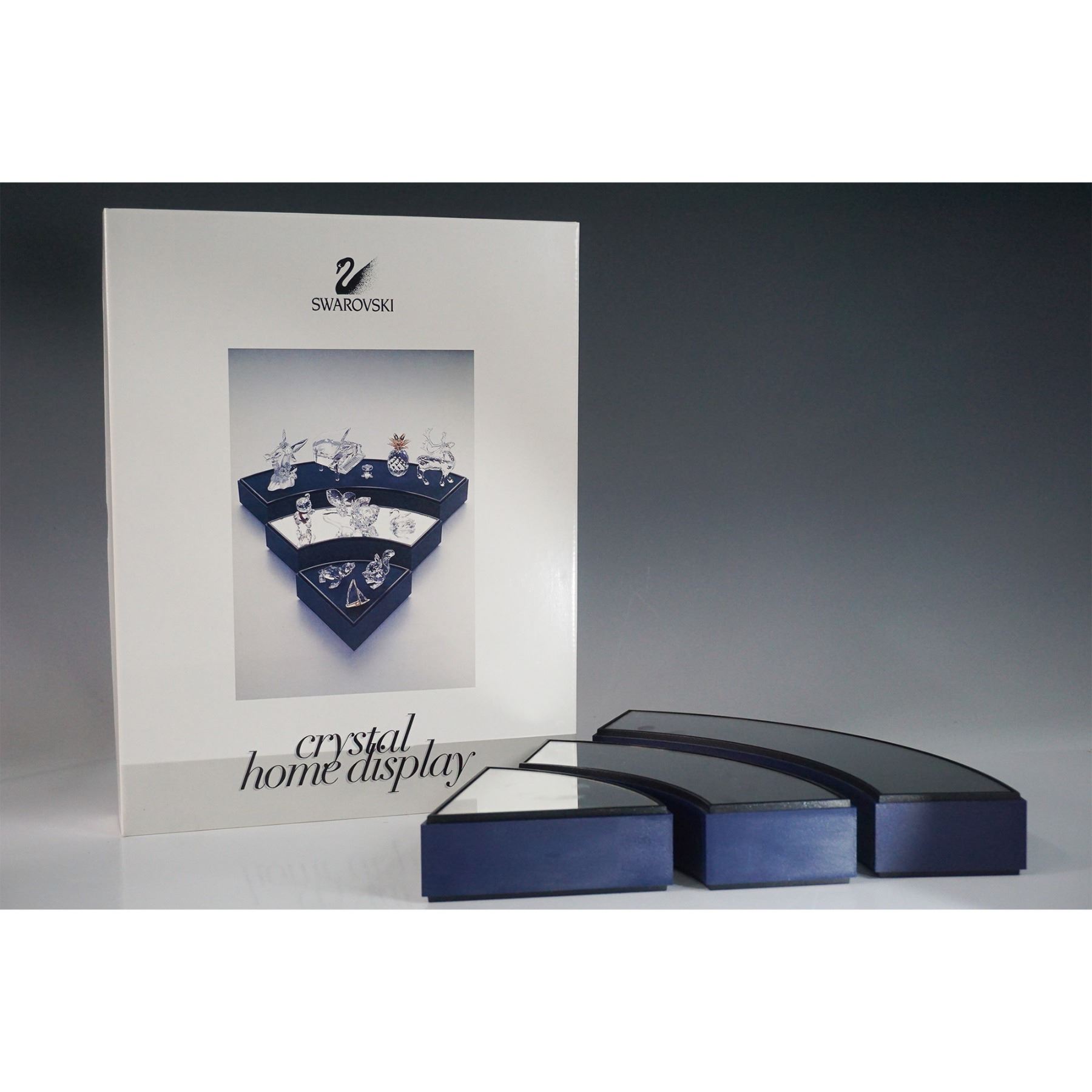 Enhance your Swarovski crystal collection with this elegant 3-piece Crystal Home Display stand. Designed to beautifully showcase figurines, this display features a sleek, curved design with a deep blue base and a black mirrored top. Measuring 13"L x 11.25"W x 2"H, it provides a modular platform for arranging multiple pieces in a visually appealing manner. Includes the original box, measuring 14.5"L x 11"W x 2"H, ensuring safe storage and transport. A sophisticated addition to any collector’s display, this stand carries the signature Swarovski swan logo, guaranteeing authenticity.