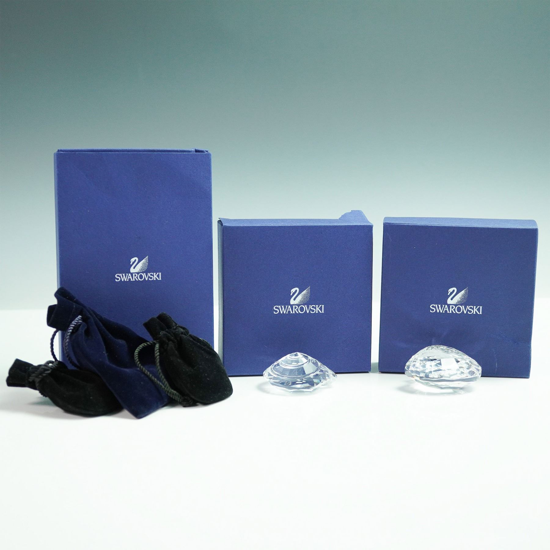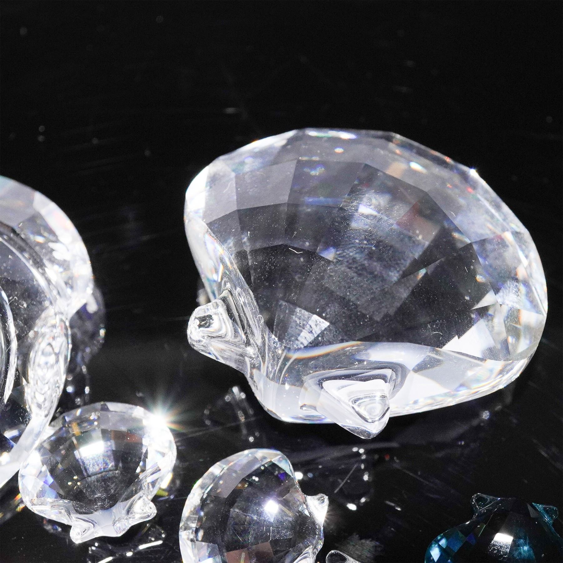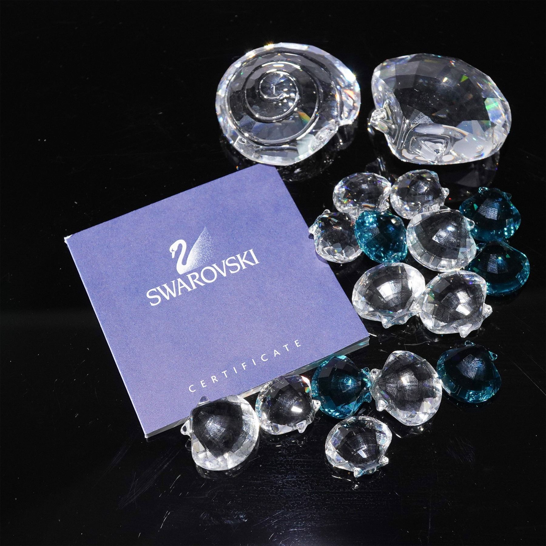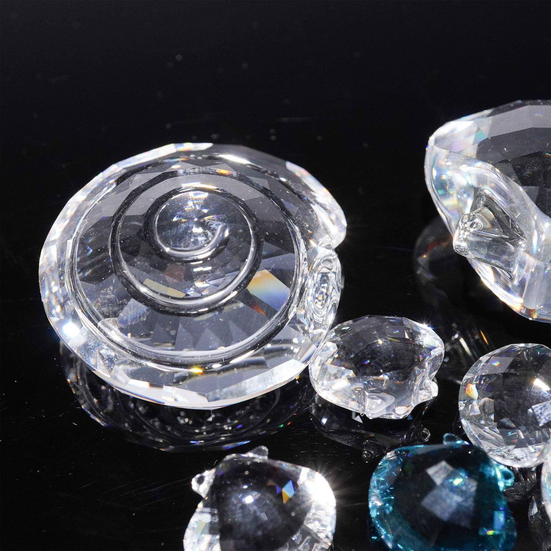 A captivating Swarovski crystal collection featuring a variety of nautical-themed pieces, including two faceted crystal shells, a crystal snail with a spiral shell, and an assortment of clear and blue faceted crystal shells. This collection showcases Swarovski's signature precision-cut crystal, offering brilliant sparkle and lifelike detail. Several pieces include hanging loops, suggesting they may be part of a chandelier or decorative set. Accompanied by original packaging, velvet pouches, and a Swarovski certificate. Largest piece 2" dia.