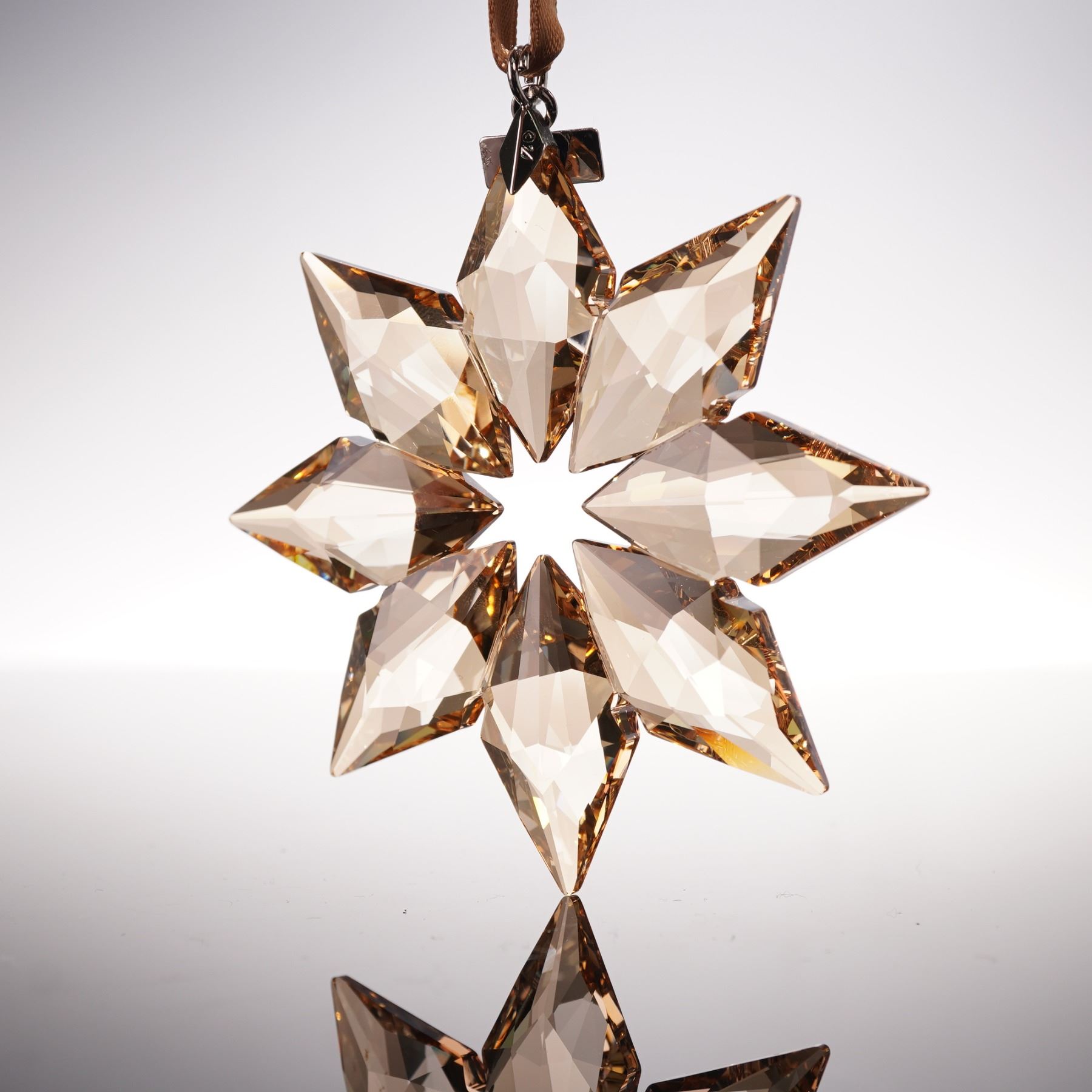 Swarovski 2013 Christmas Ornament Gold SCS 5004491 crafted in faceted golden crystal with eight point star design and hanging ribbon, features Swarovski backstamp, includes original box 5.5"H.