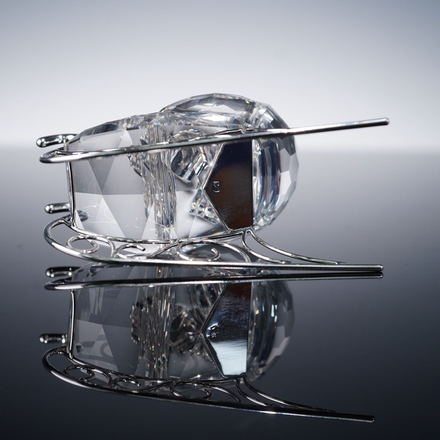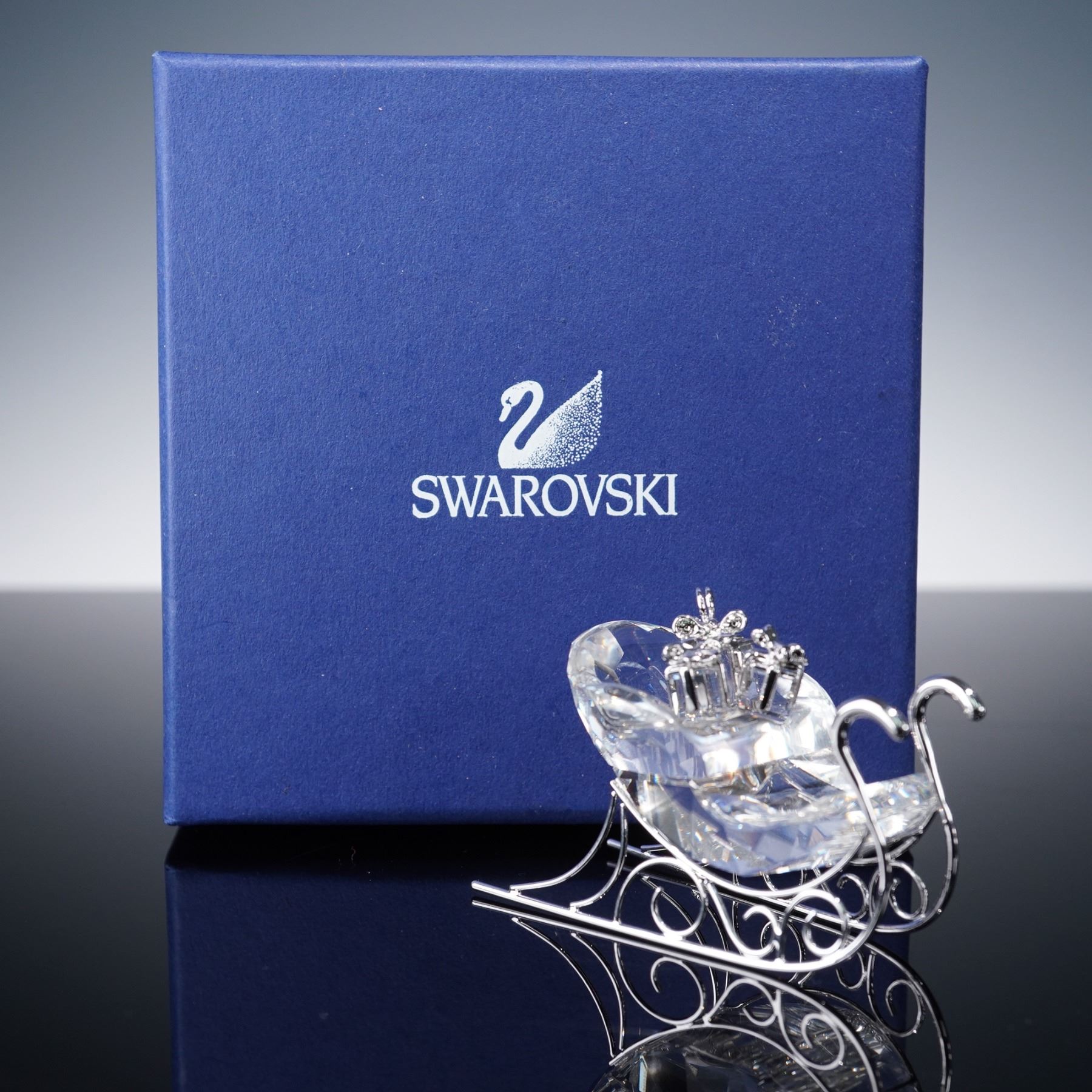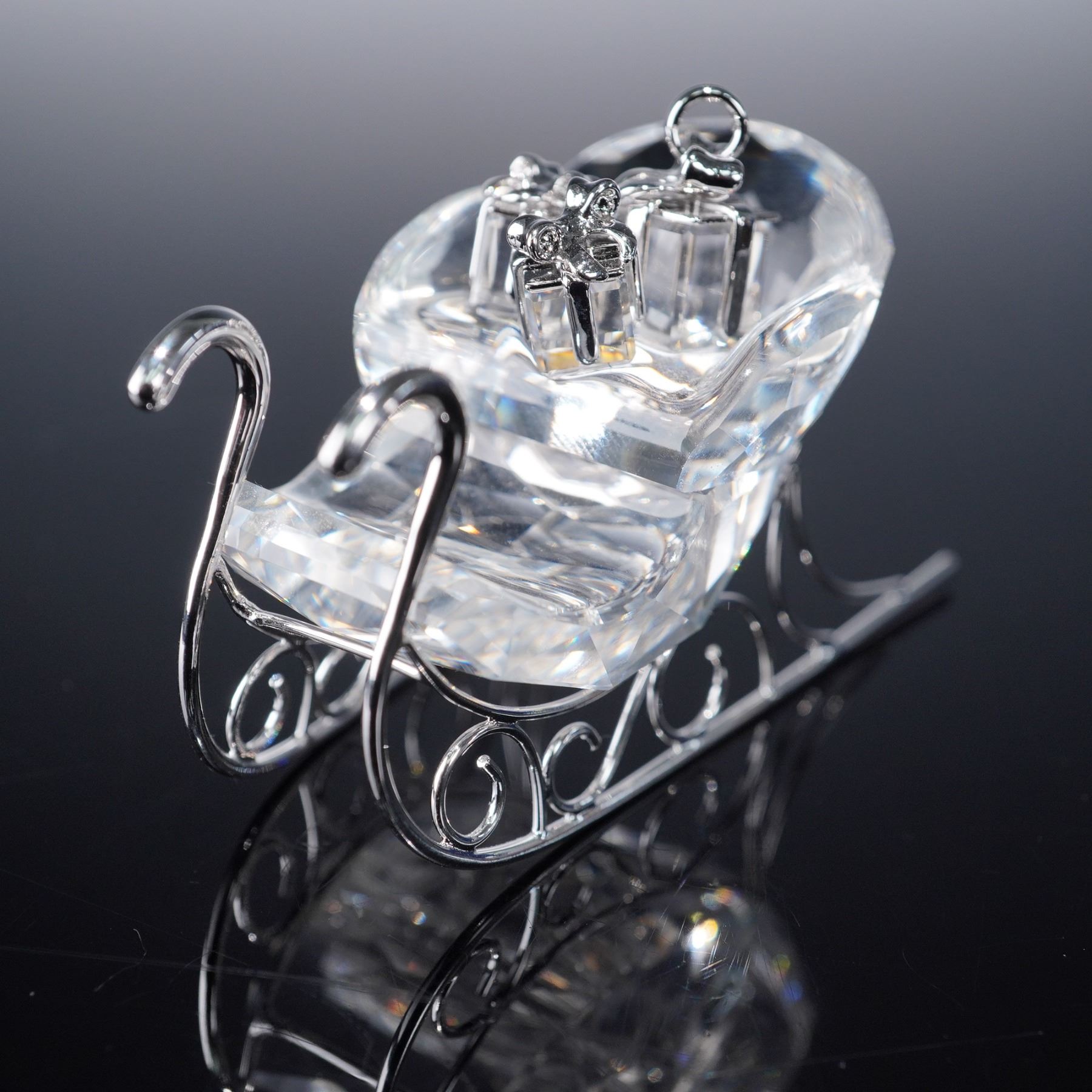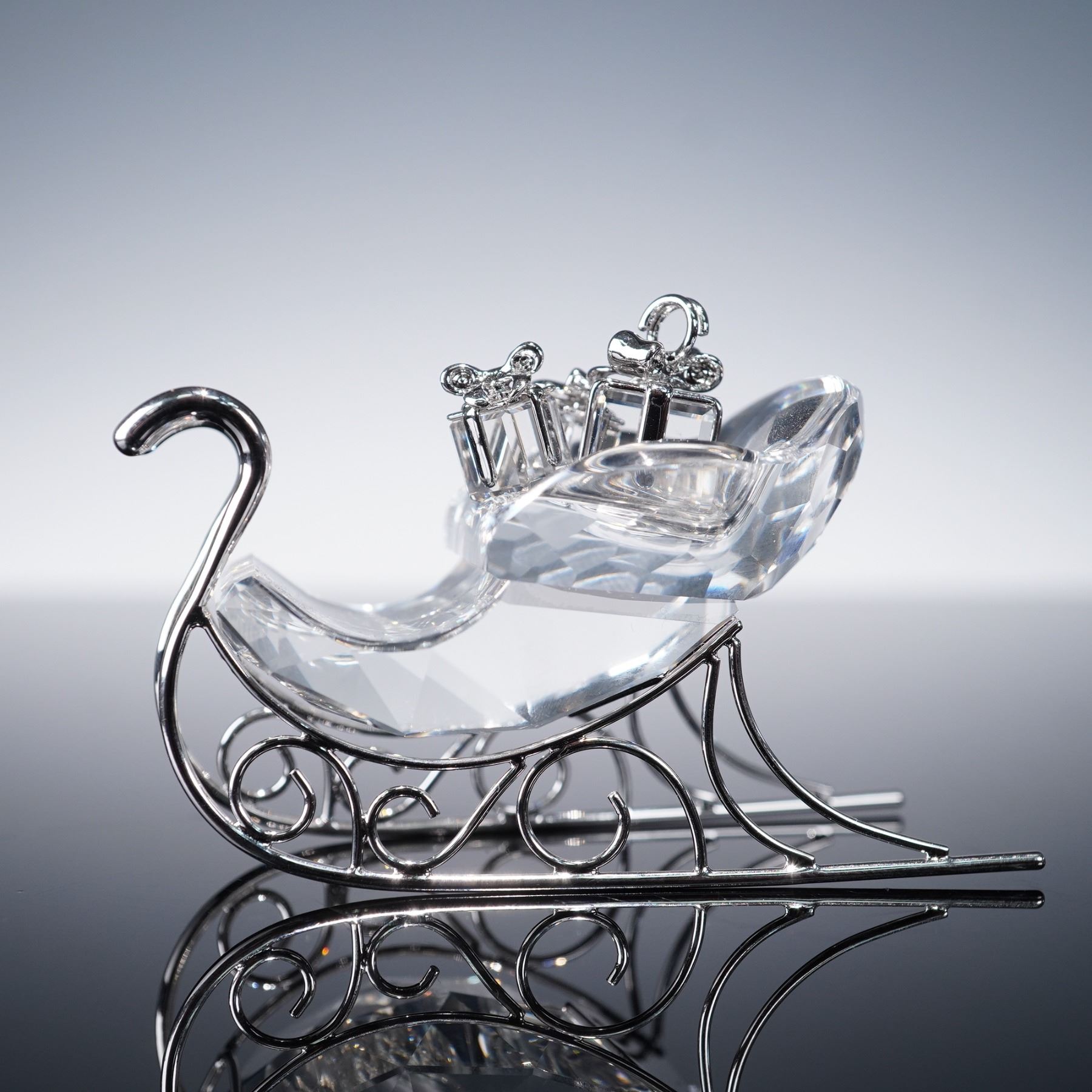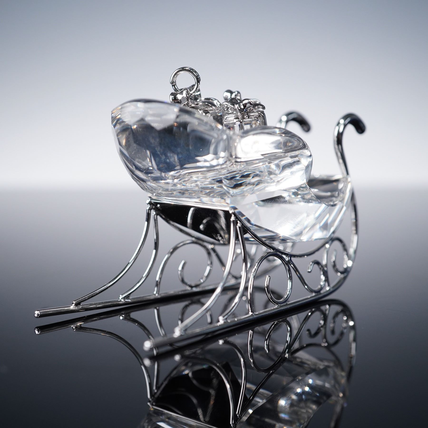A finely crafted holiday collectible featuring a clear faceted crystal sleigh with elegant silver-tone metal runners, scrolled detailing, and miniature metal gift packages adorned with bows. The ornament showcases Swarovski's signature precision cut crystal, designed to capture and reflect light brilliantly. The underside bears the Swarovski swan back stamp, attesting to its authenticity and craftsmanship. The model number is 718995. This item has its original box.
