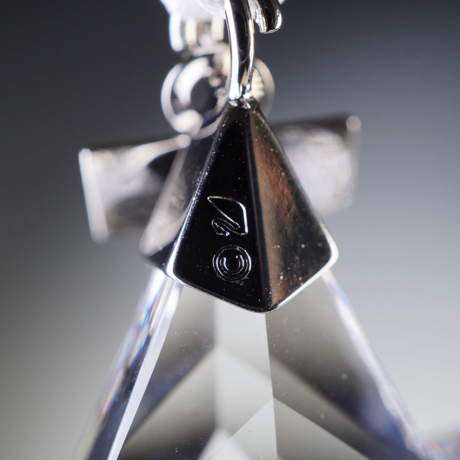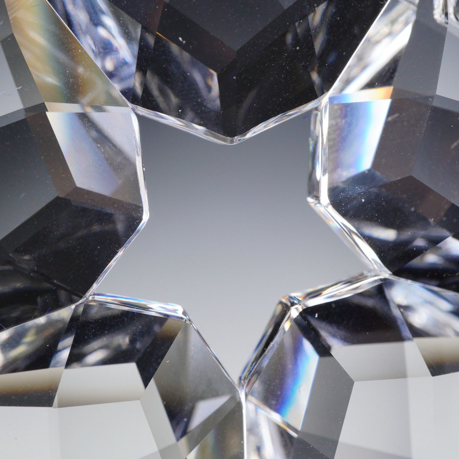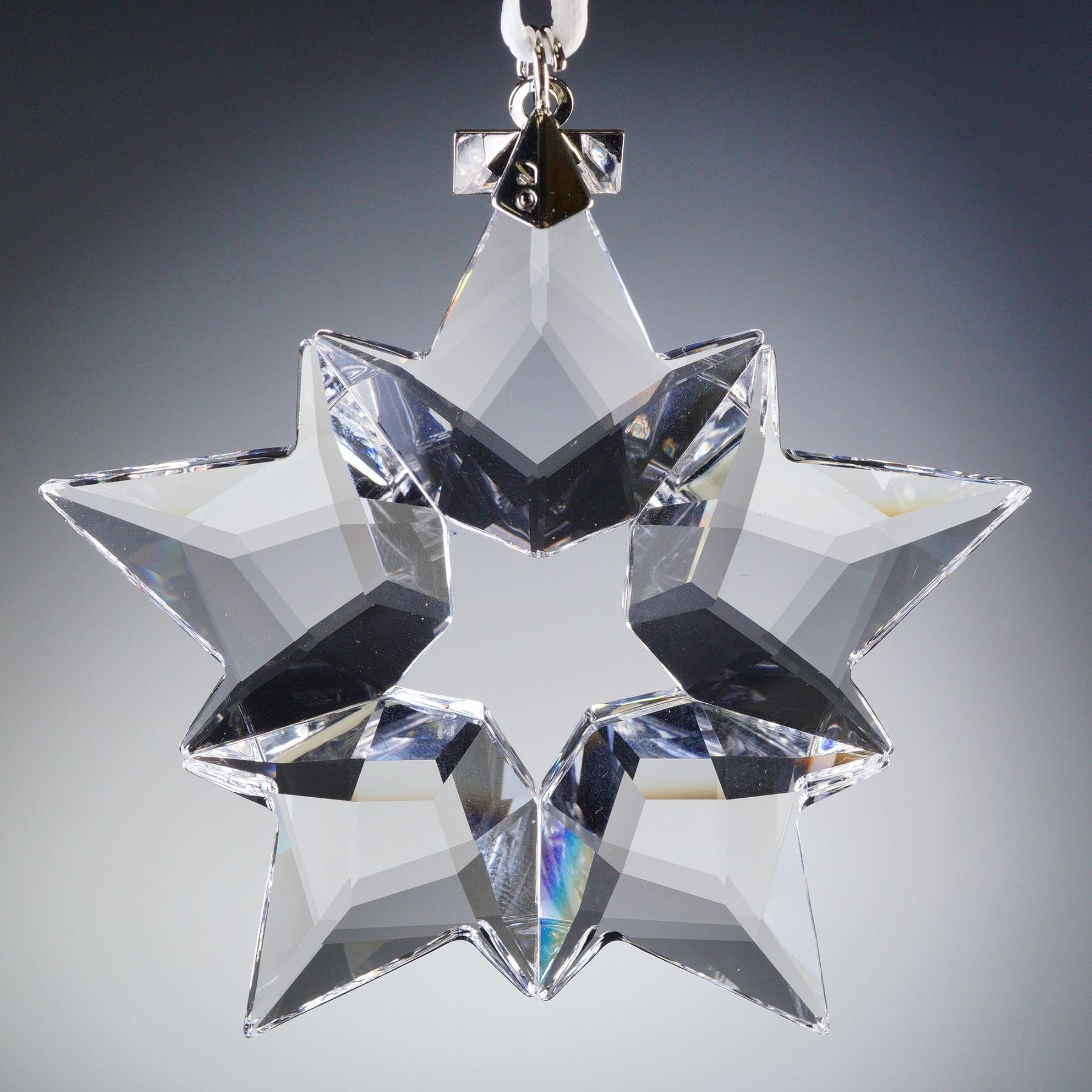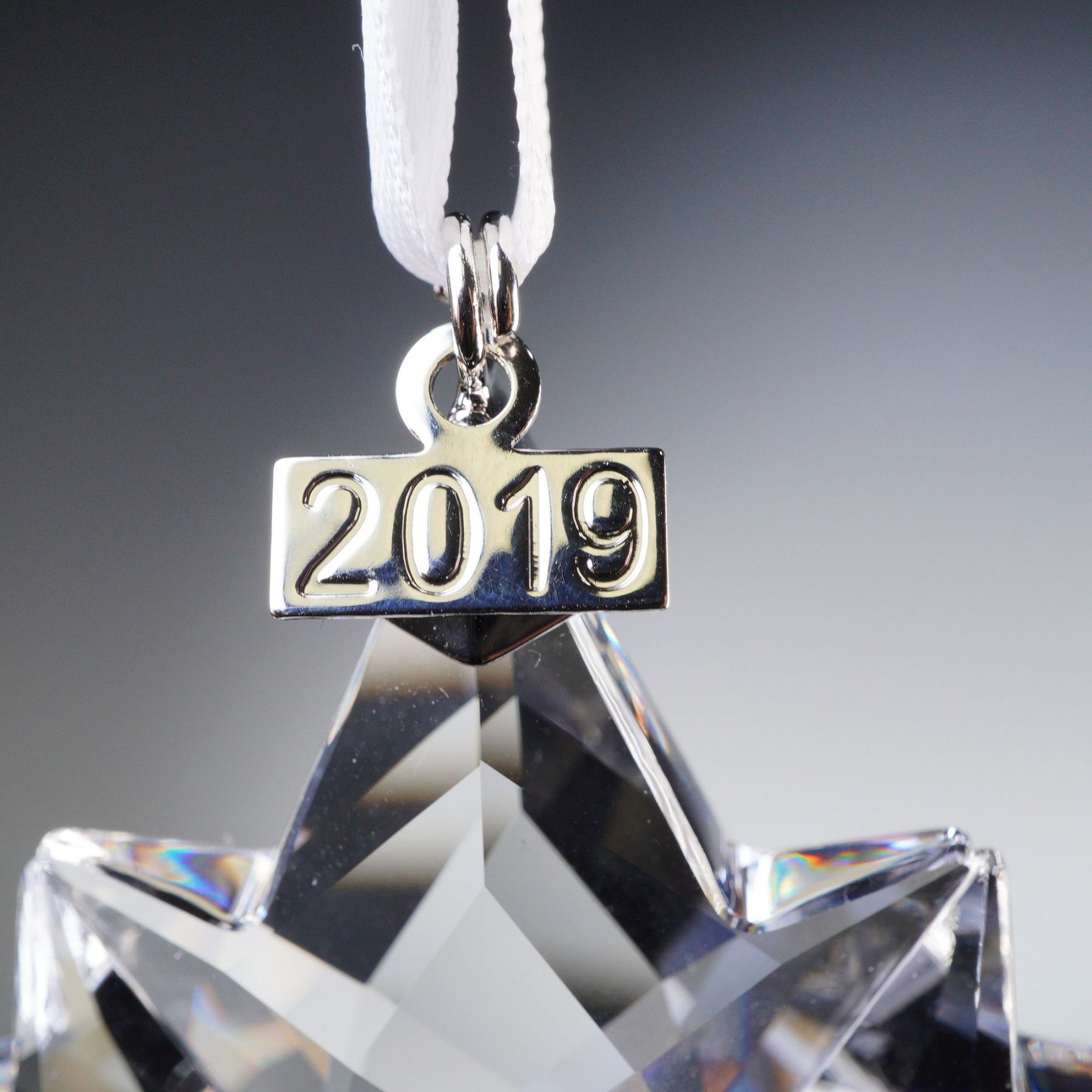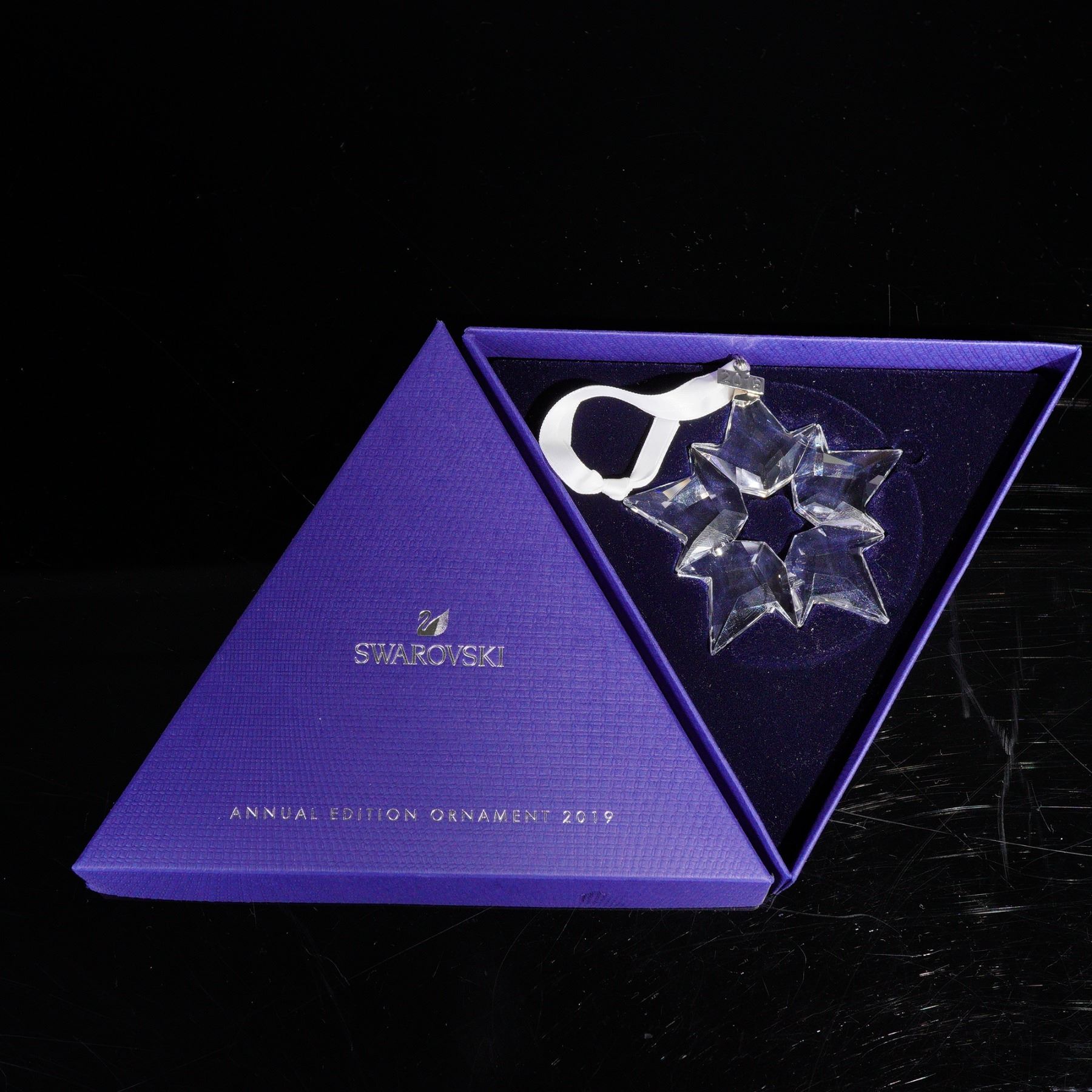 Celebrate the holiday season with timeless elegance through this Swarovski Annual Edition Ornament from 2019. Expertly crafted from precision-cut clear crystal, this dazzling snowflake-inspired star radiates light from every angle, creating a stunning display of brilliance and refraction. It hangs gracefully from a white satin ribbon and features a polished metal tag engraved with the year 2019, marking it as part of Swarovski's beloved annual series. Perfect for collectors and admirers of fine craftsmanship, this ornament embodies the refined artistry and holiday tradition for which Swarovski is renowned. Presented in its signature triangular blue box with velvet interior, it is ideal for gifting or display. A beautiful piece that captures the sparkle and spirit of the season.