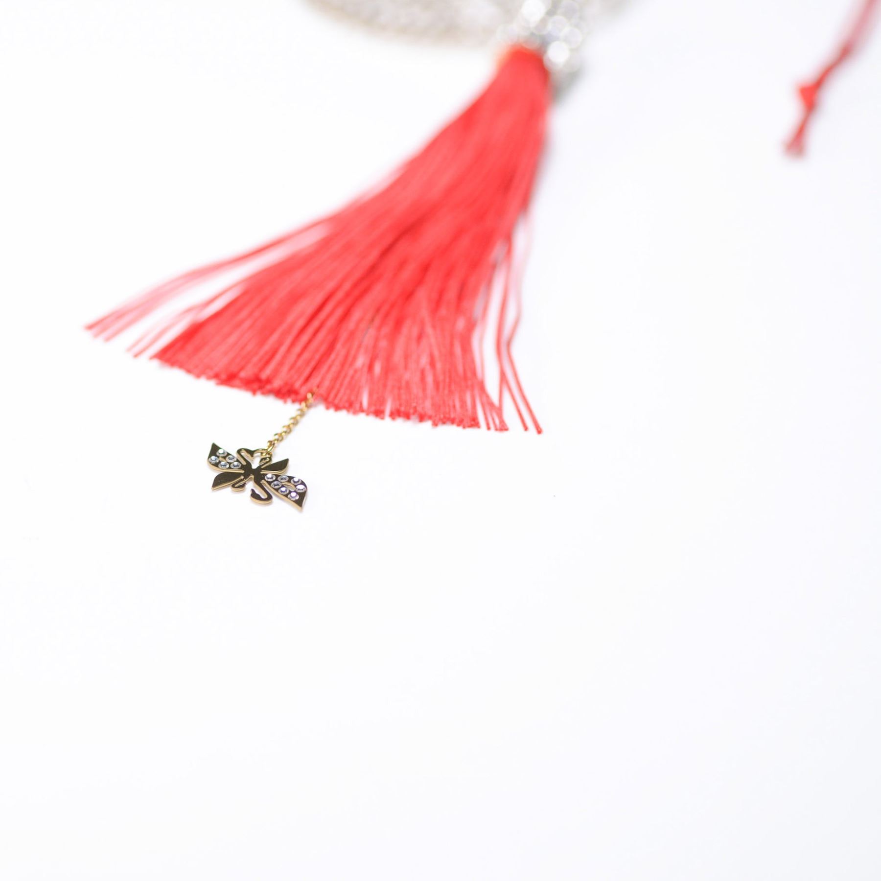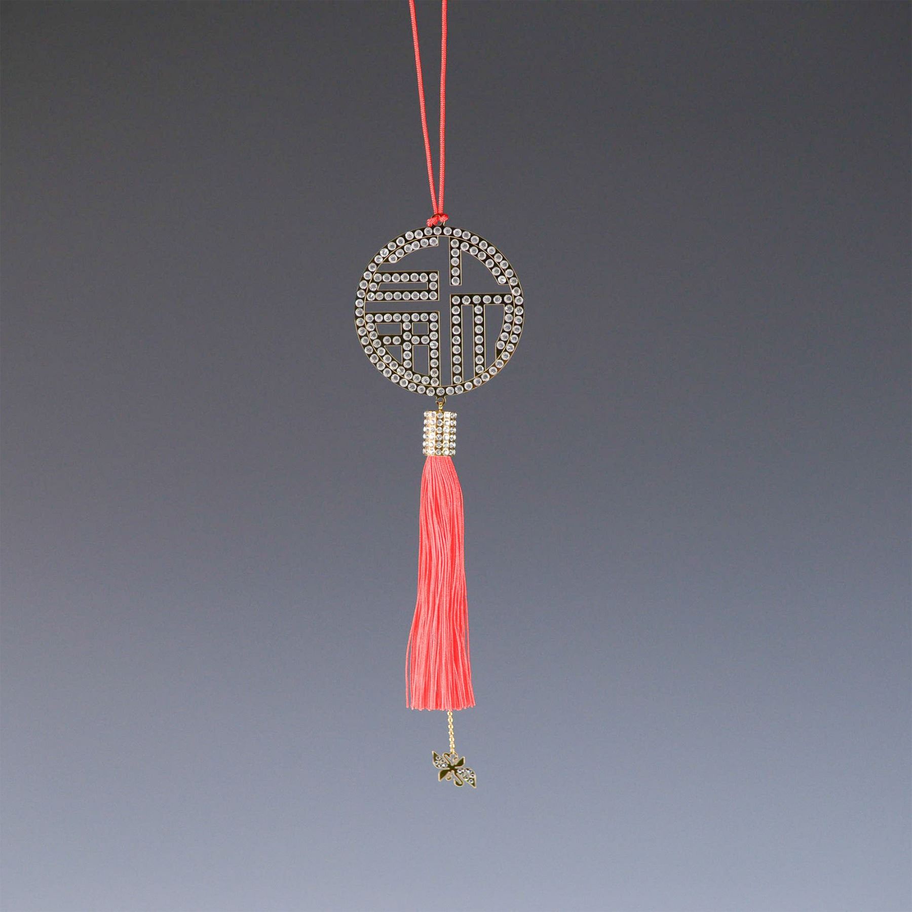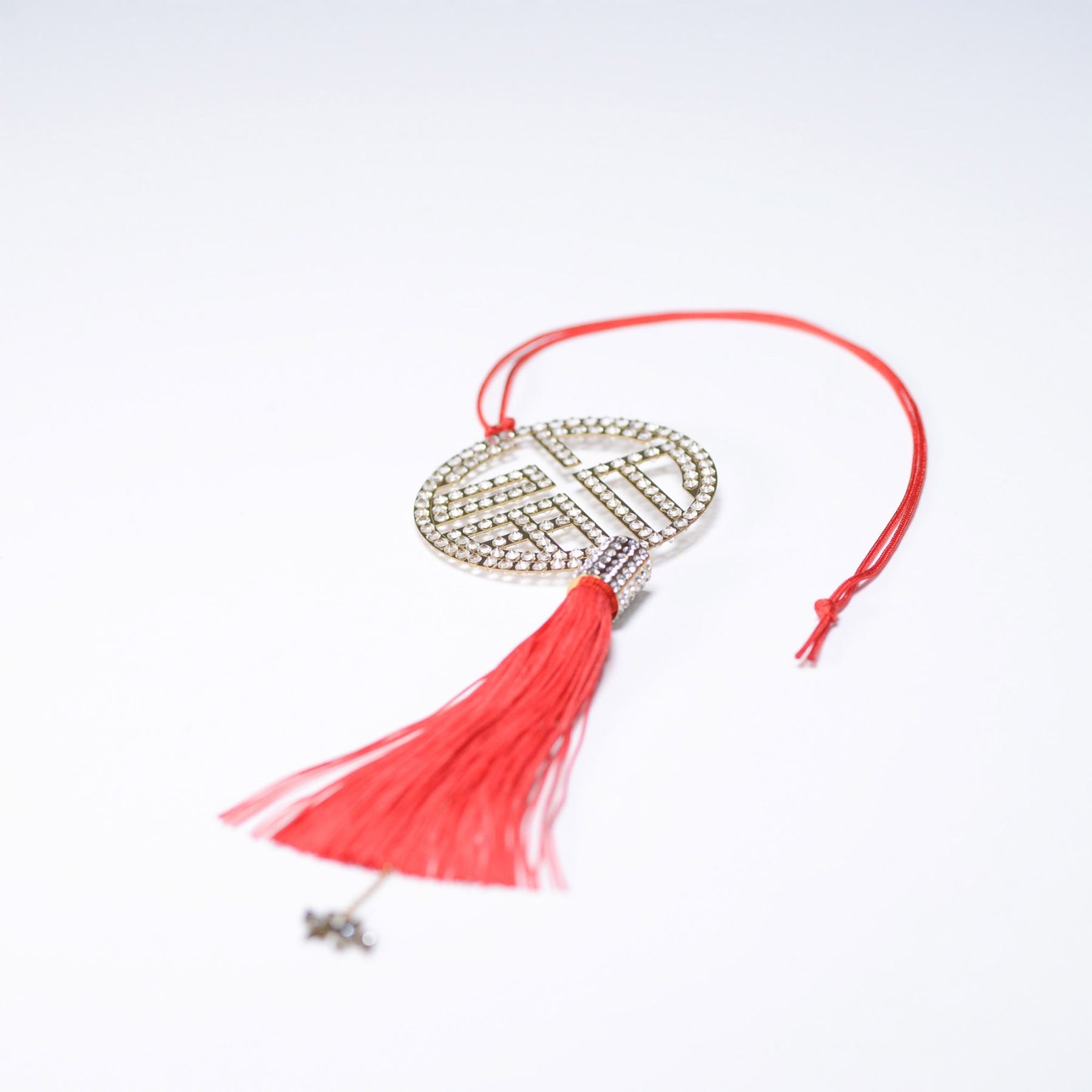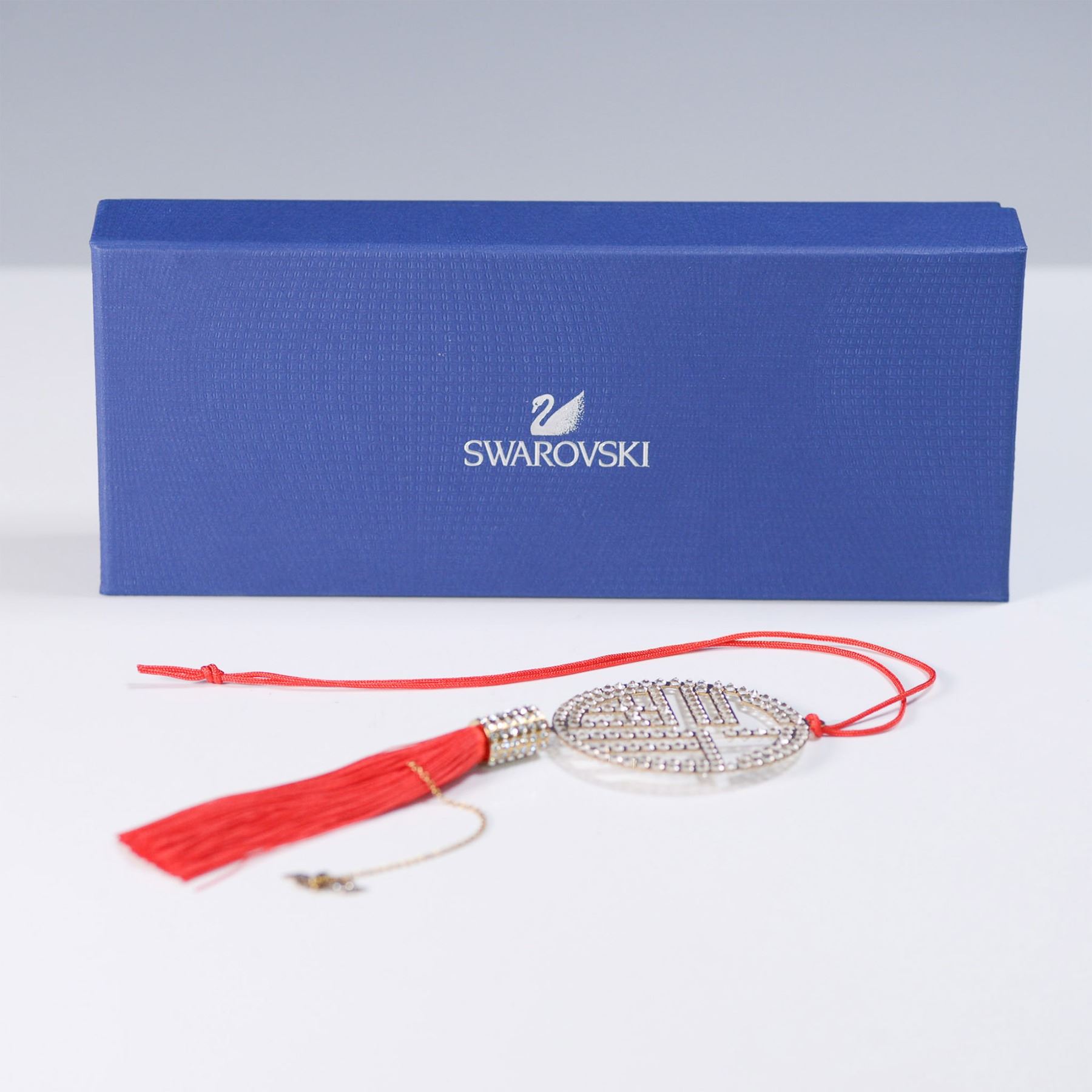 The Swarovski Fu Ornament showcases the Chinese symbol for good fortune, crafted in a gold-tone frame and embellished with sparkling clear crystals. Hanging from a red silk cord with a luxurious tassel and an intricate charm, this elegant piece symbolizes prosperity and happiness. Measuring approximately 7"H, it serves as a stunning decorative accent with deep cultural significance. It comes in a 9"L x 4"W x 1.75"H box. Swarovski acid mark present.