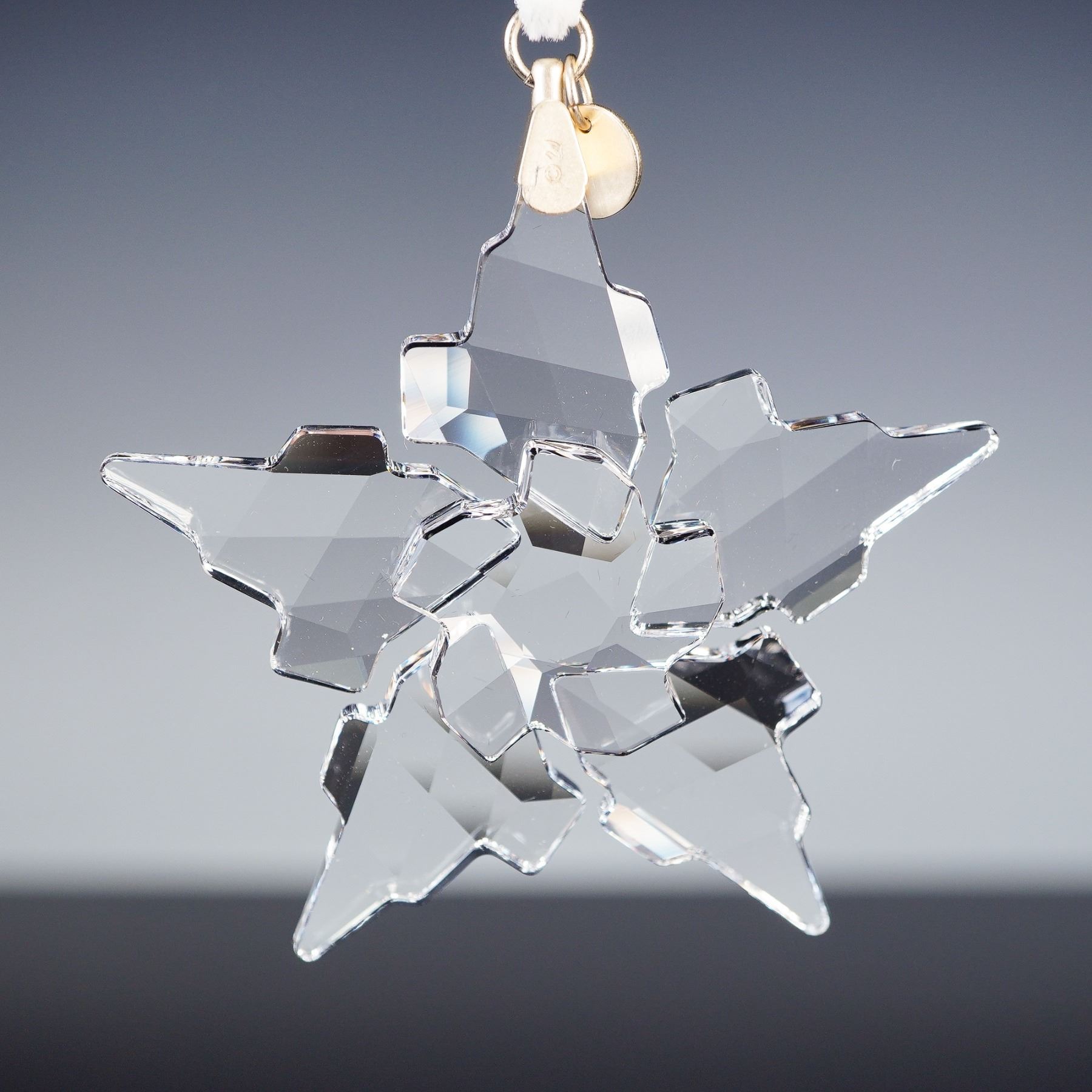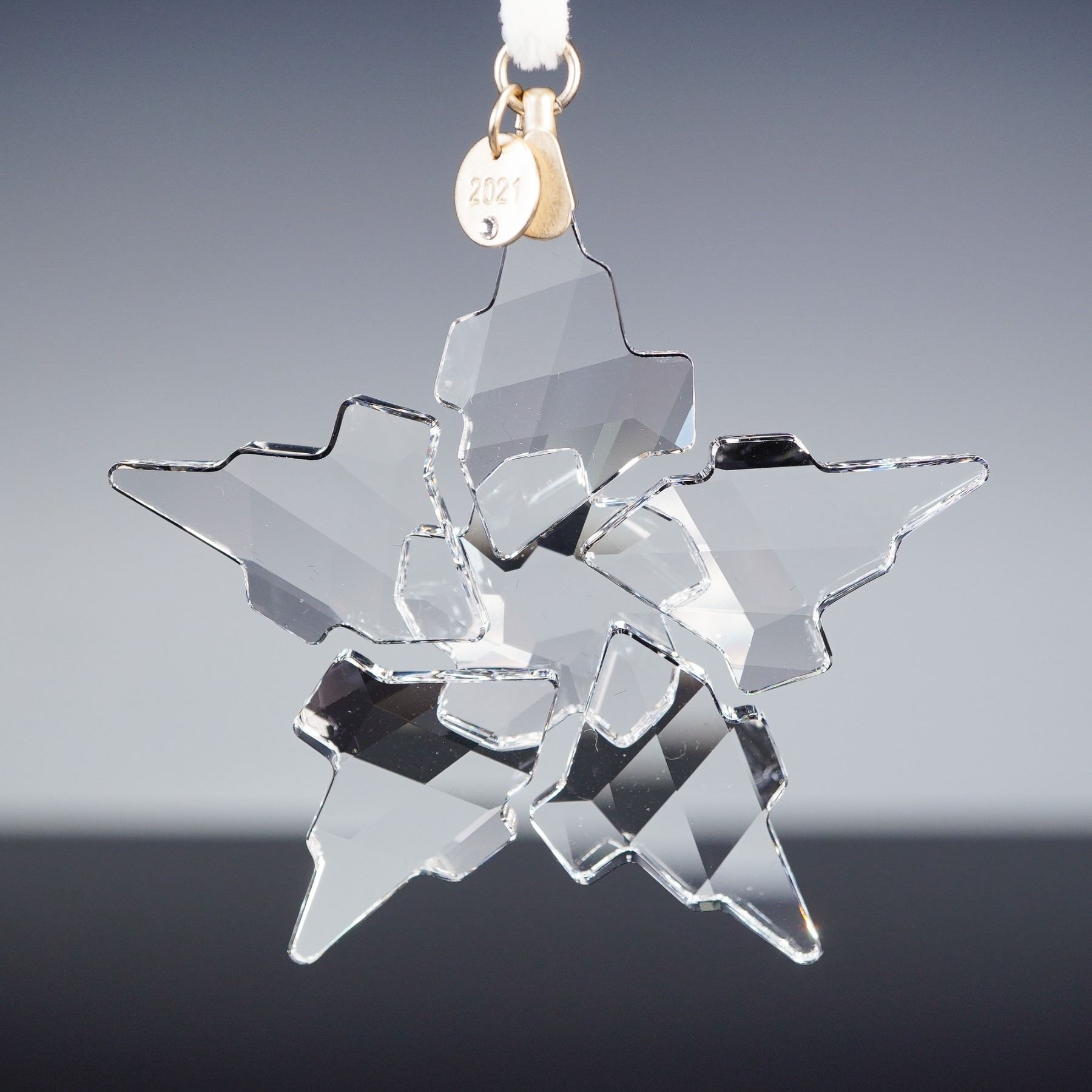 A Swarovski crystal snowflake ornament from the 2021 Annual Edition, finely cut with multiple faceted points to catch the light. The ornament is suspended from a white ribbon with a gold-tone tag dated 2021. Housed in the original triangular Swarovski box marked Annual Edition Ornament 2021. Measures 3"H. Box measures 6.5"L x 6.5"H.
