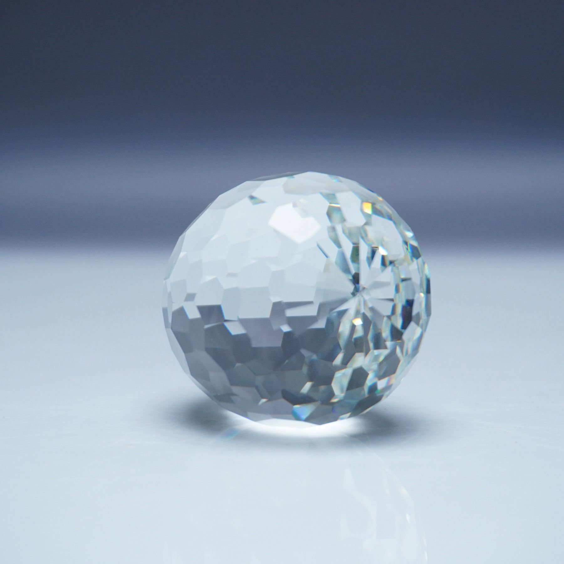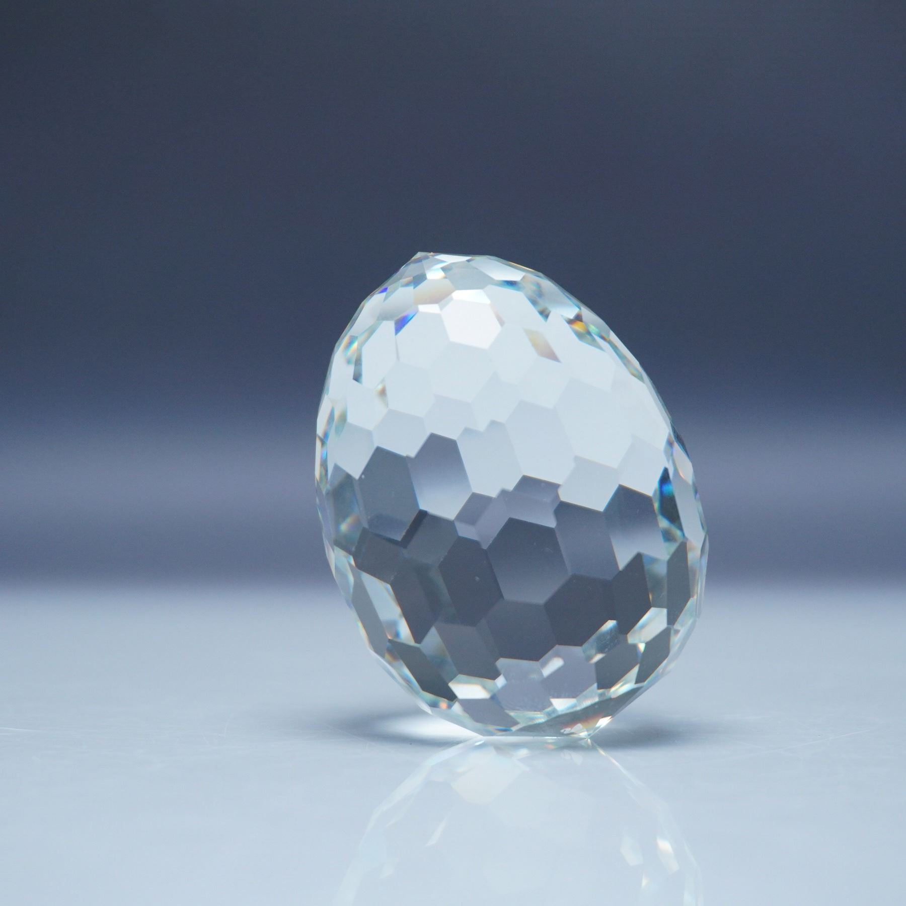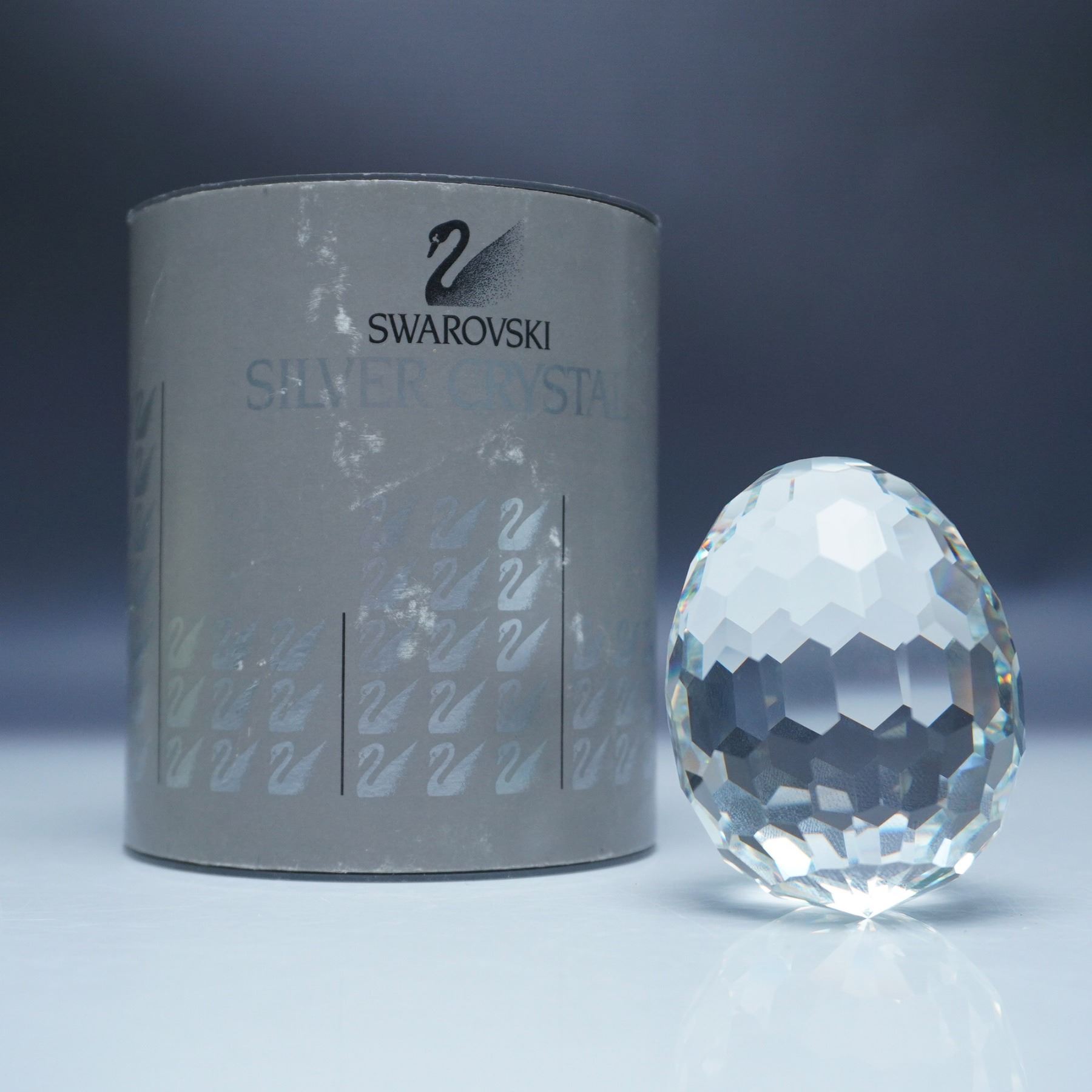 This Swarovski crystal egg paperweight belonged to the 'Decorative Items for the Desk' category. Crafted from faceted clear crystal, it features a smooth, symmetrical egg shape with no flat base, allowing light to refract beautifully through its surface. This elegant design reflects Swarovski's signature precision-cut craftsmanship. Includes its original box and bears the Swarovski mark. 010055.