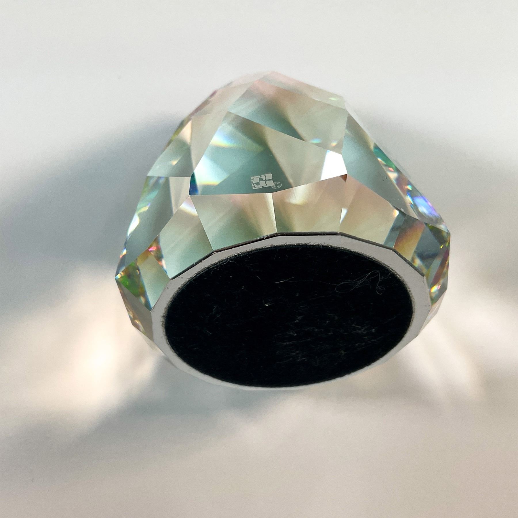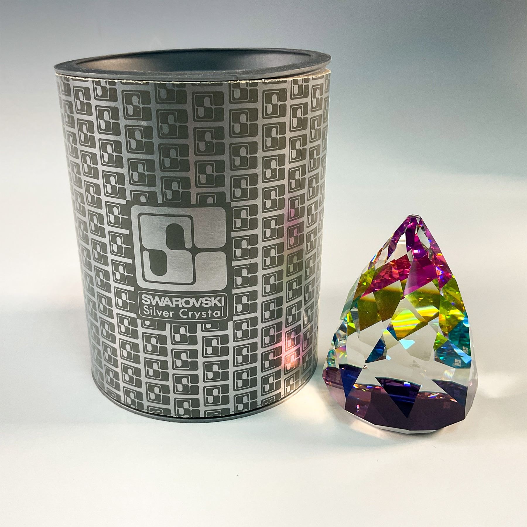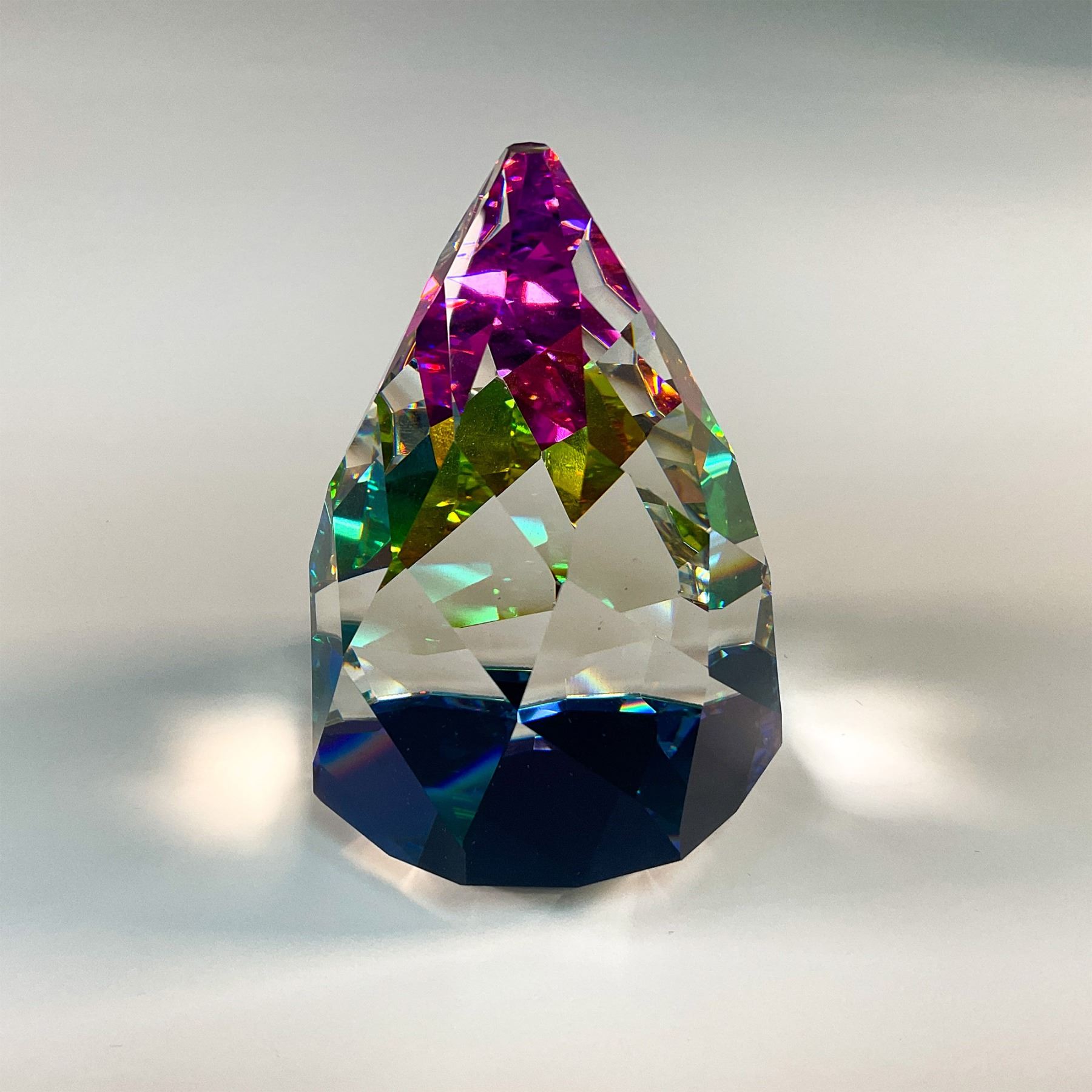 Part of the Decorative Items for the Desk theme group. This Swarovski crystal paperweight, known as the Rio Cone, dazzles with its vibrant rainbow effect. Featuring a stunning faceted design, this collectible showcases Swarovski's signature precision craftsmanship and brilliance. The dynamic play of colors reflects light beautifully, making it a captivating centerpiece or a functional desk accessory. Swarovski Square Silver Crystal SC mark. 7452 060 000. This item has its original box.