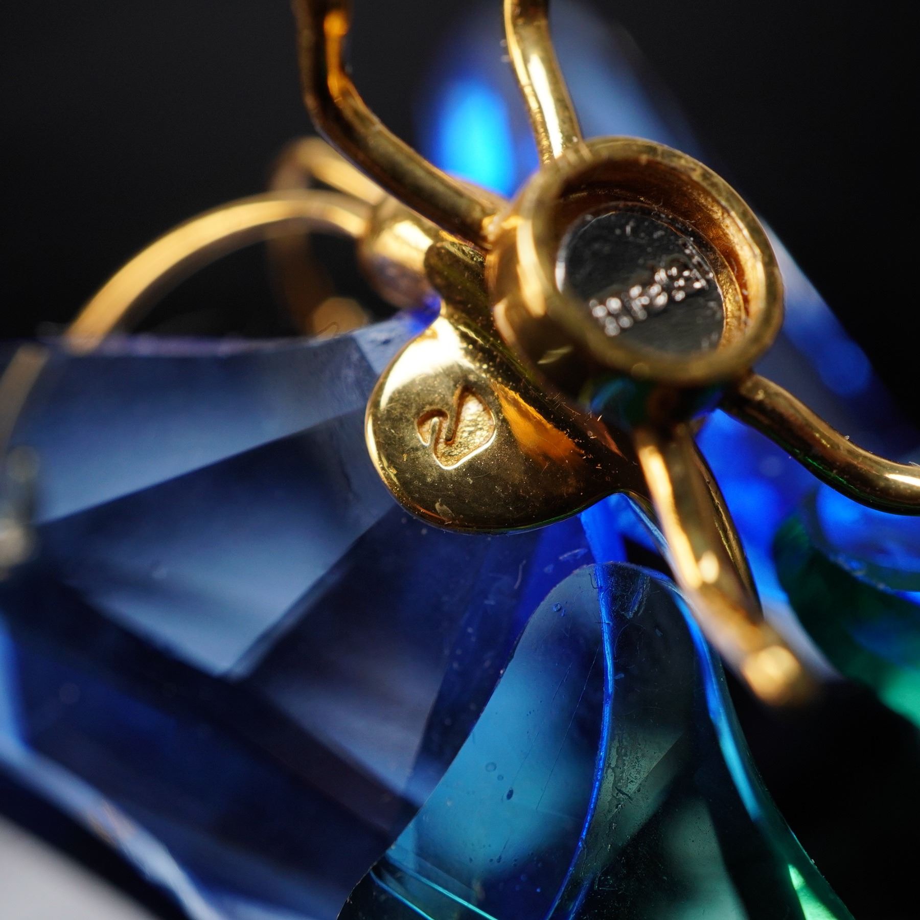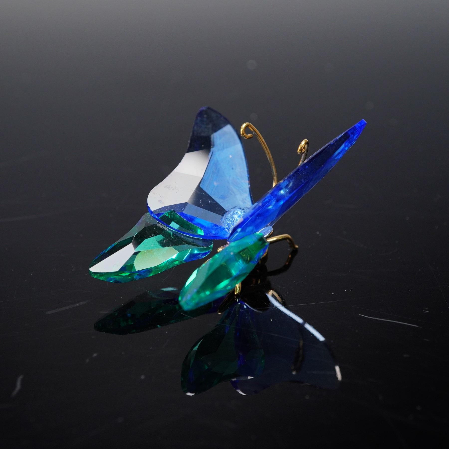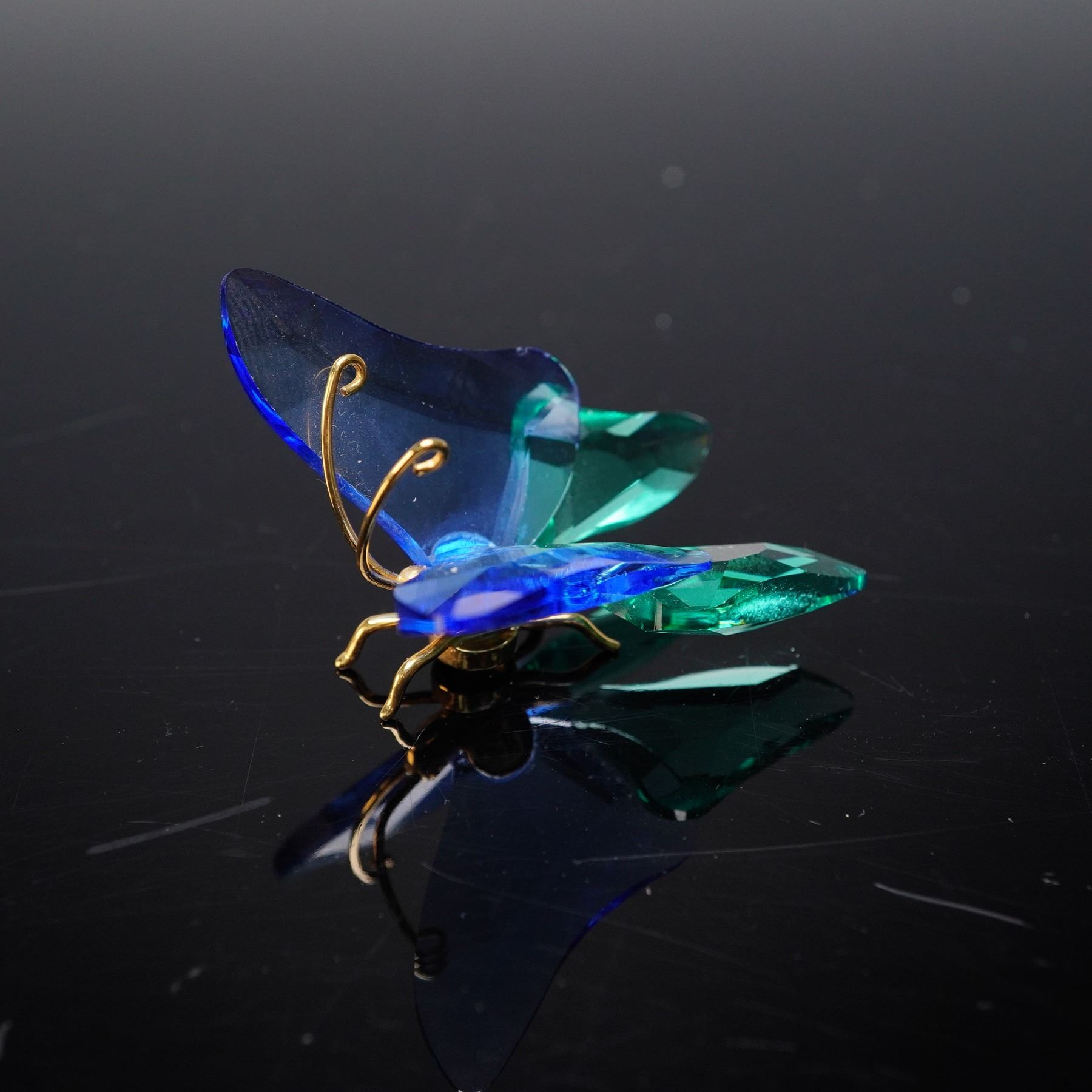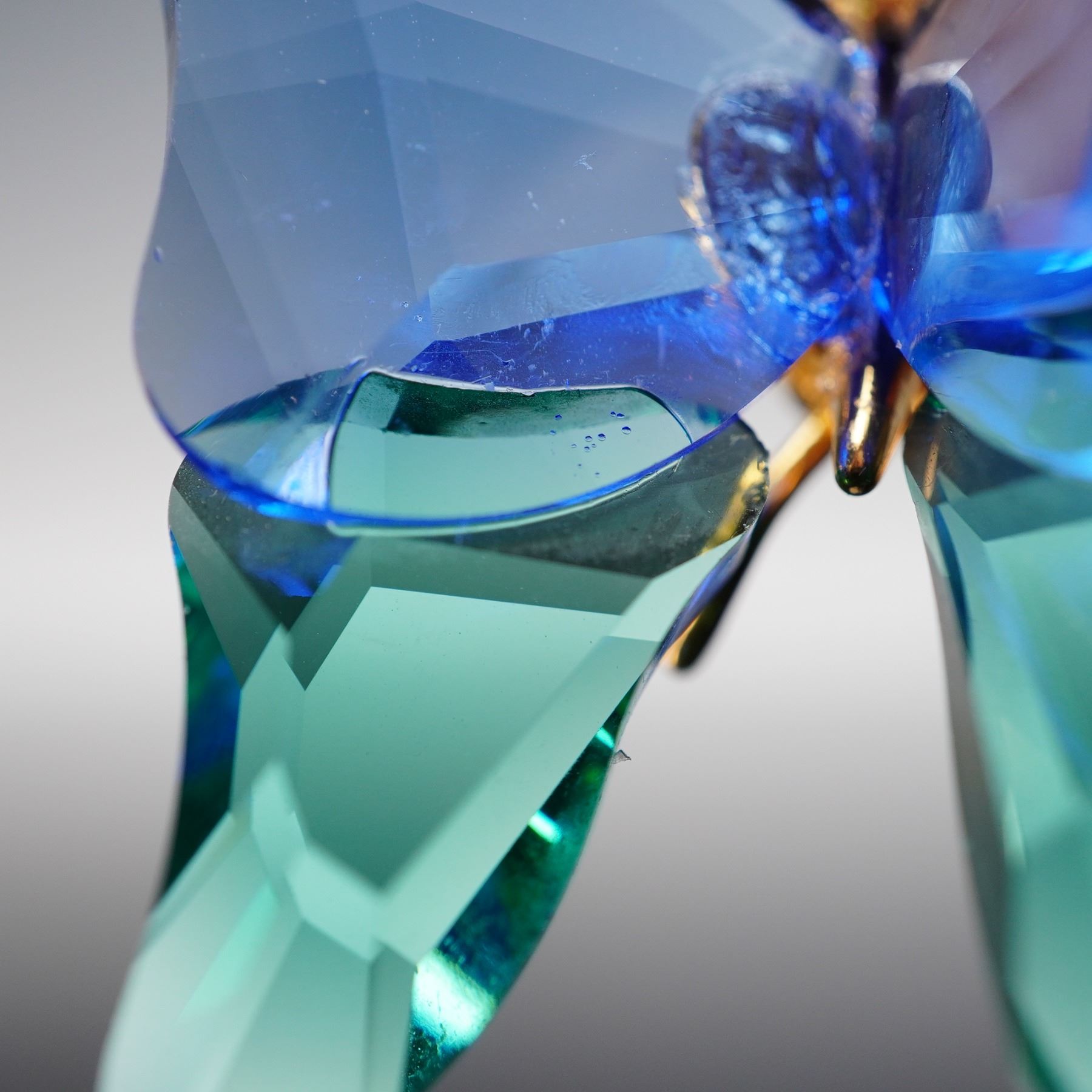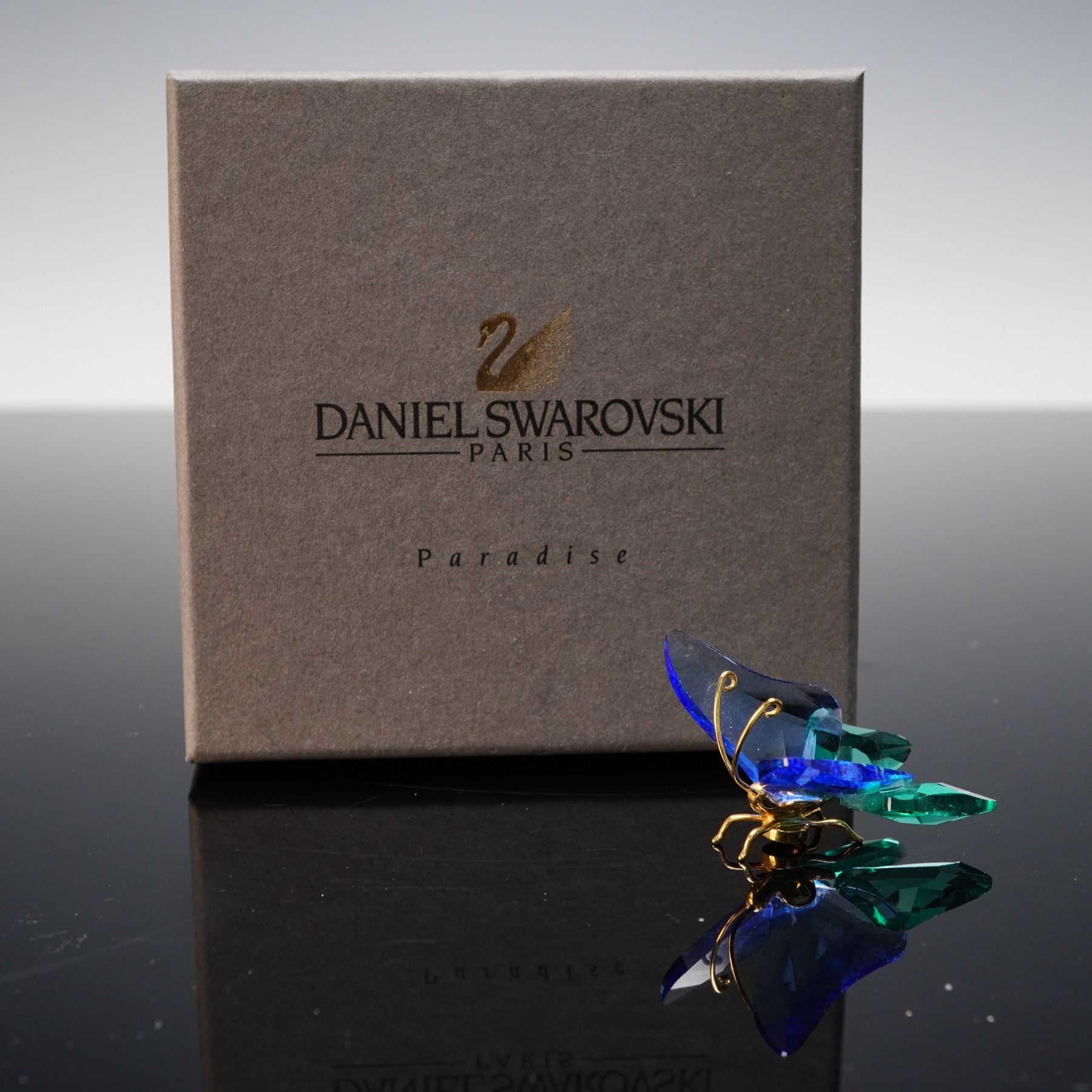 A vibrant crystal butterfly from the Paradise Bugs collection, featuring faceted sapphire blue and emerald green wings with gilt metal legs and antennae. Includes original Daniel Swarovski Paris Paradise box. Swarovski and 925 backstamp, numbered 250462.