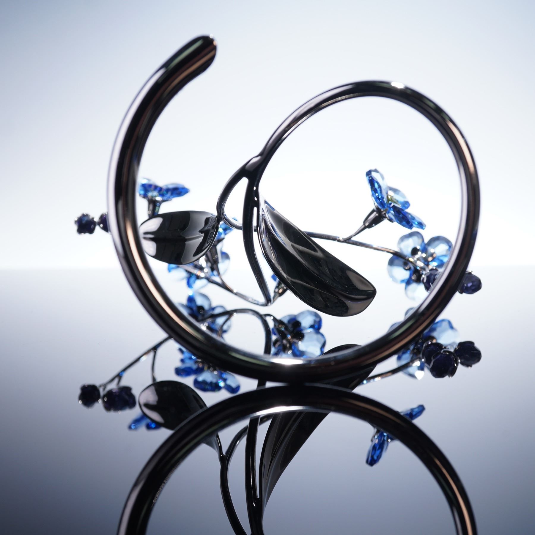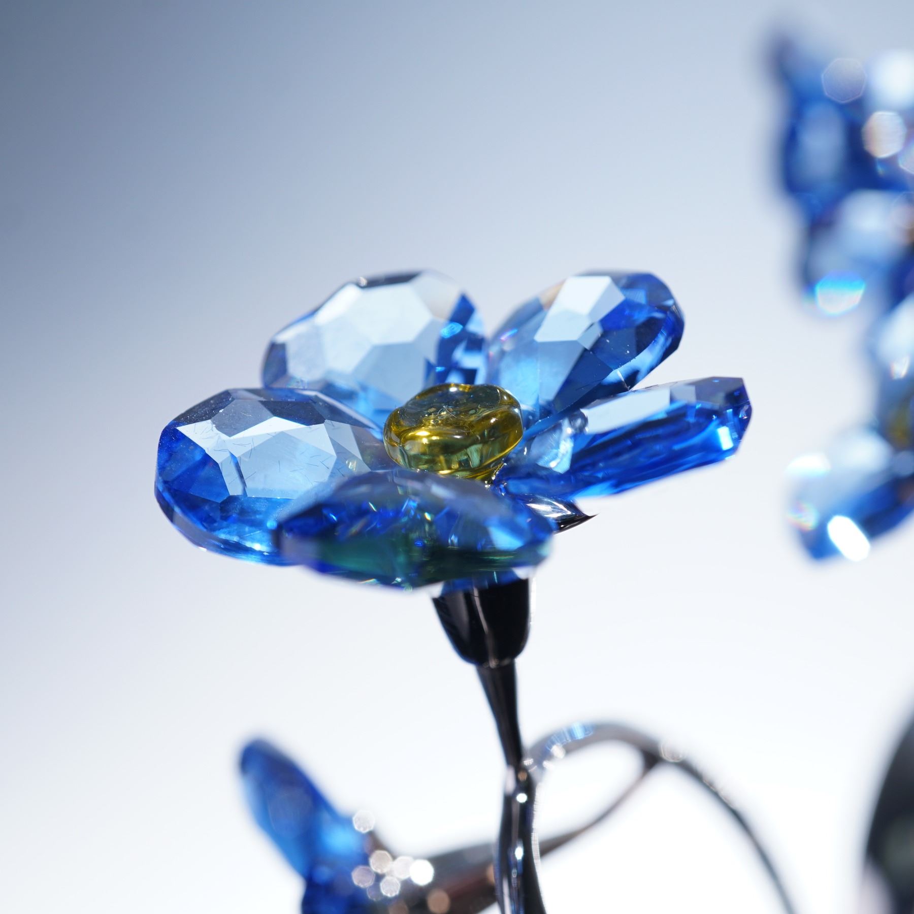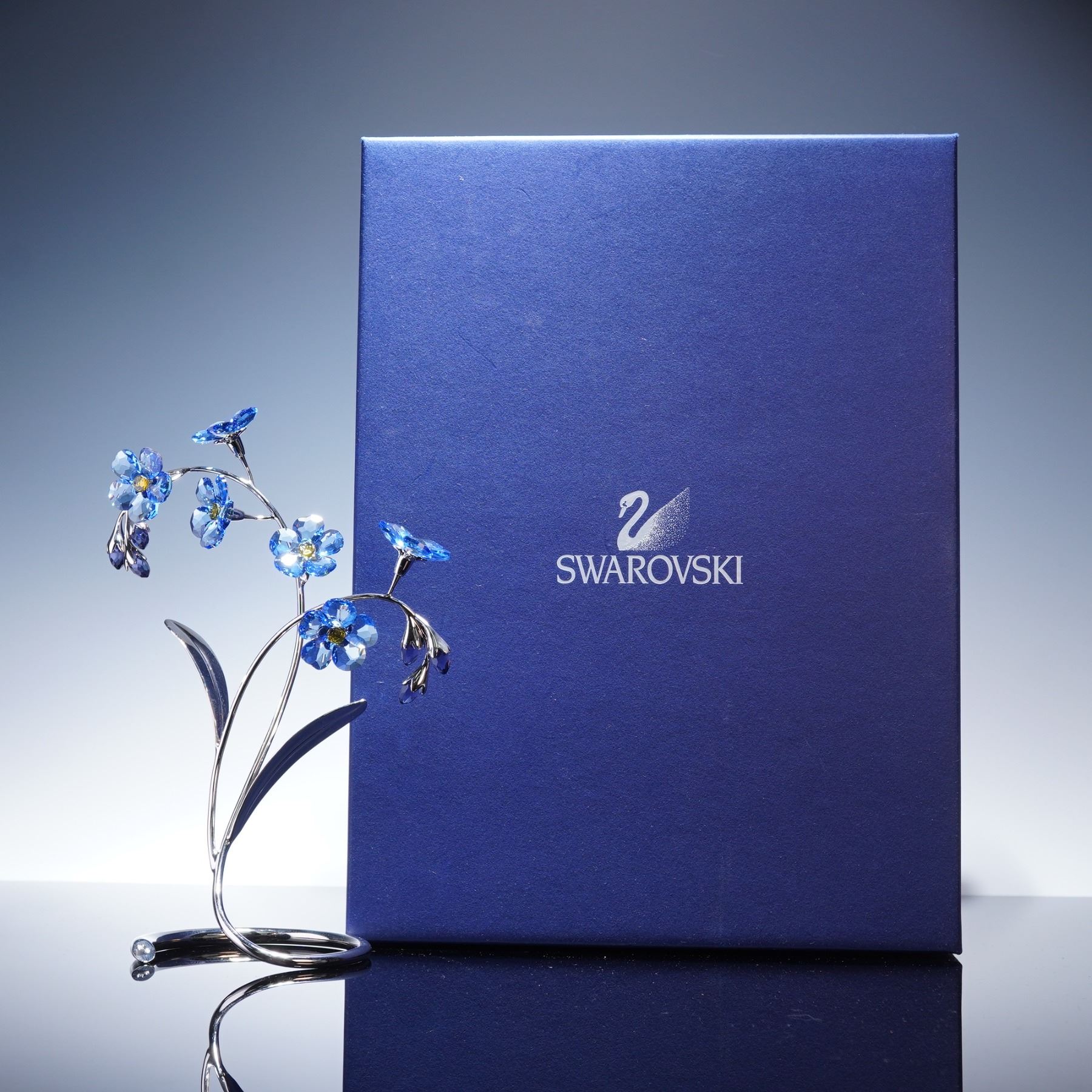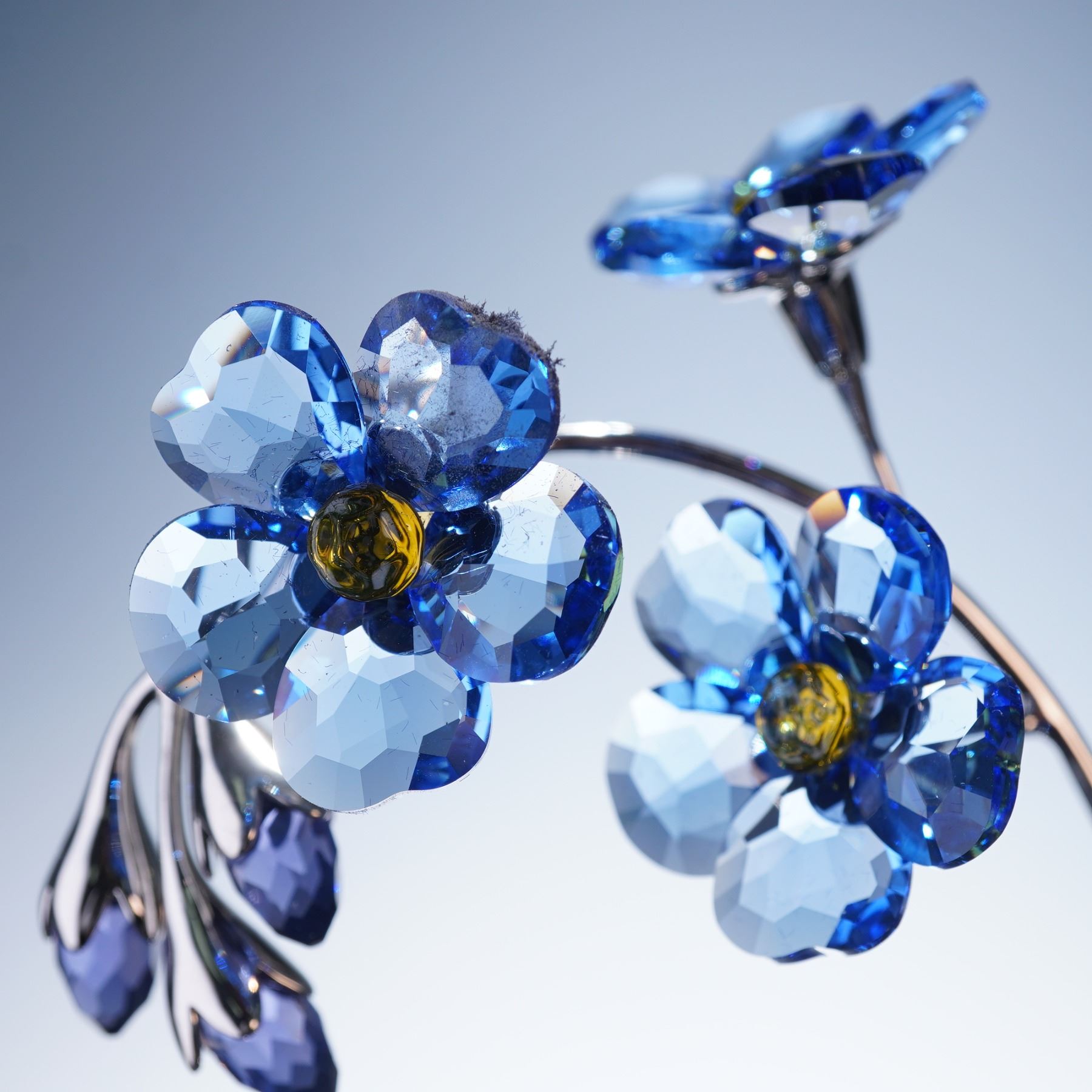 An elegant crystal floral figure inspired by the Forget-me-not. Each blossom is fashioned from faceted blue crystal petals with yellow crystal centers, accompanied by smaller buds glowing in a purple crystal hue. The naturalistic form captures the graceful arch of the stems, balanced upon a silver-tone metal stand. Swarovski backstamp. This item has its original box.