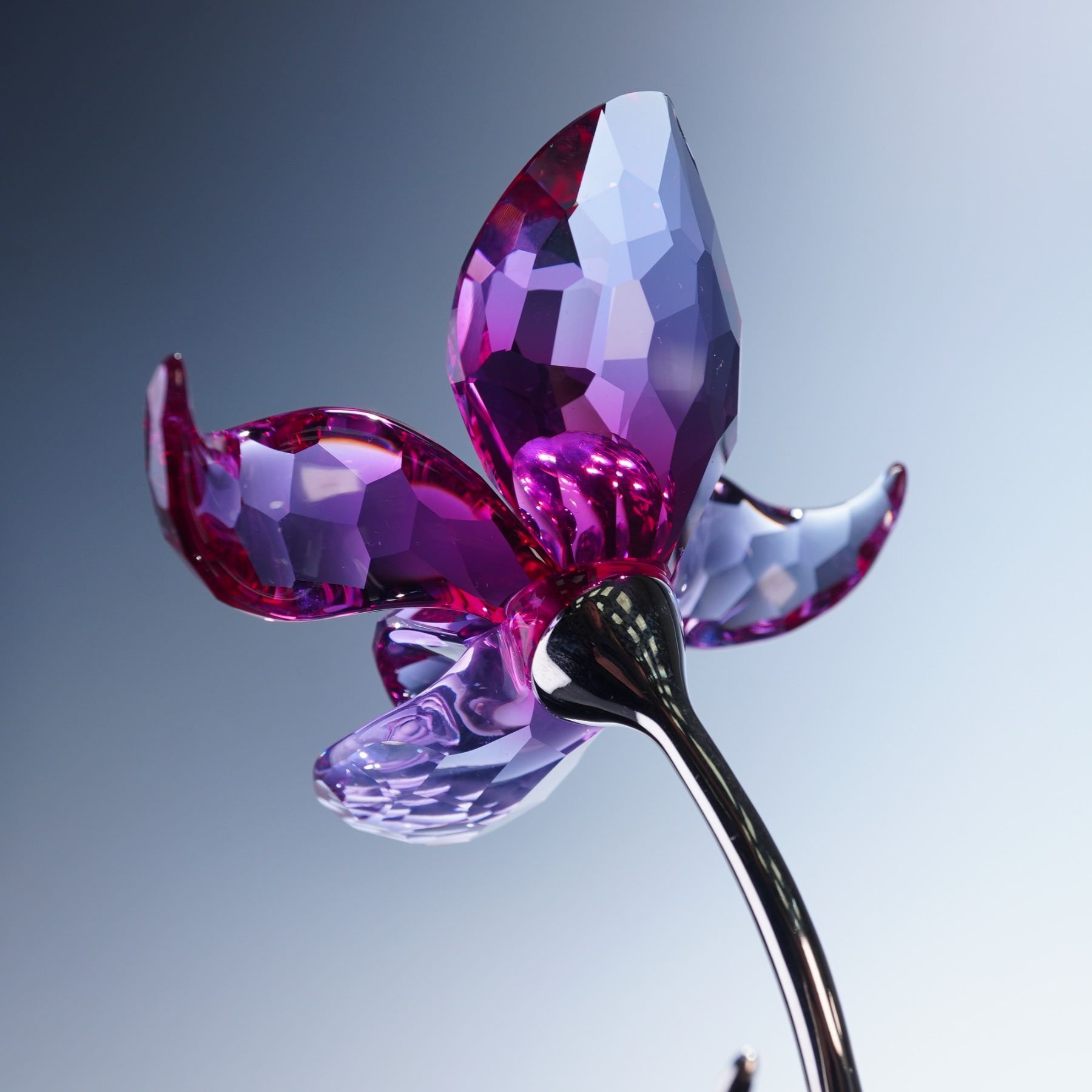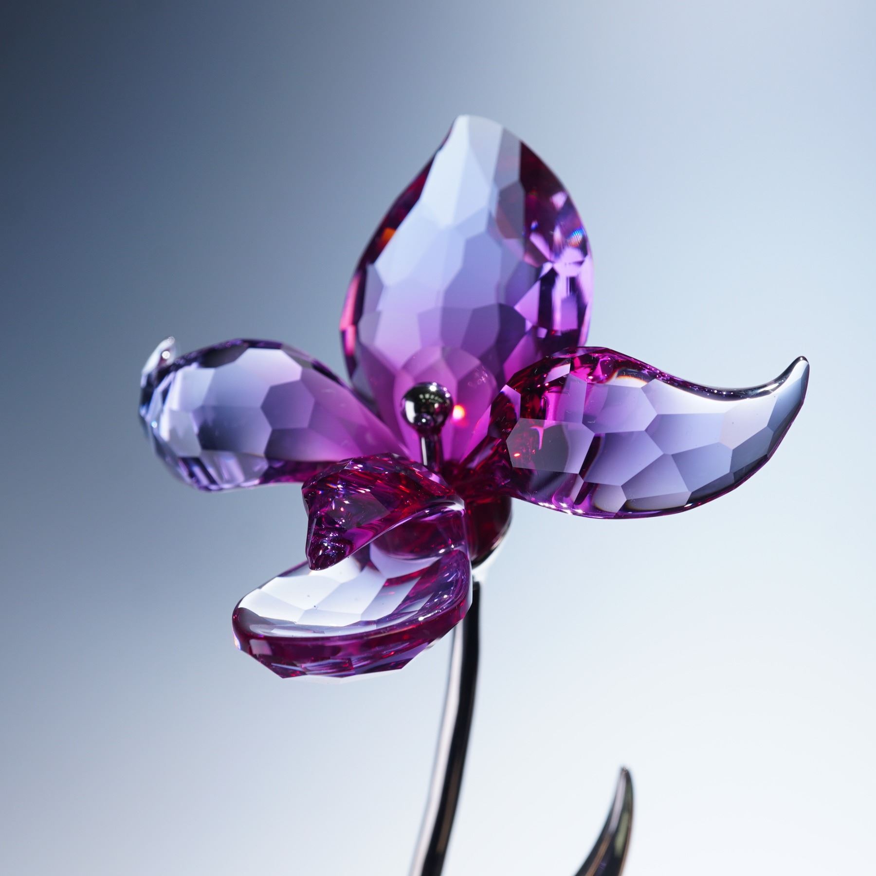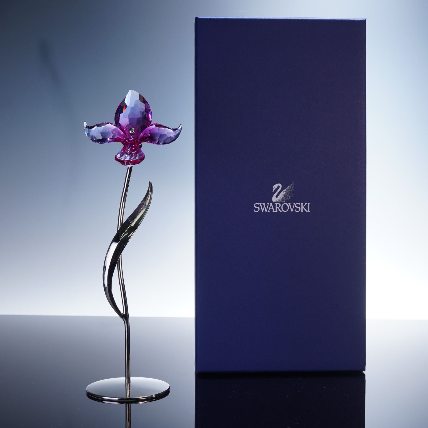 Exquisite crystal floral figure that was part of the "Exotic Flowers" collection. Rendered with a radiant orchid bloom in faceted fuchsia crystal petals accented by a glistening crystalline center. Rising from a sleek silver-toned metal stem with a single sculpted leaf, the piece is anchored on a polished circular base. Swarovski backstamp. This item has its original box.