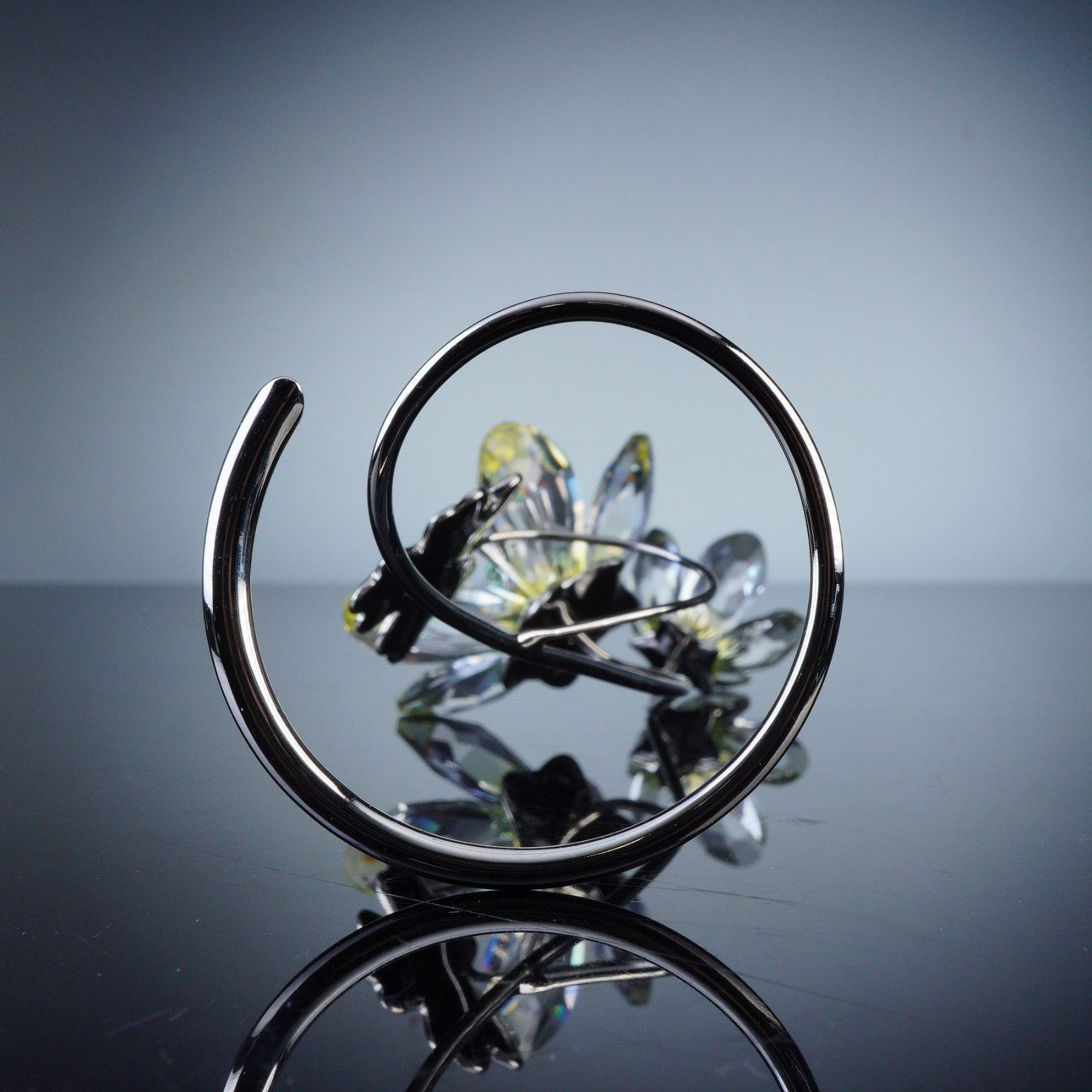 Exquisite floral sculpture titled Deoria Yellow, designed by Yasmine Hurel. This elegant creation features two vibrant blossoms in faceted clear and sunny yellow crystal with orange-tipped stamens and pale green crystal centers. The delicate flowers rise from a sleek chrome-tone metal stem with a single reflective leaf, gracefully coiled to form the base. Part of Swarovski's Crystal Paradise Flowers Collection, this piece embodies the fusion of natural beauty and modern design that defines the series. Includes original Swarovski box and fitted packaging. 957583.