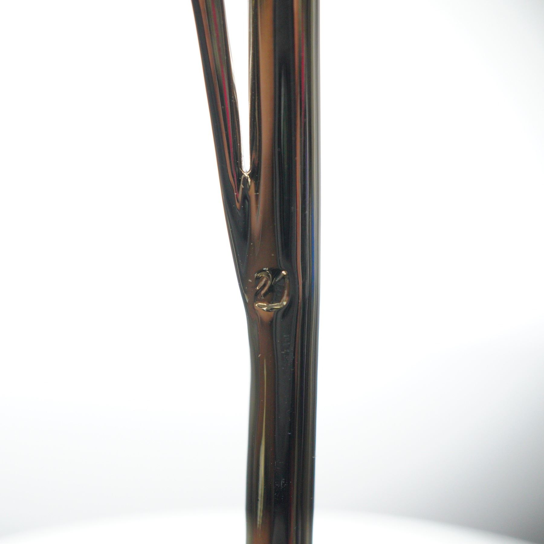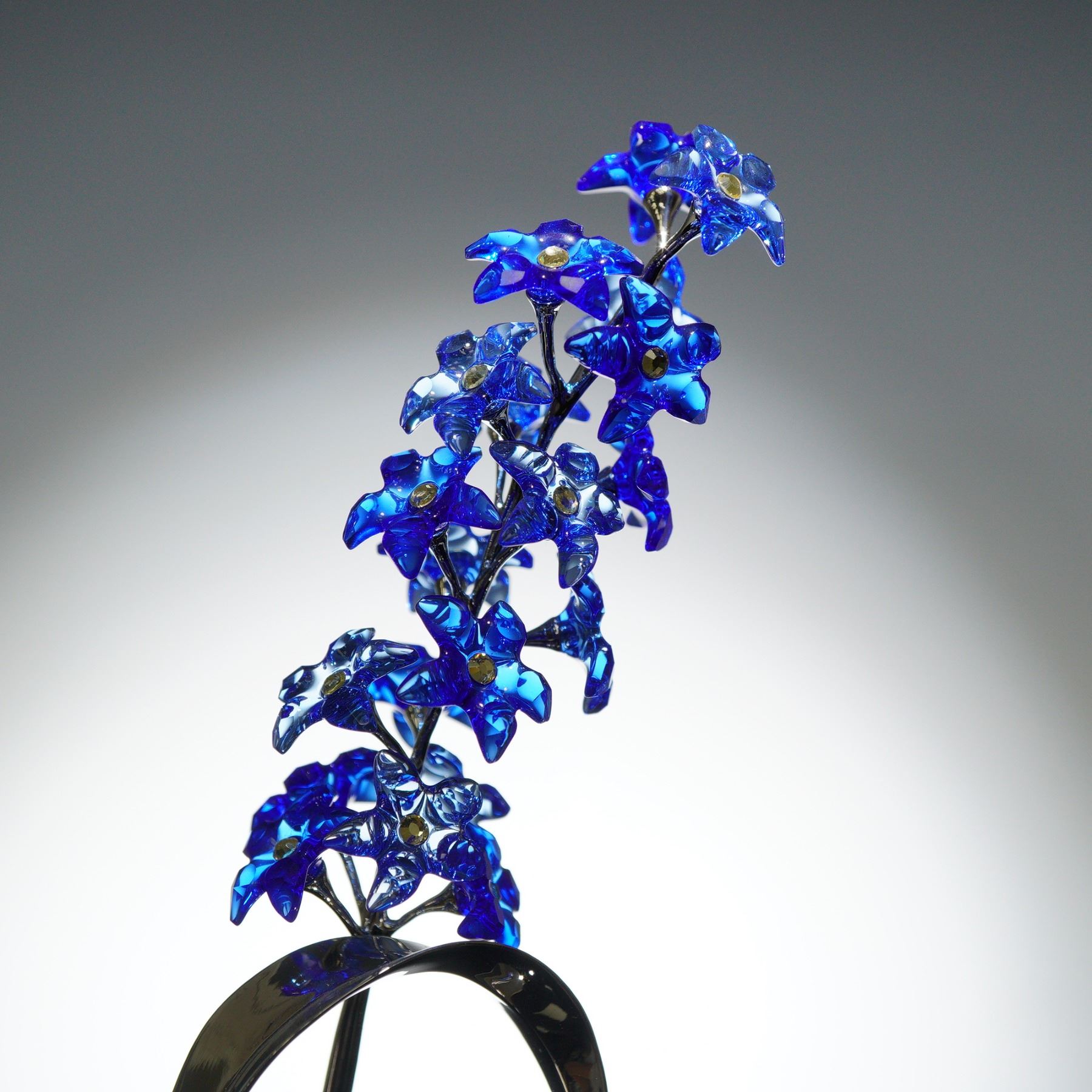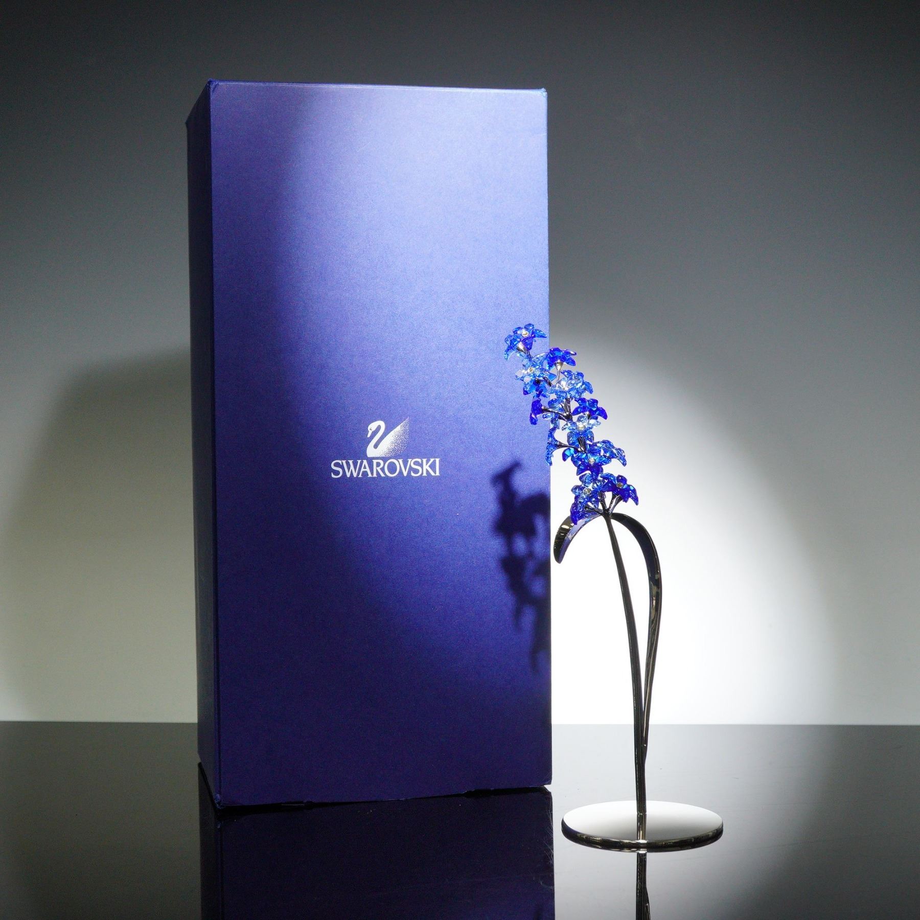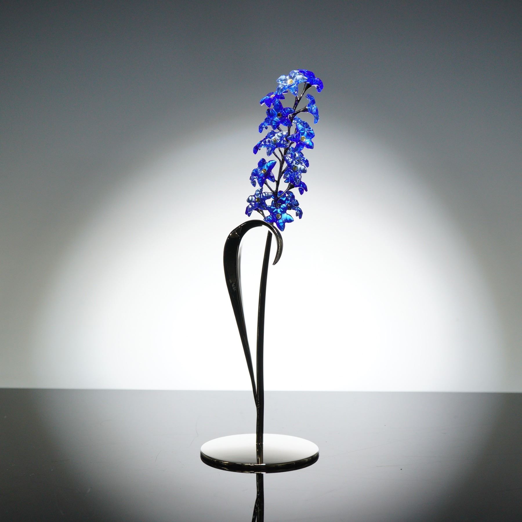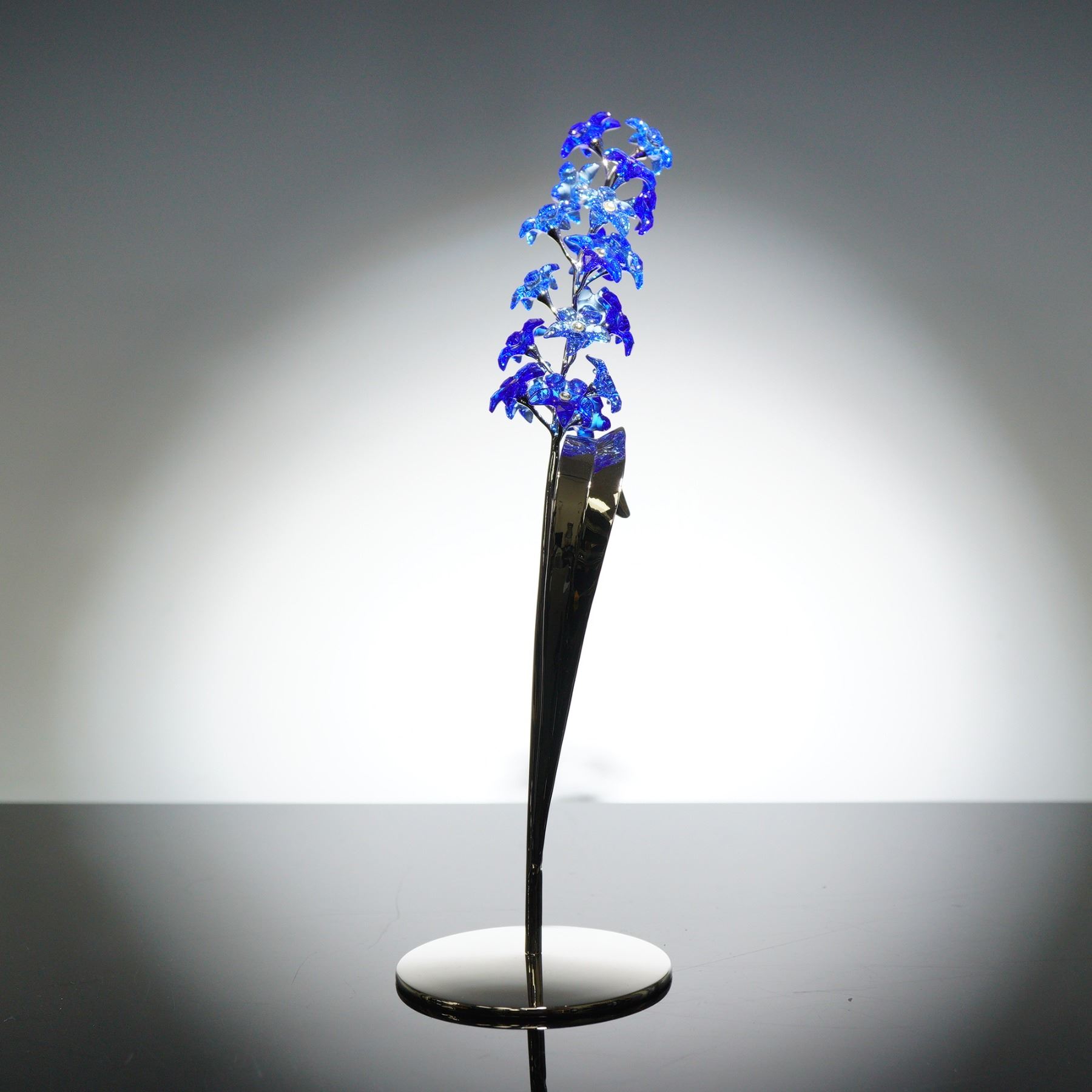 A stunning flower sculpture titled Dindori Sapphire, designed by Yasmine Hurel. This refined piece showcases a tall, graceful chrome-tone metal stem supporting a cluster of faceted sapphire-blue crystal blossoms, each intricately formed to capture light with brilliant intensity. The sculptural stem and mirror-polished base add a modern contrast to the delicate floral arrangement, creating a display of exceptional elegance and craftsmanship. Part of Swarovski's Crystal Paradise Flowers Collection, this design exemplifies contemporary artistry in crystal form. Includes original Swarovski box and fitted packaging. 677990.