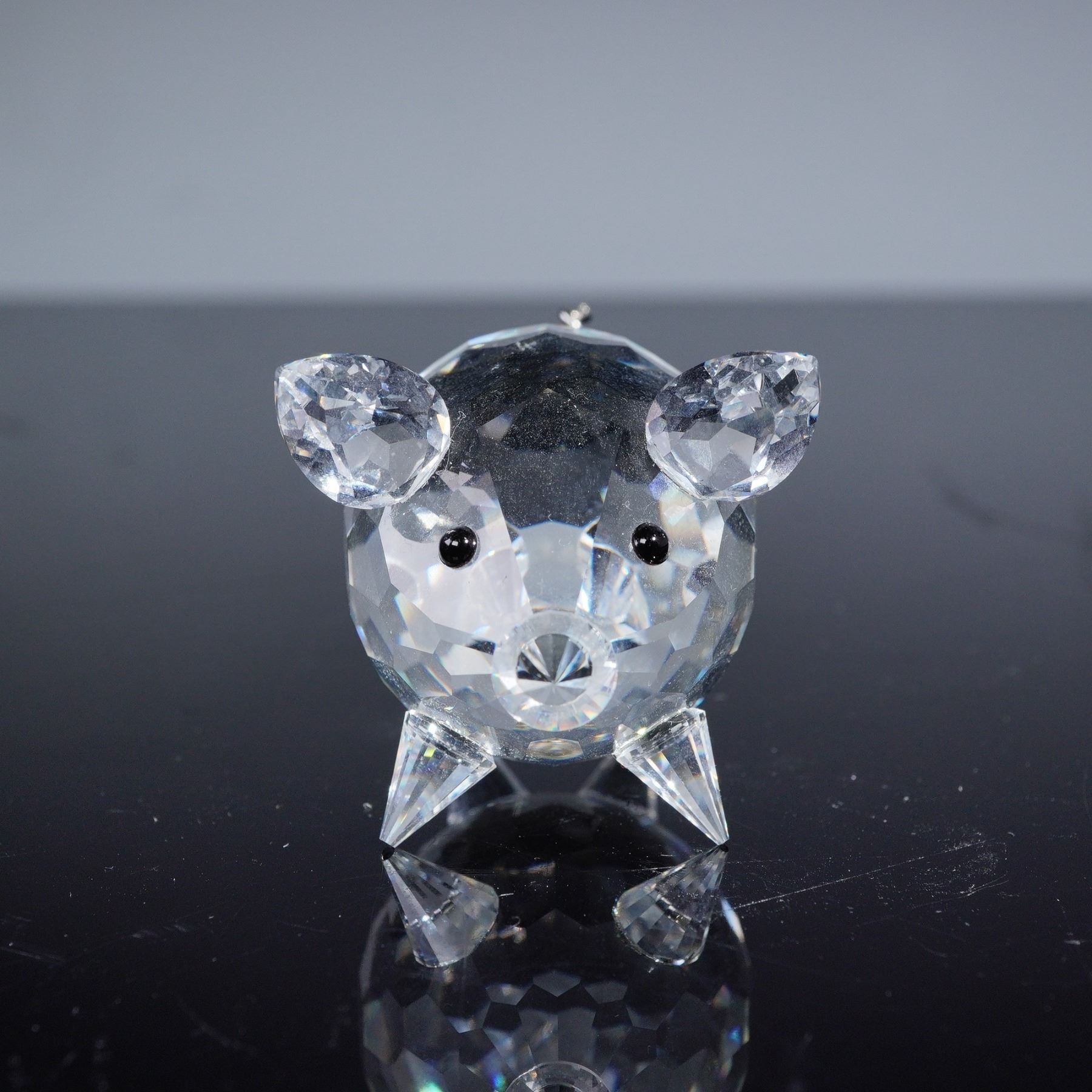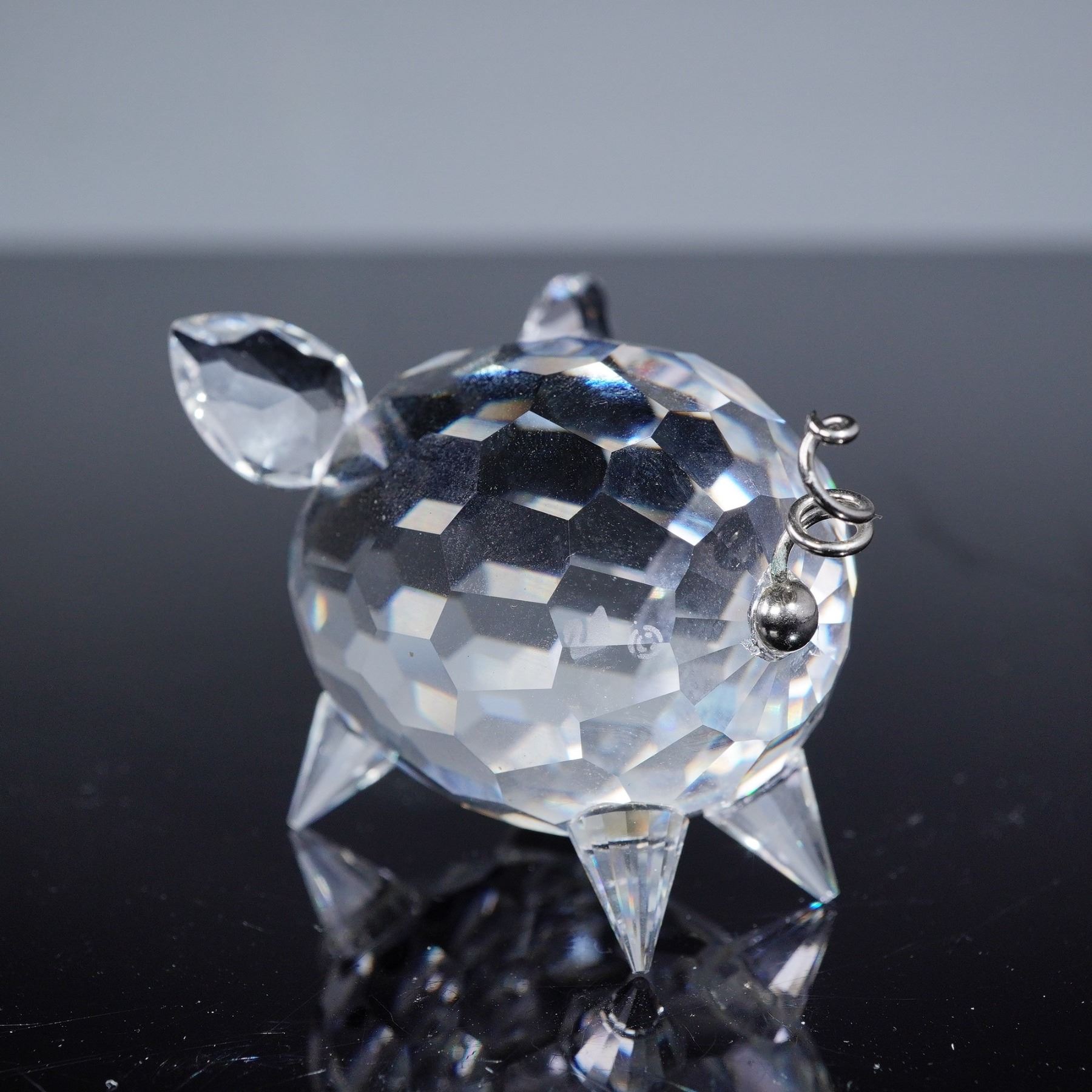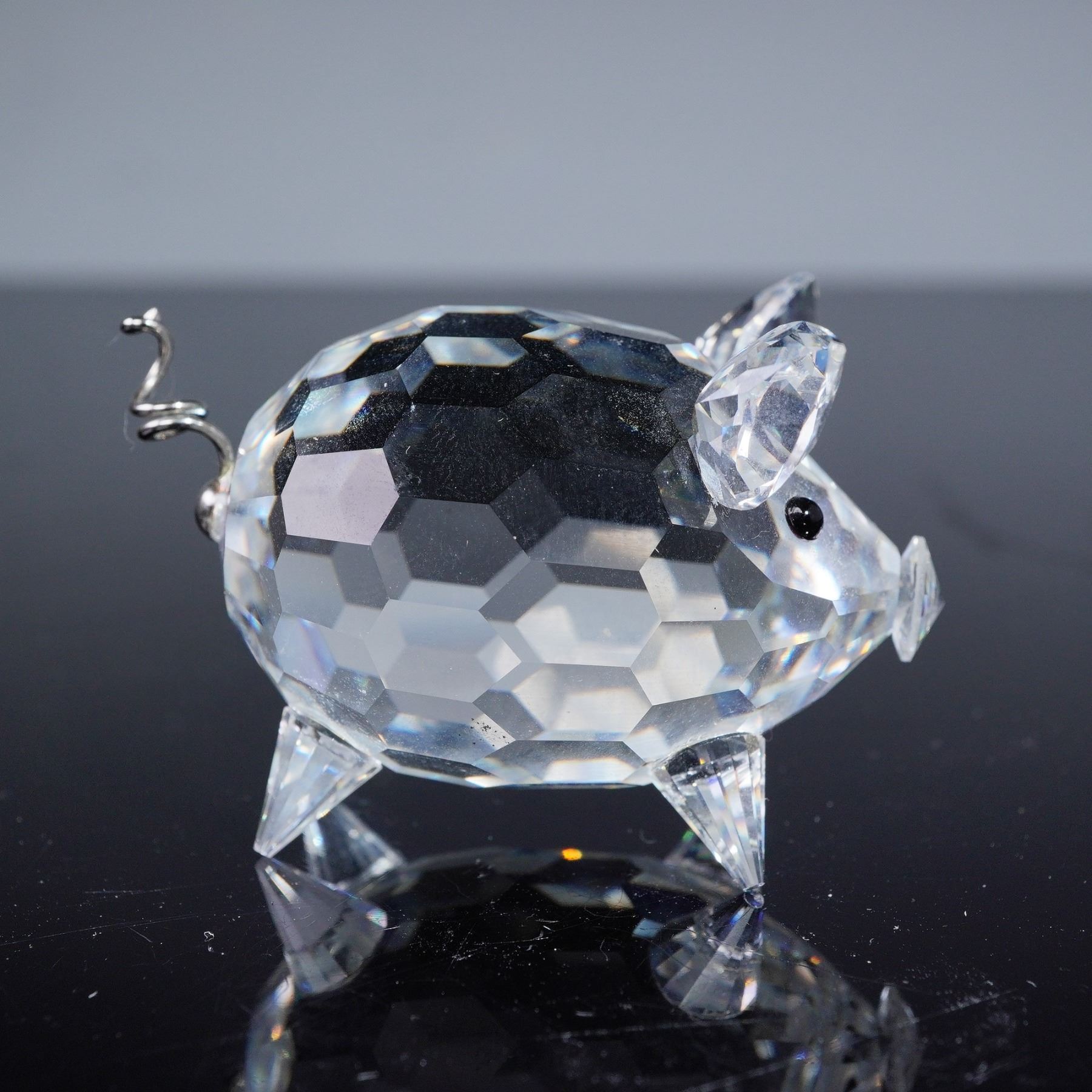 A Swarovski Crystal Pig Figurine, depicting a pig in a modern, decorative style. The body, head, ears, and four legs are composed of numerous precisely cut facets. Small black beads serve as the eyes, and a coiled silver-tone metal wire with a spherical end forms the tail. An engraved swan logo is visible on one of the back facets.