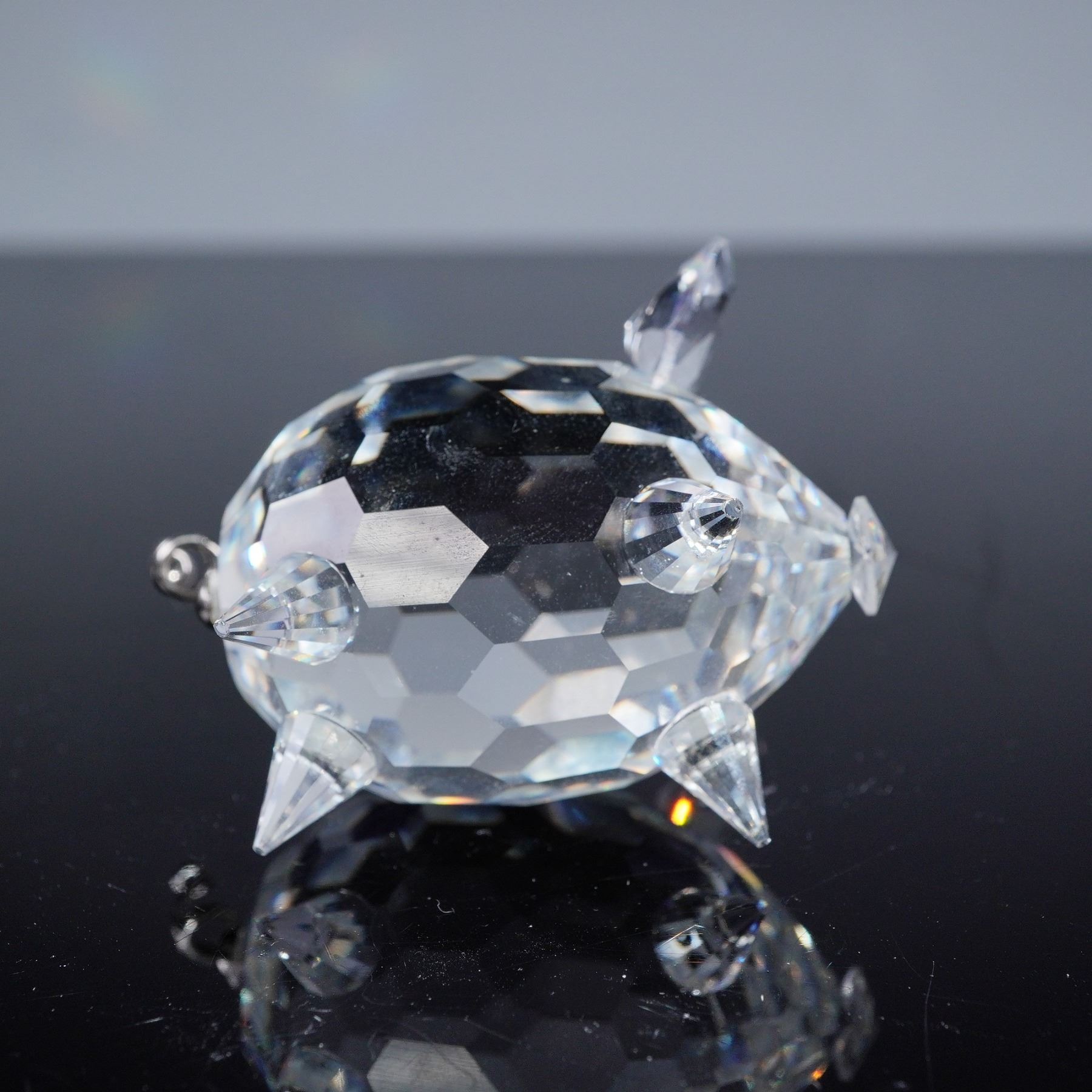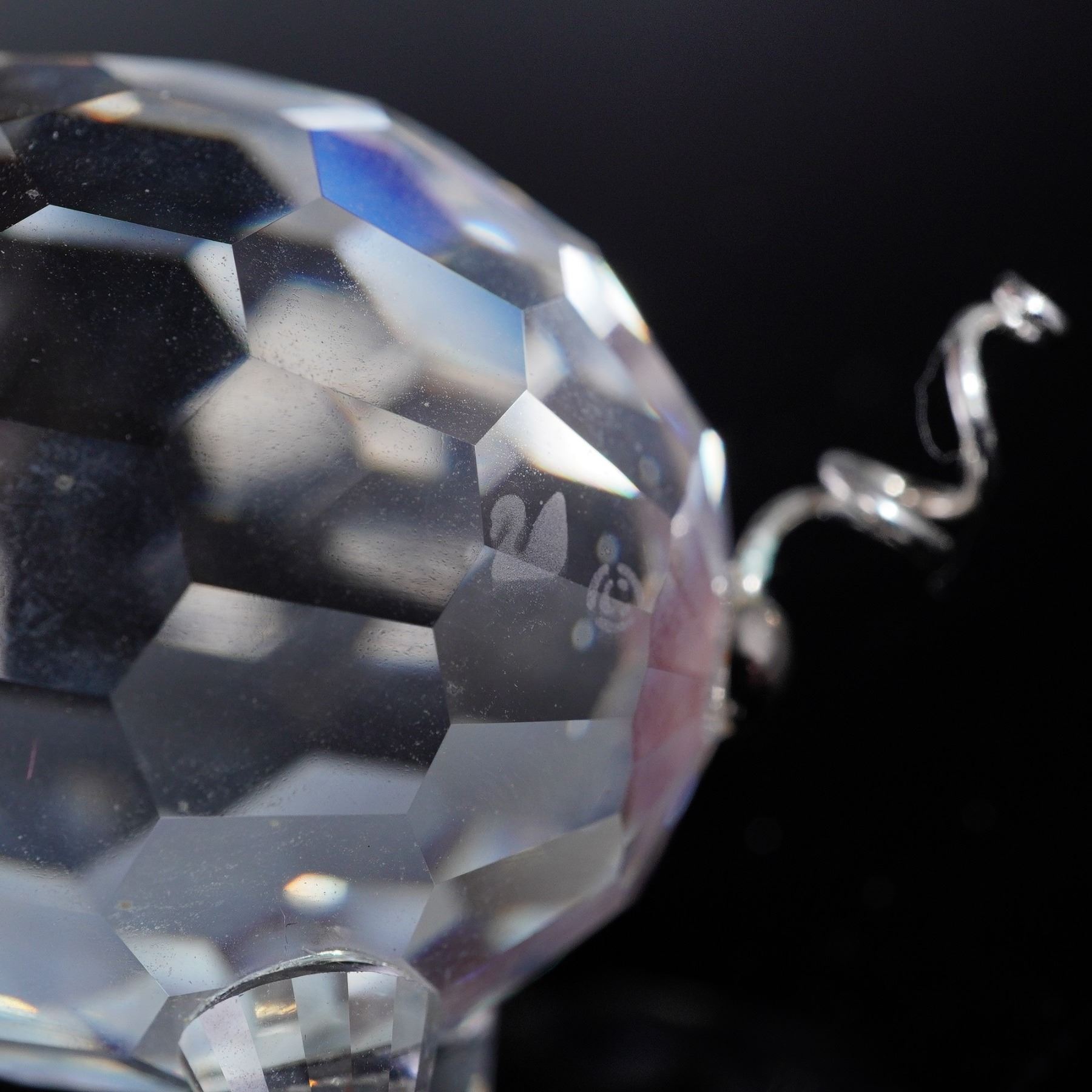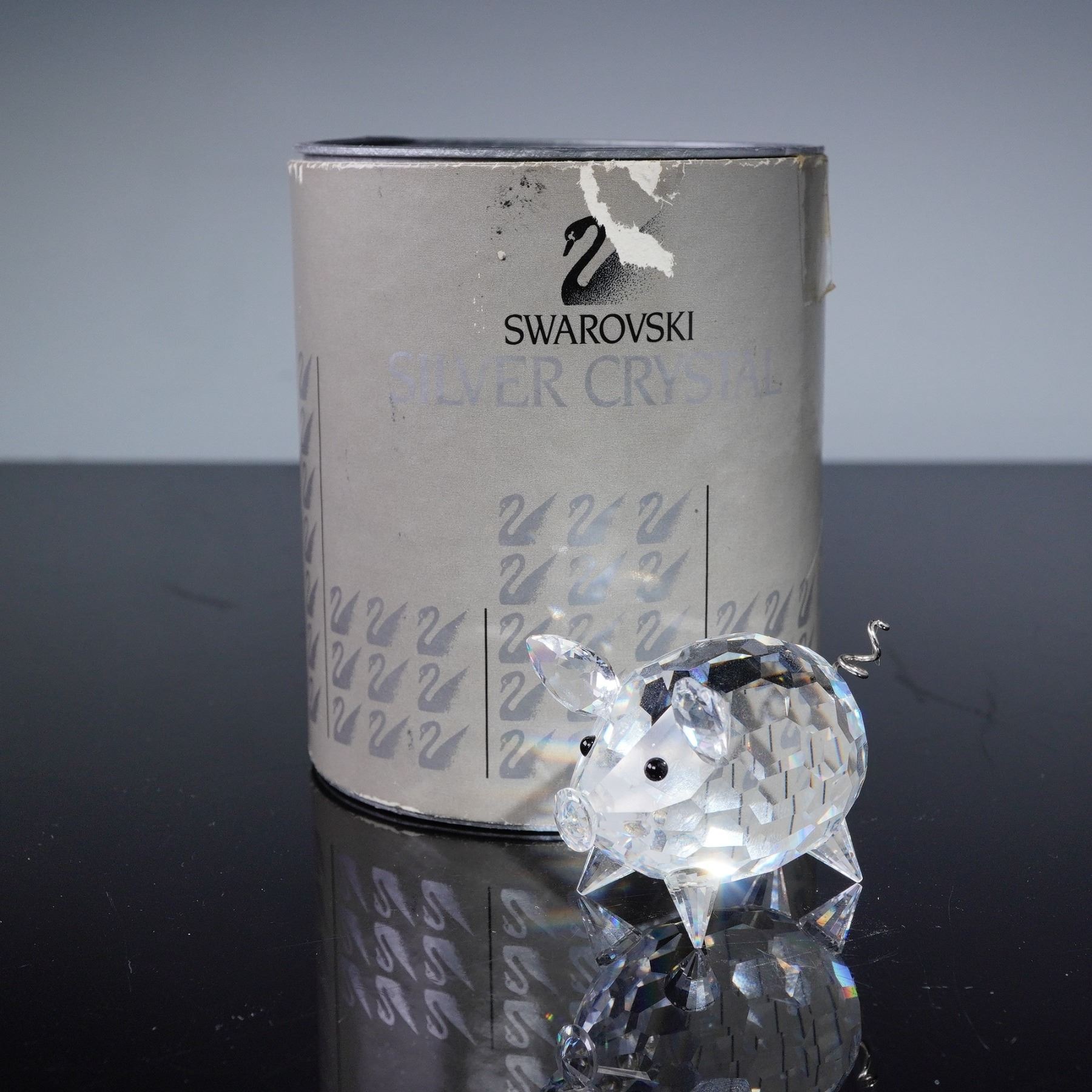 A Swarovski Crystal Pig Figurine, depicting a pig in a modern, decorative style. The body, head, ears, and four legs are composed of numerous precisely cut facets. Small black beads serve as the eyes, and a coiled silver-tone metal wire with a spherical end forms the tail. An engraved swan logo is visible on one of the back facets.