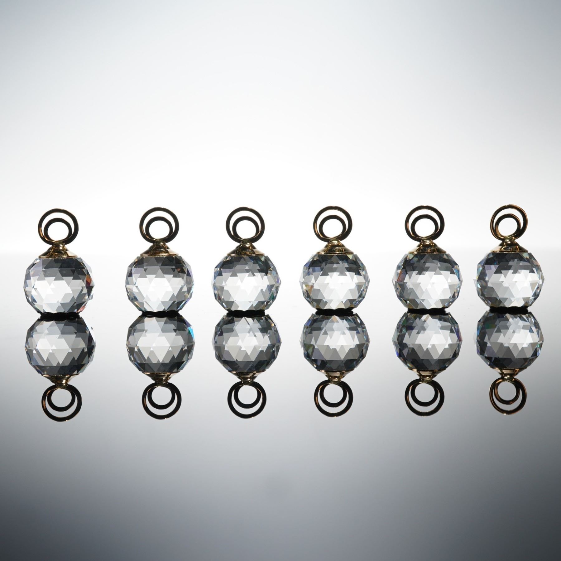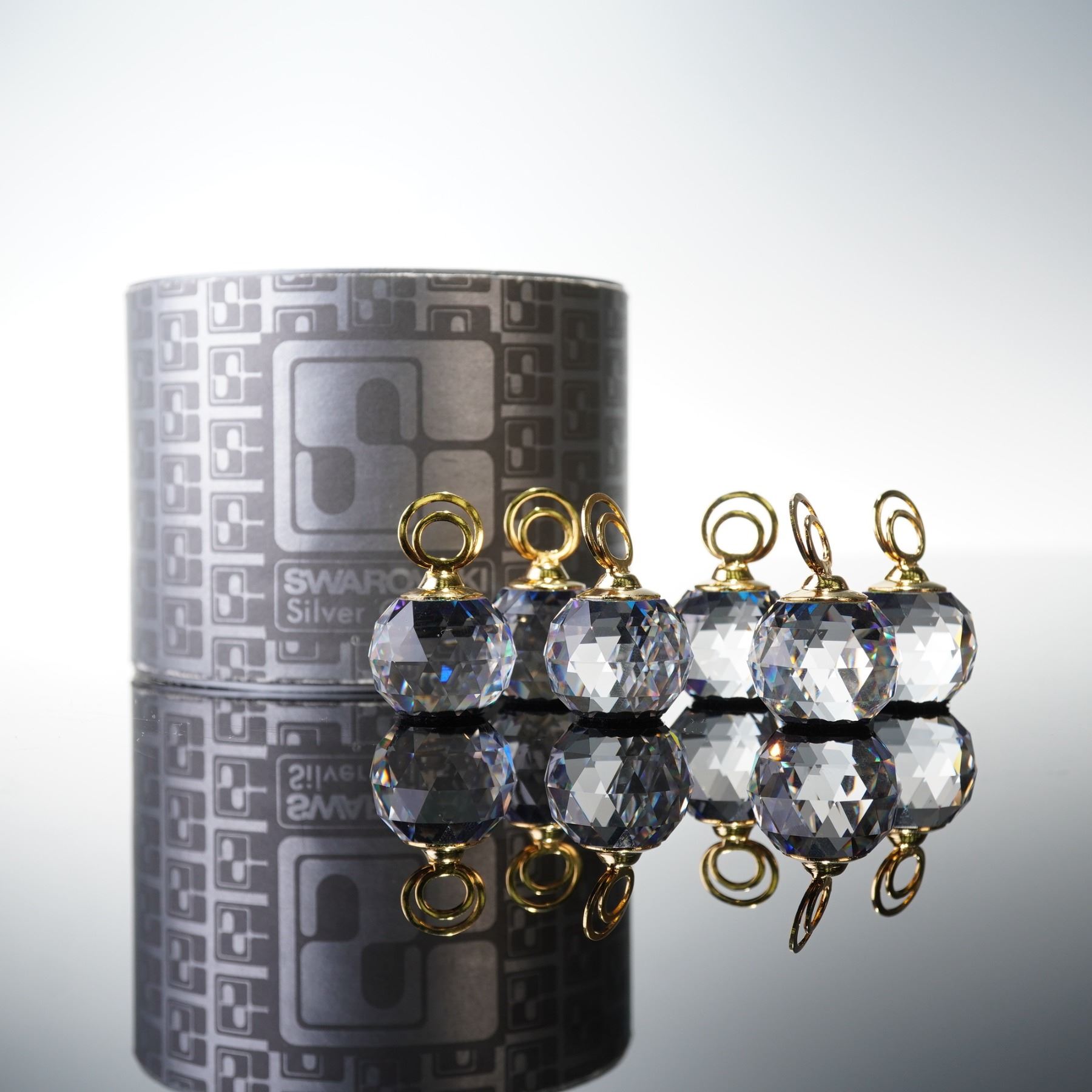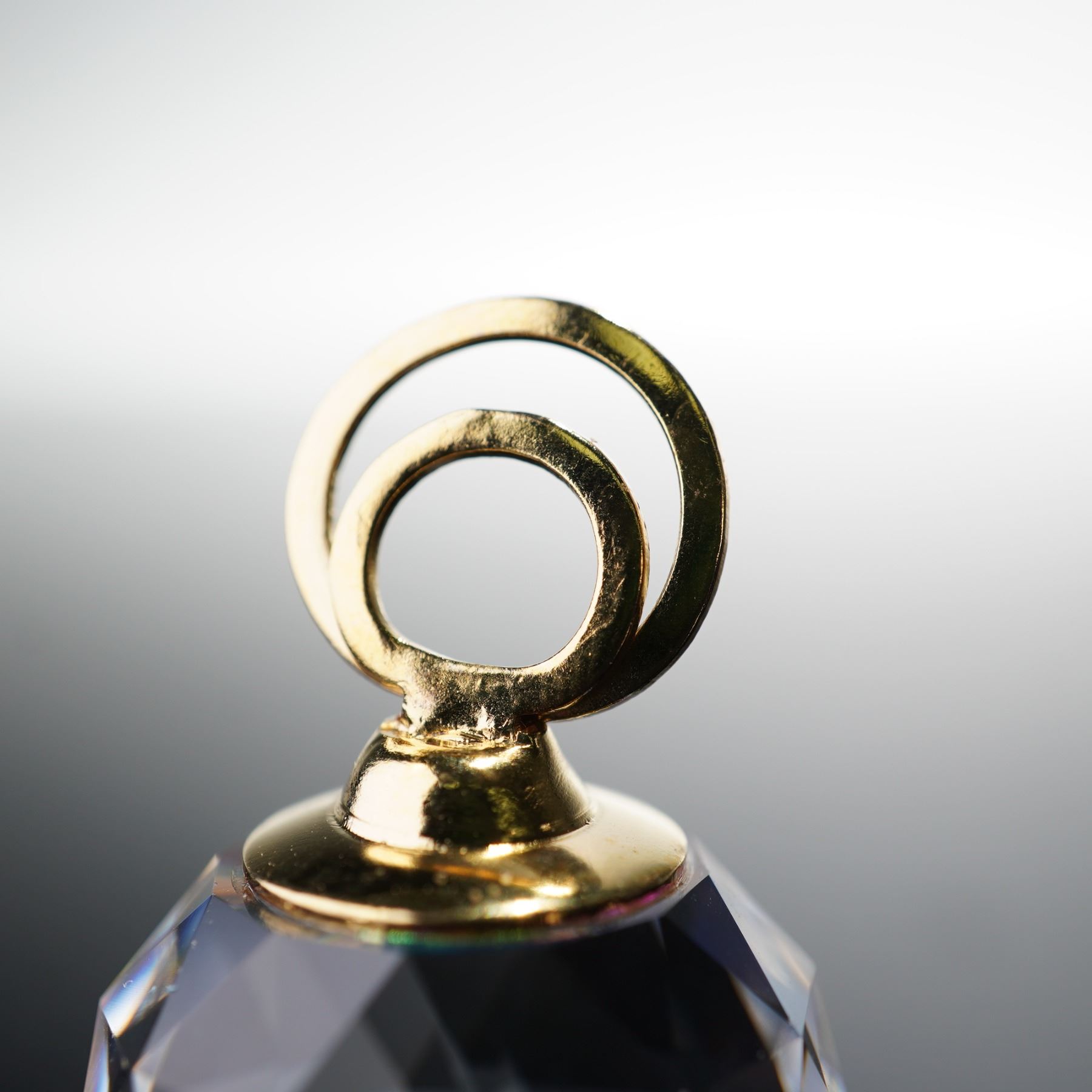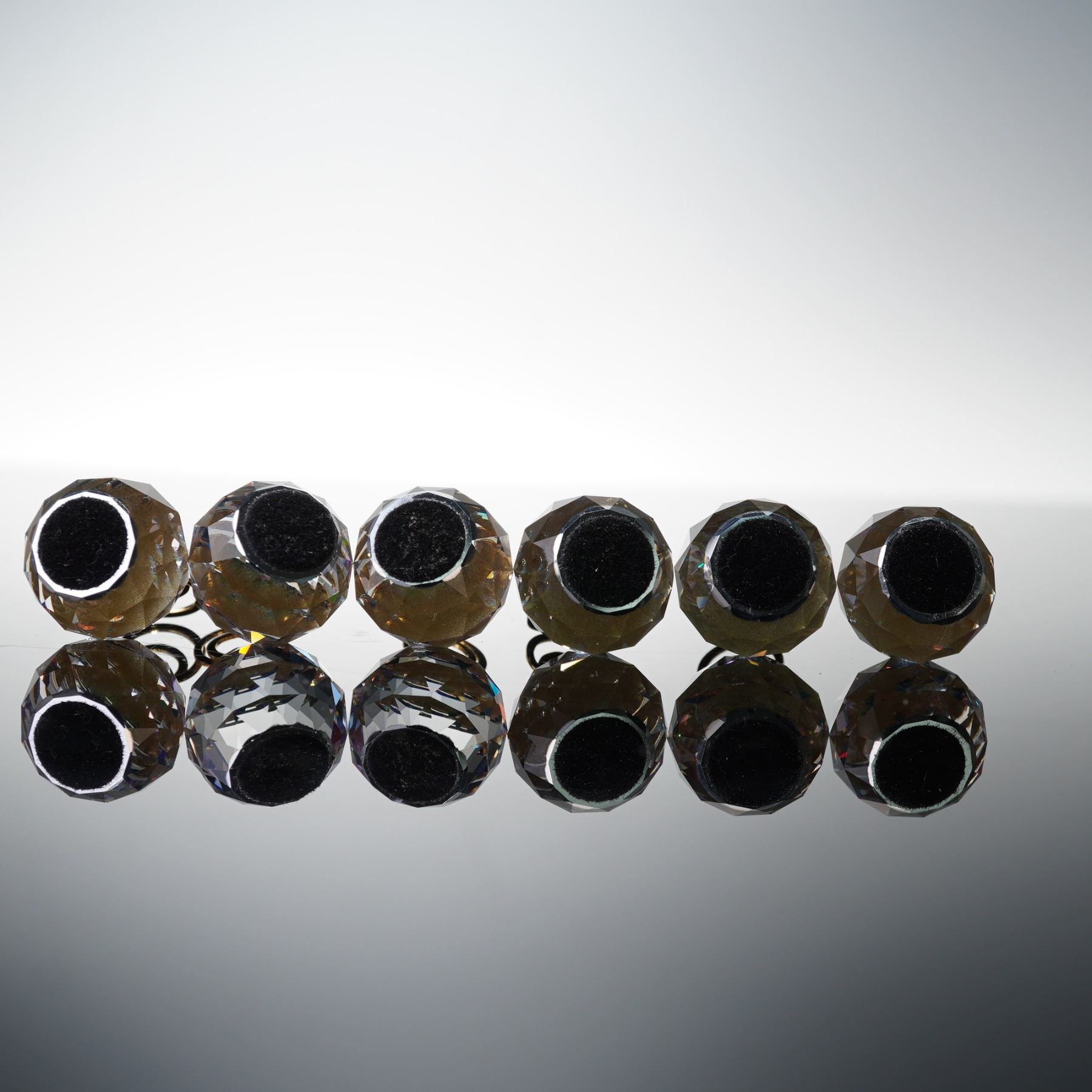 Place card holders features brilliantly faceted crystal spheres capped with polished gold-tone rings. Designed to catch and scatter light with signature Swarovski radiance, each piece exemplifies the brand's mastery of clarity and precision cutting. Perfect for formal dining or decorative display, these holders bring a refined sparkle to any setting. The set is presented in its original cylindrical Swarovski box. A graceful touch of luxury crystal craftsmanship, ideal for collectors or hosts with a taste for understated glamour. 7403 NR 020.