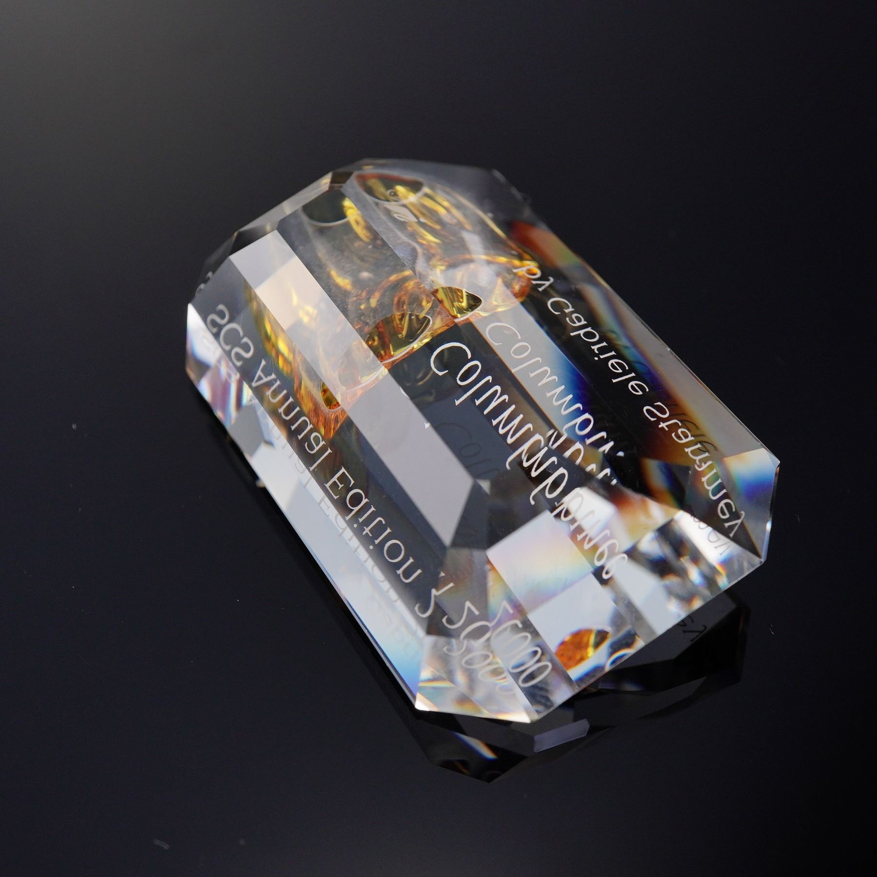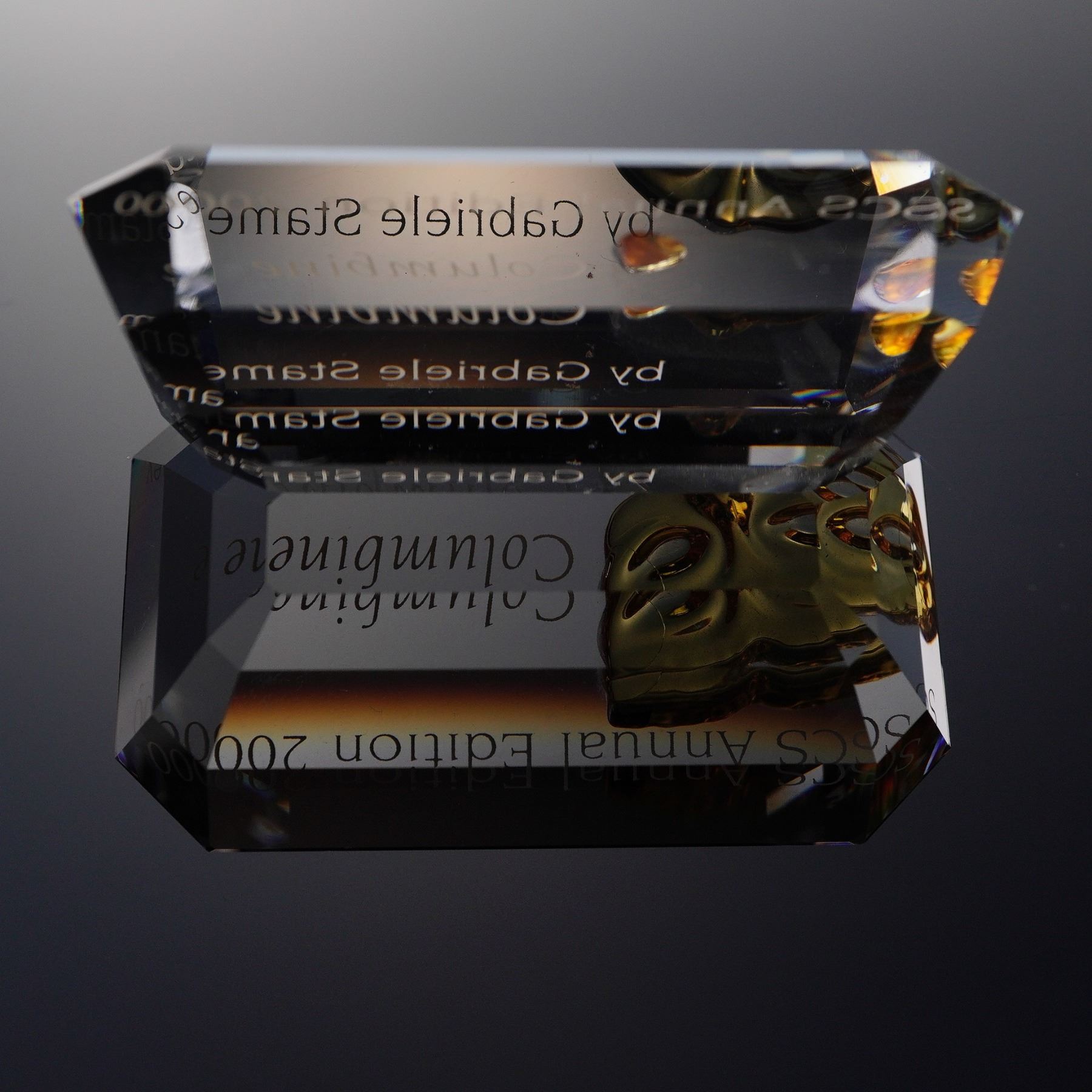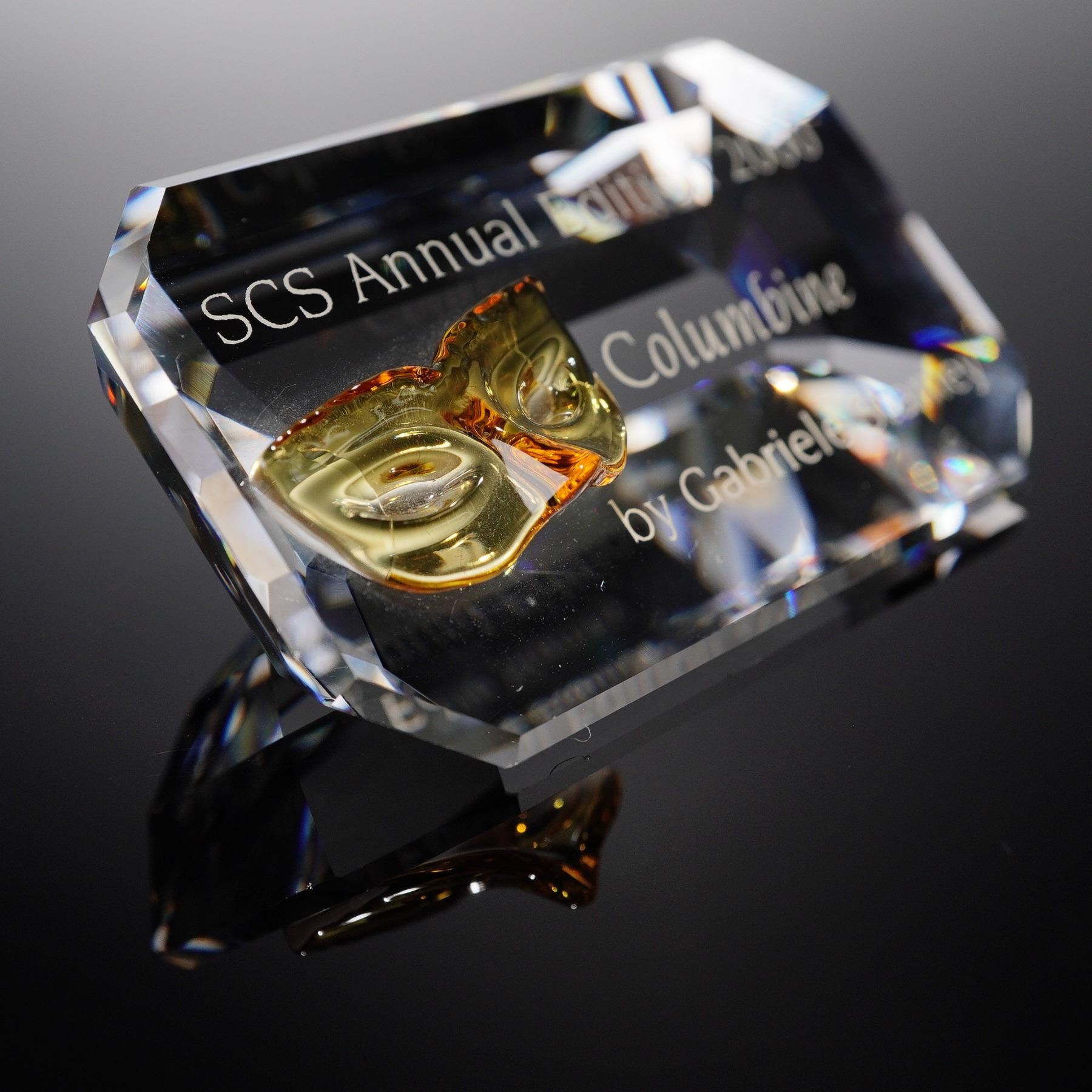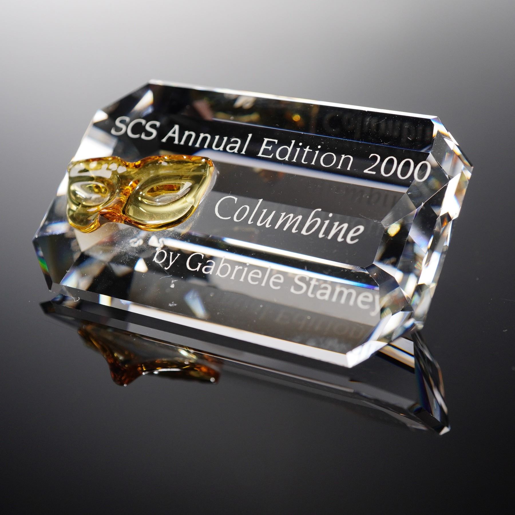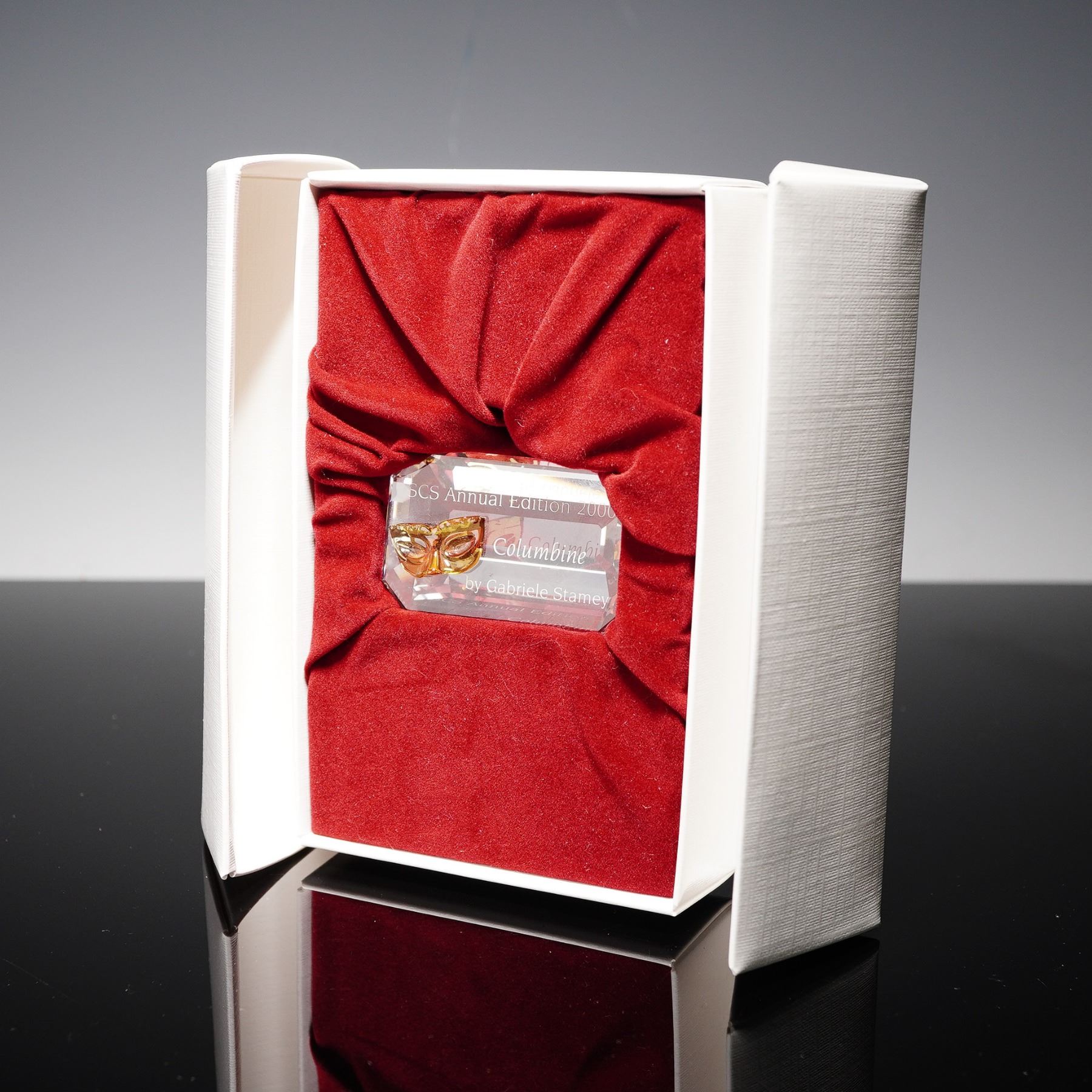 This Swarovski Crystal Paperweight commemorates the SCS Annual Edition 2000, featuring the design of Columbine by Gabriele Stamey. The paperweight has a clear crystal body that elegantly showcases a detailed golden mask motif at its center. Etched with the words SCS Annual Edition 2000 - Columbine - by Gabriele Stamey, it captures the essence of the harlequin figure from the Commedia dell'arte. Housed within a striking white display box lined with rich red velvet, this piece exemplifies Swarovski's masterful artistry and attention to detail. The box features protective padding to secure and highlight the crystal's brilliance. Plaque measures 1"H. Box measures 6"L x 1.5"H.