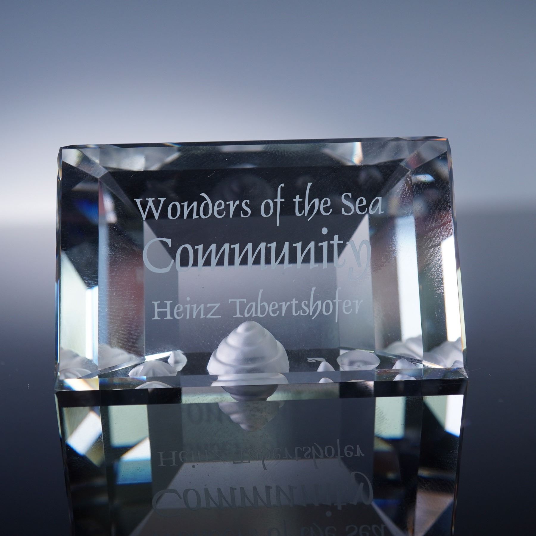 This Swarovski crystal plaque titled Community was issued in 2007 as part of the Wonders of the Sea trilogy. Designed by Heinz Tabertshofer, the plaque features precision-cut crystal with frosted marine accents including shells and bubbles, and is etched with the collection title and designer's name. A collectible presentation piece created to complement the figurines from the Wonders of the Sea series, it comes housed in its original blue cylindrical Swarovski box and bears the Swarovski swan logo etched beneath.