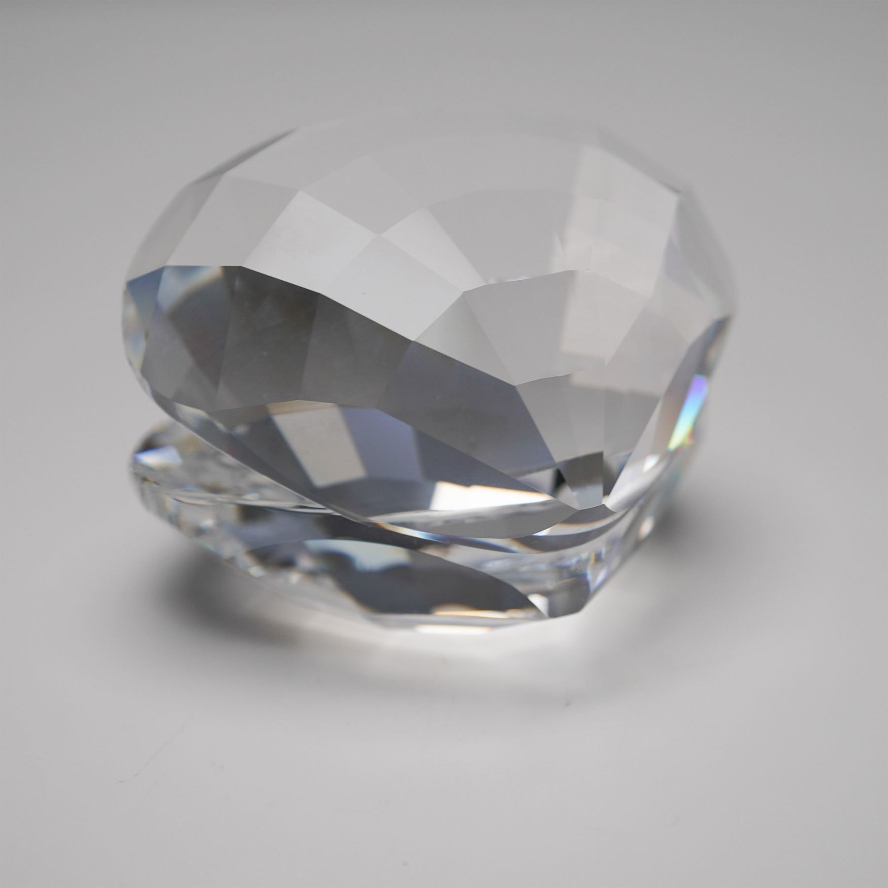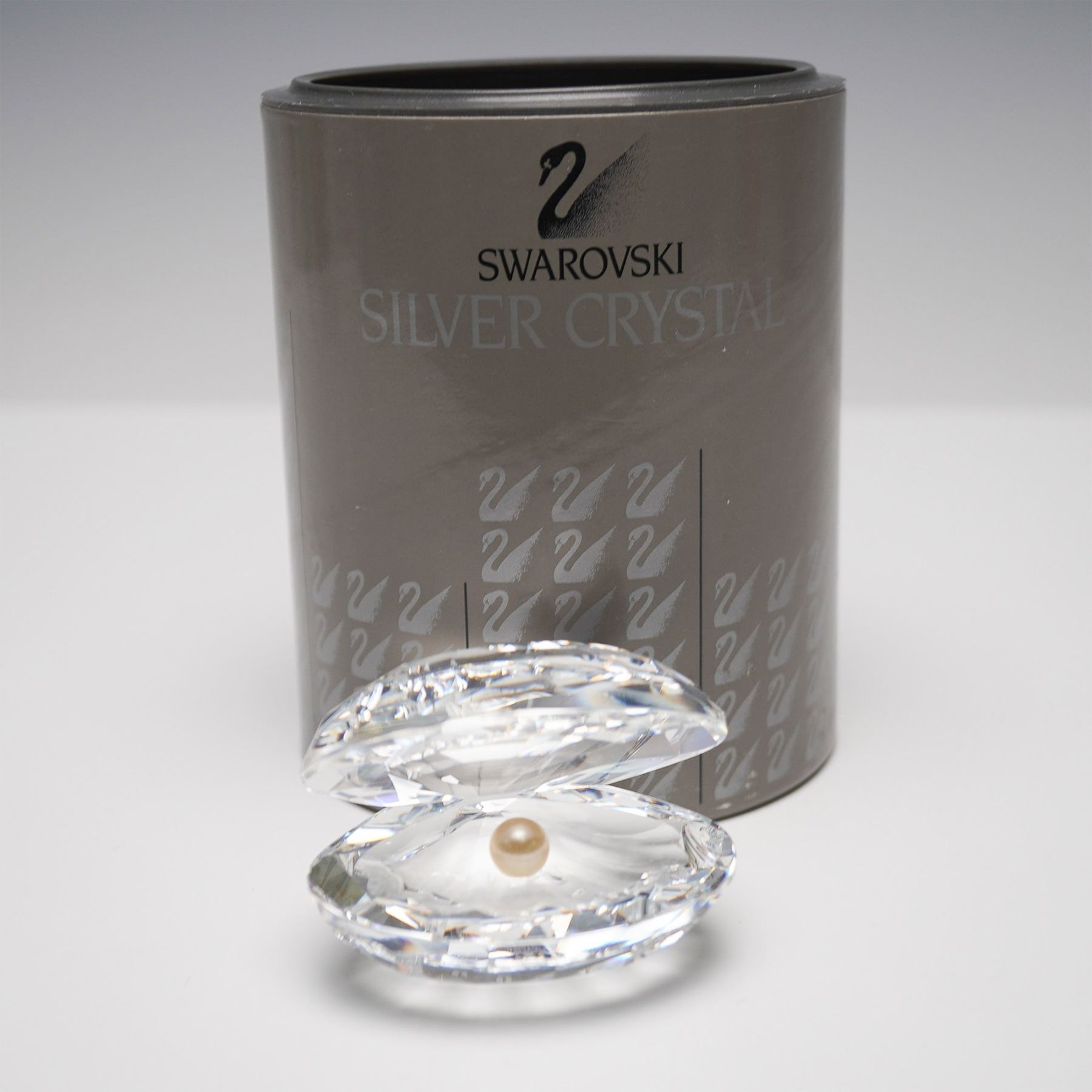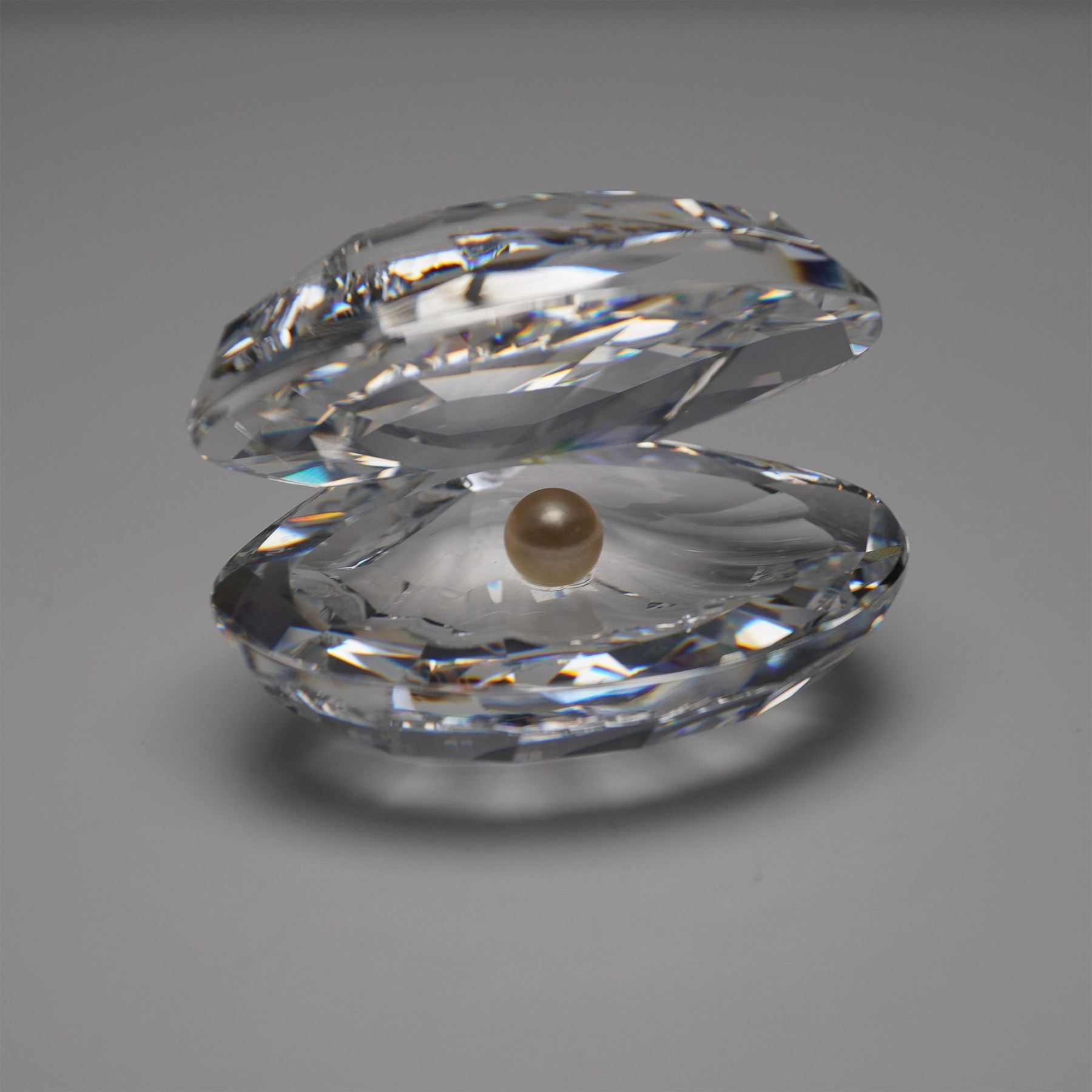 Swarovski Crystal Shell with Pearl, model number 014389, designed by Michael Stamey. This elegant figurine features a beautifully faceted clear crystal shell with an iridescent pearl nestled inside. Part of the Swarovski Silver Crystal collection, this timeless piece captures the beauty of the ocean and makes a perfect addition for collectors or as a symbol of elegance and rarity. Includes the original box.