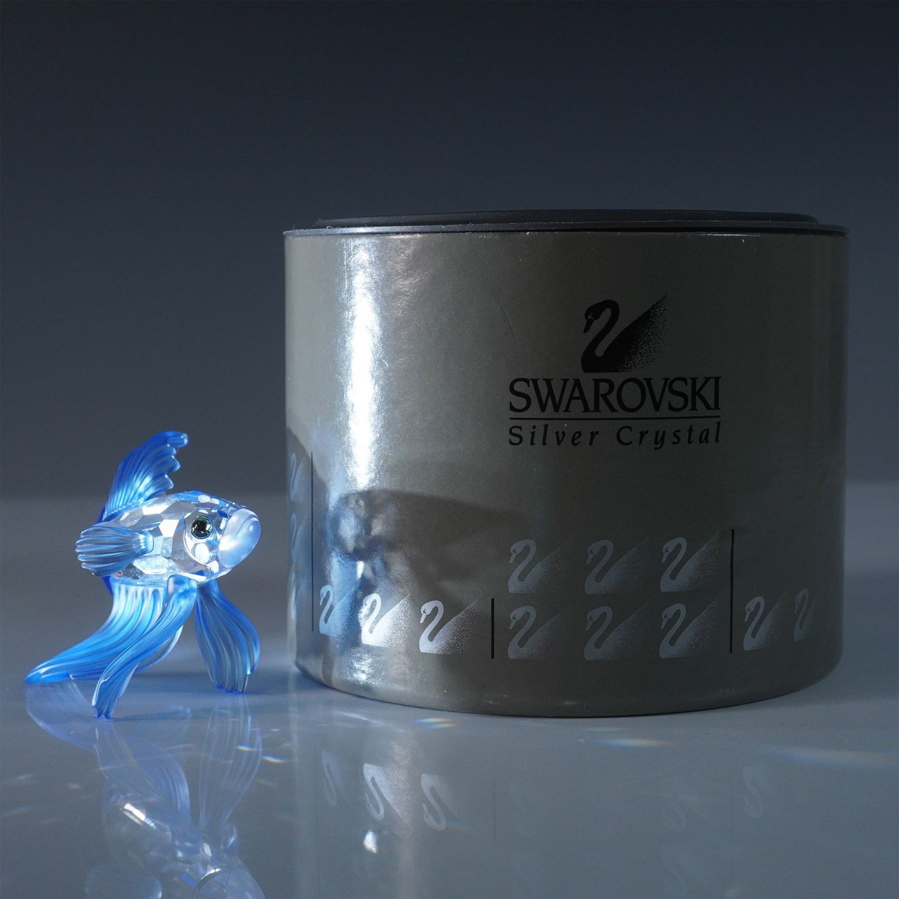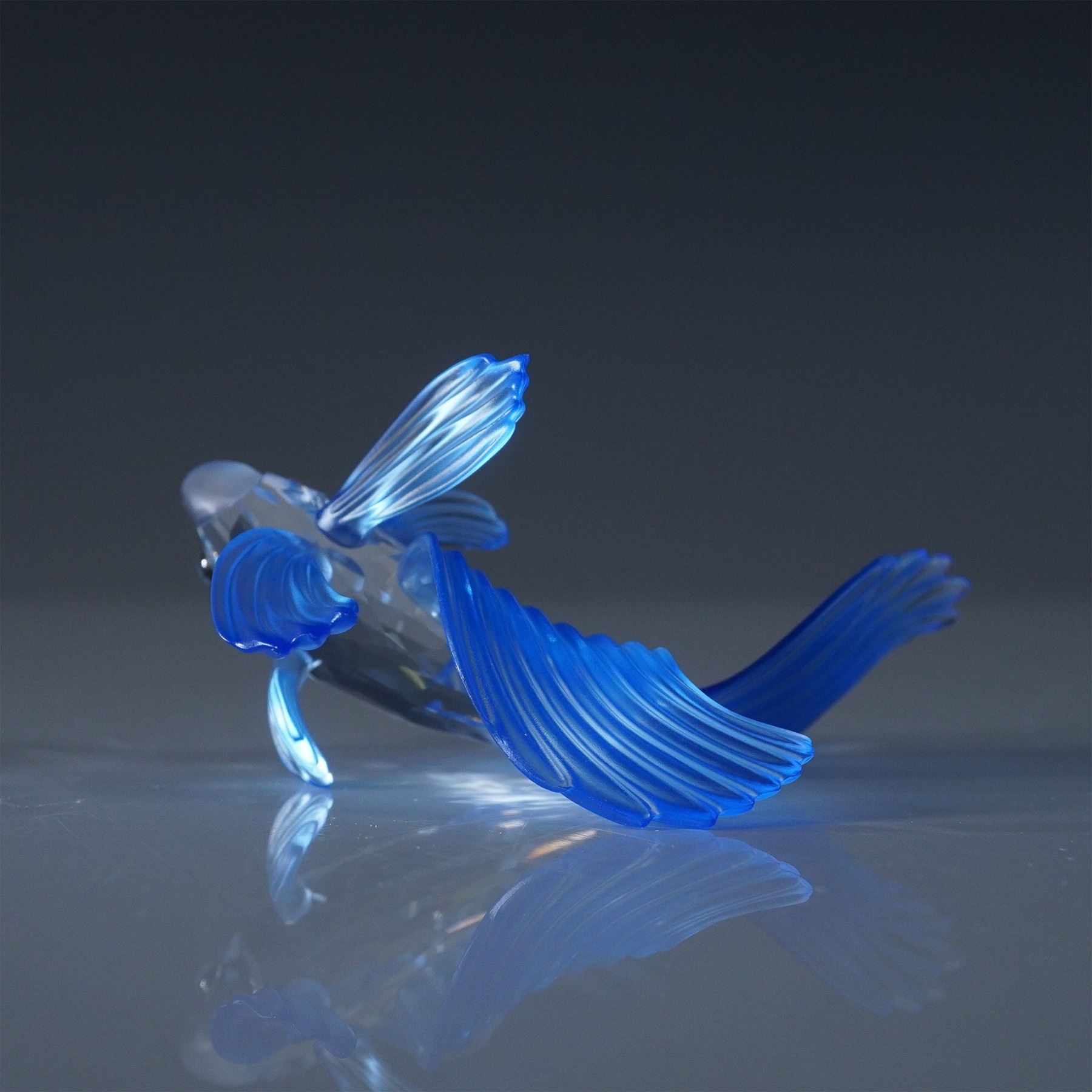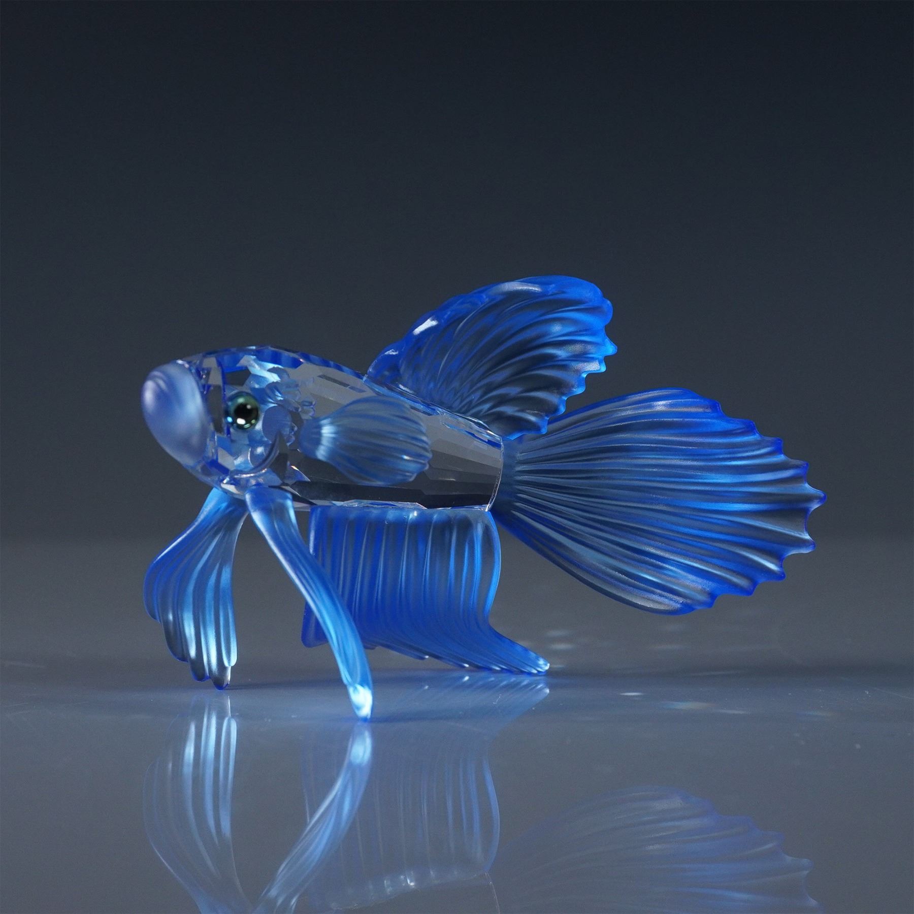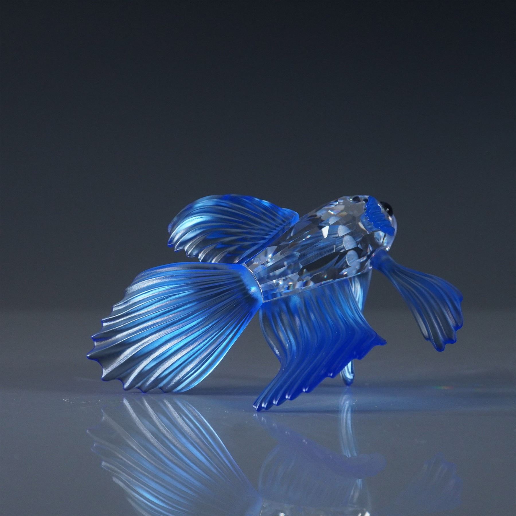 A stunning Swarovski Crystal Siamese Fighting Fish Blue figurine, featuring a faceted clear crystal body with vibrant blue frosted crystal fins and tail. This exquisite piece showcases Swarovski's craftsmanship, capturing the elegance and fluidity of this majestic fish. The figurine is marked with the Swarovski logo and comes in its original packaging.