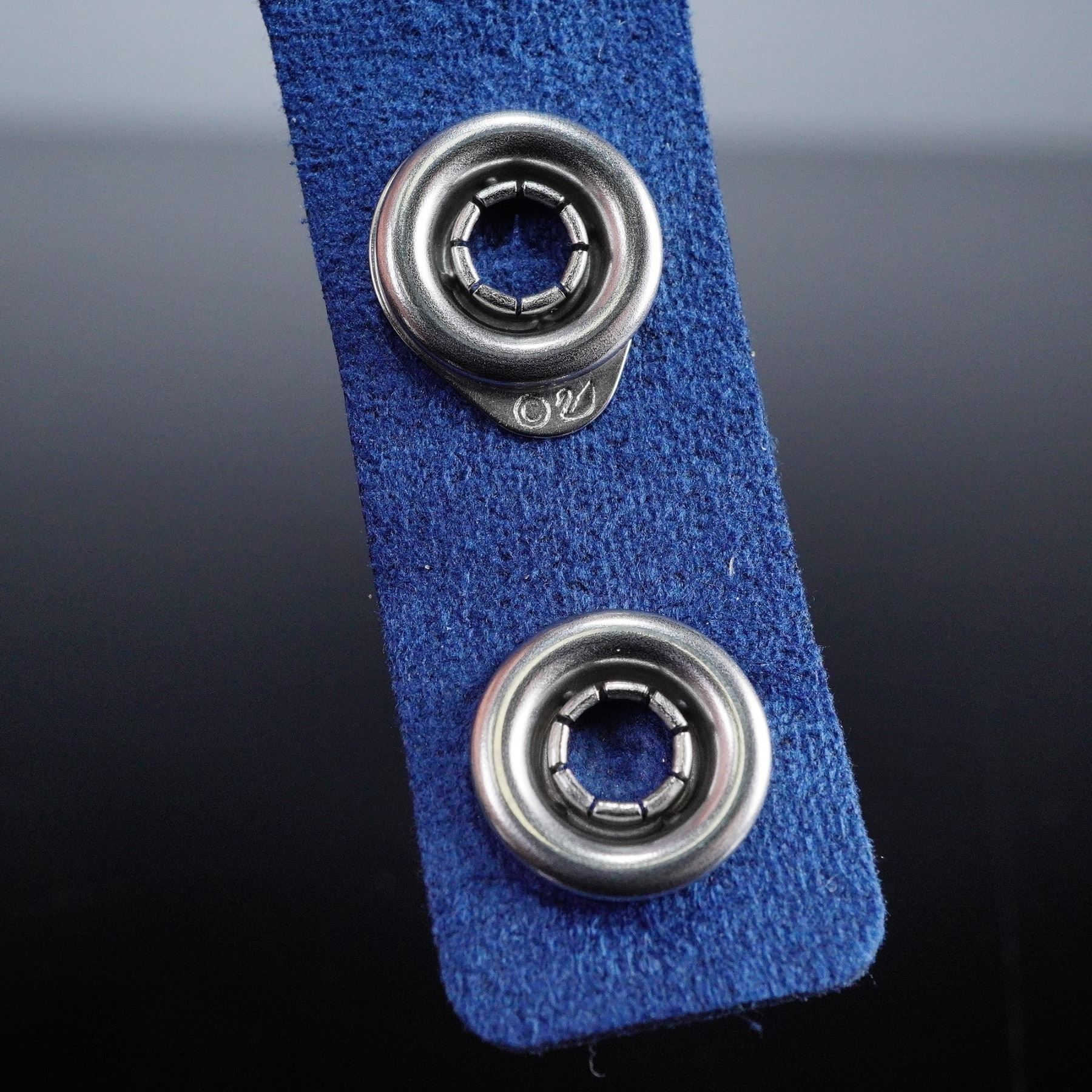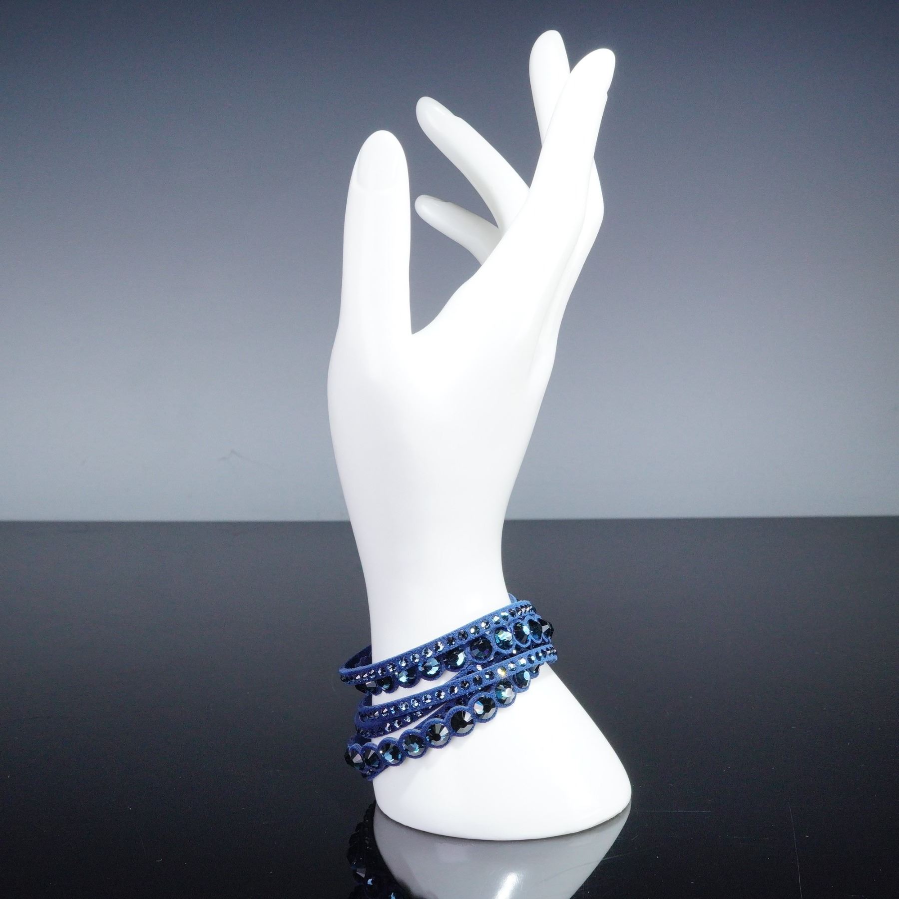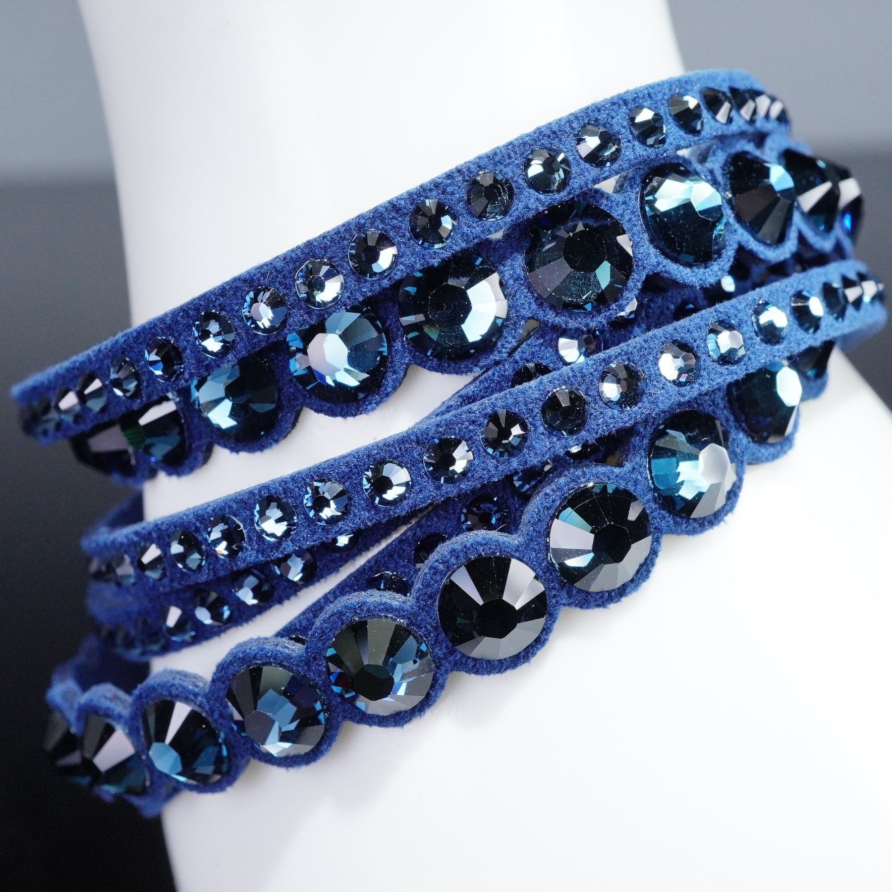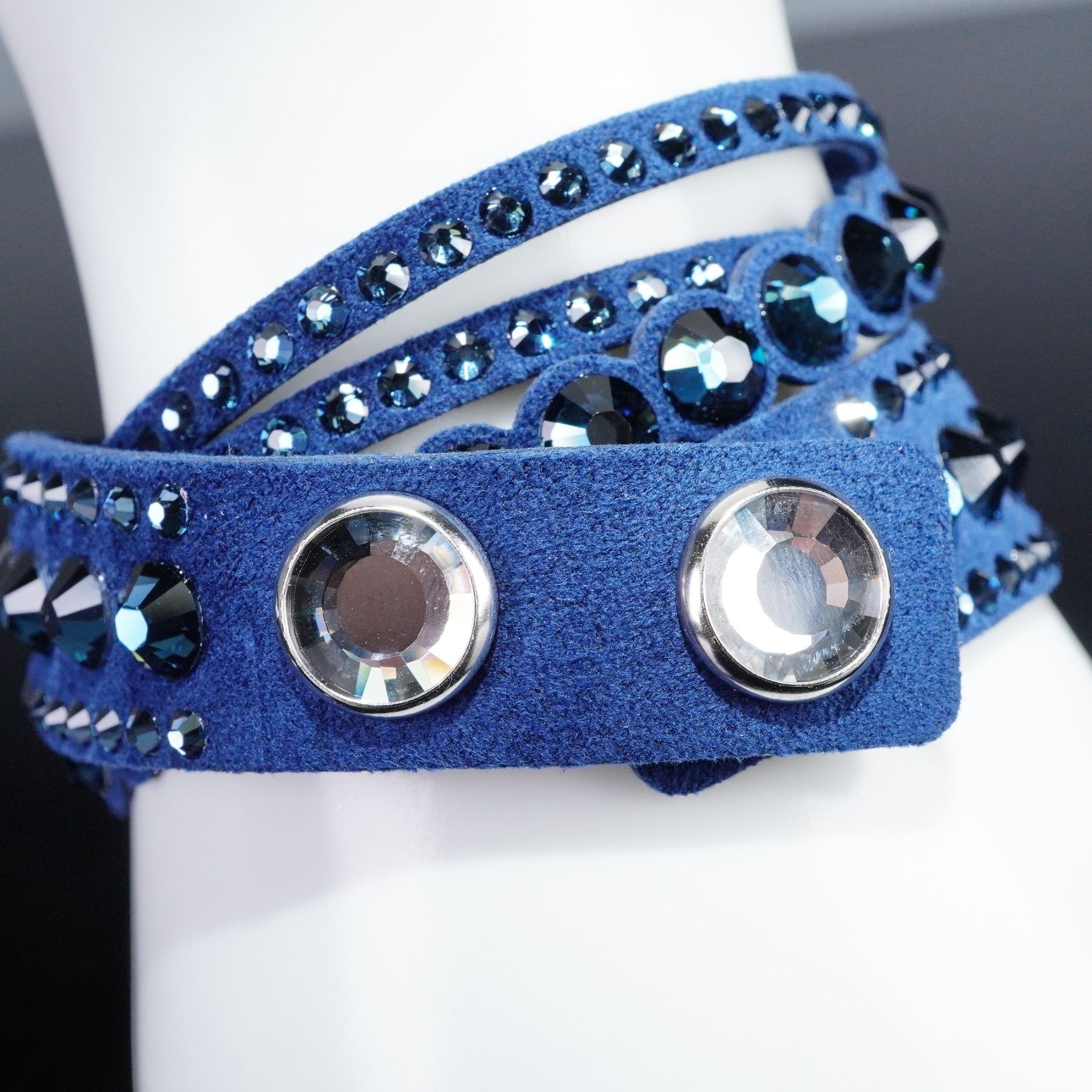 Gorgeous Slake wrap bracelet designed in a deep blue suede like band, lavishly adorned with multiple rows of round faceted crystals in coordinating dark blue tones. The piece featuring a layered wraparound style secured with two crystal embellished snap fasteners for adjustable sizing. Swarovski backstamp. This item has its original box.