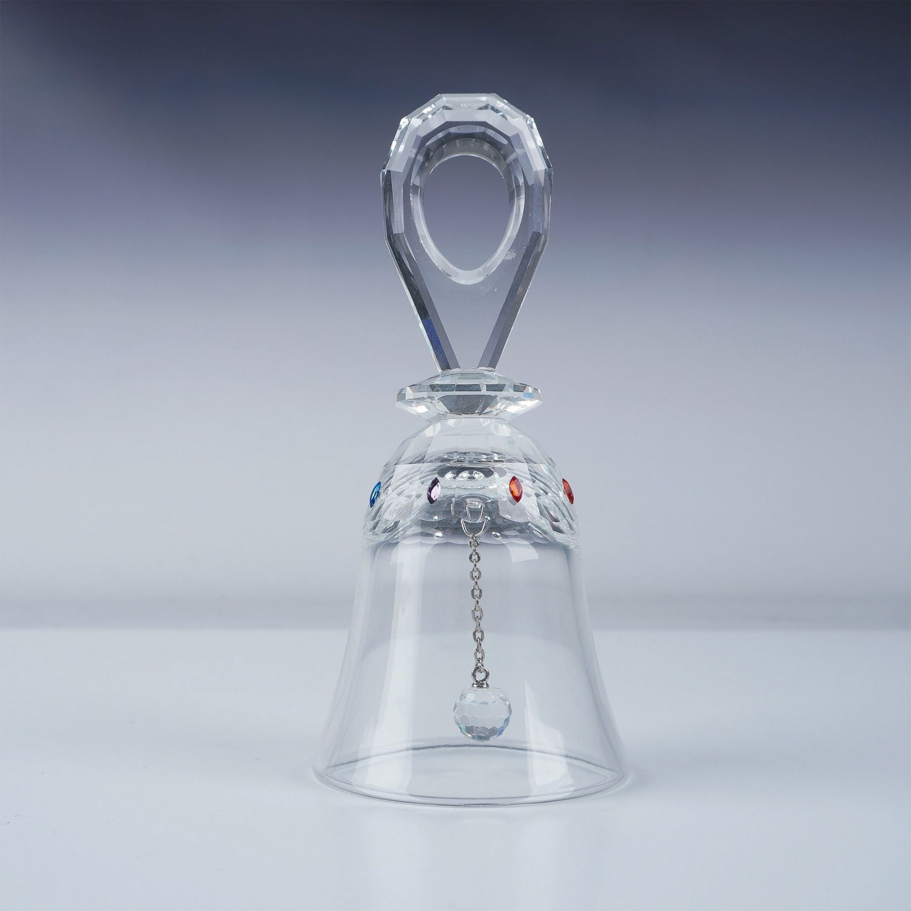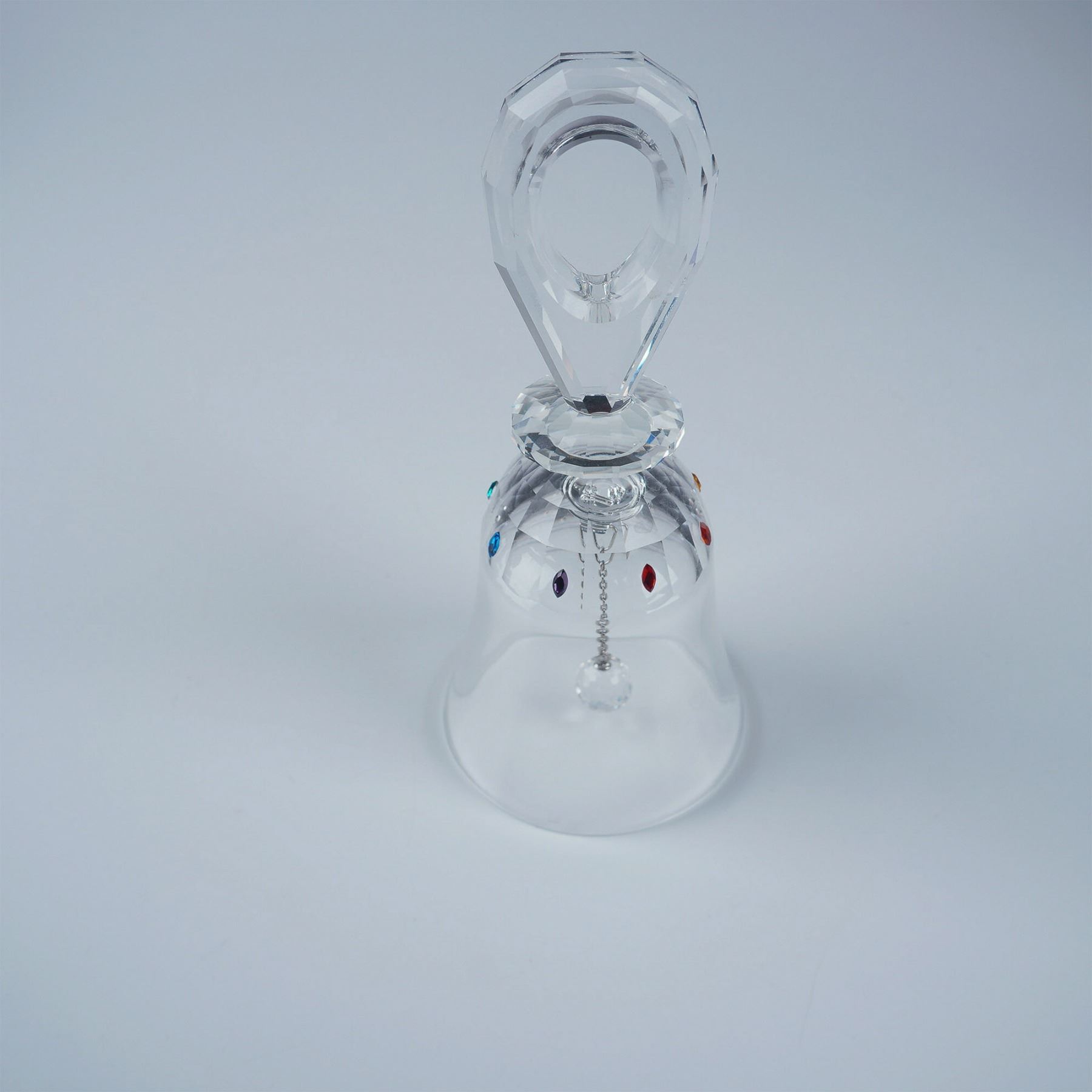 This Swarovski Crystal Solaris Table Bell features a beautifully faceted handle and a clear bell adorned with multicolored crystal accents. Originally part of the Exquisite Accents theme group, it was later reclassified under Crystal Home Accessories. The piece is marked with the Swarovski logo, signifying its authenticity and craftsmanship. This item has its original box.