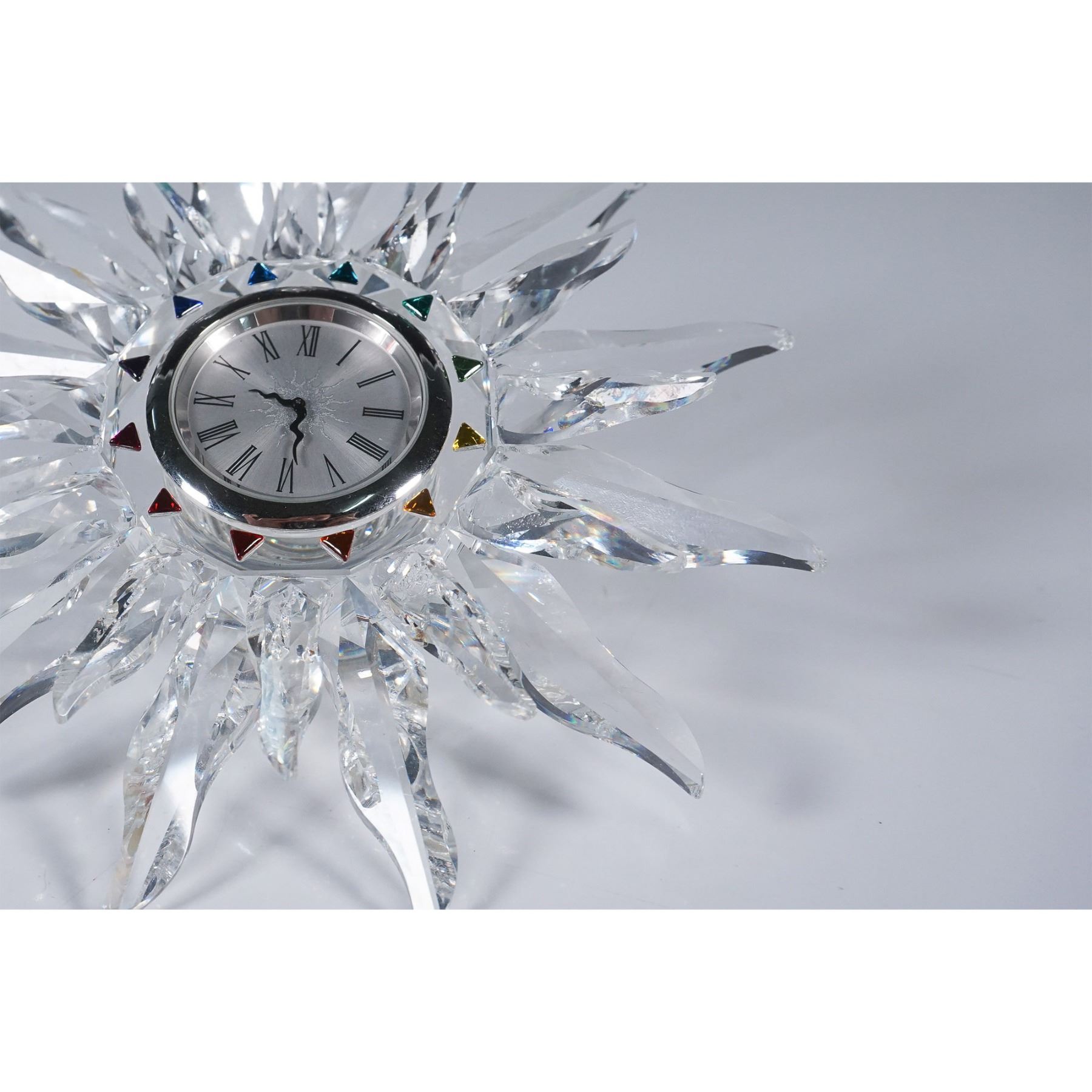 Elegant Swarovski Solaris Table Clock, model number 211626, designed by Adi Stocker. Introduced in 1998 and retired in 2004, this exquisite timepiece features a striking sunburst design with faceted crystal rays emanating from a central silver-tone clock face. The Solaris clock is accented with multicolored triangular crystals, adding a vibrant touch to its radiant aesthetic. A perfect blend of function and artistry, this piece is a highly sought-after collectible. Comes with its original Swarovski packaging.