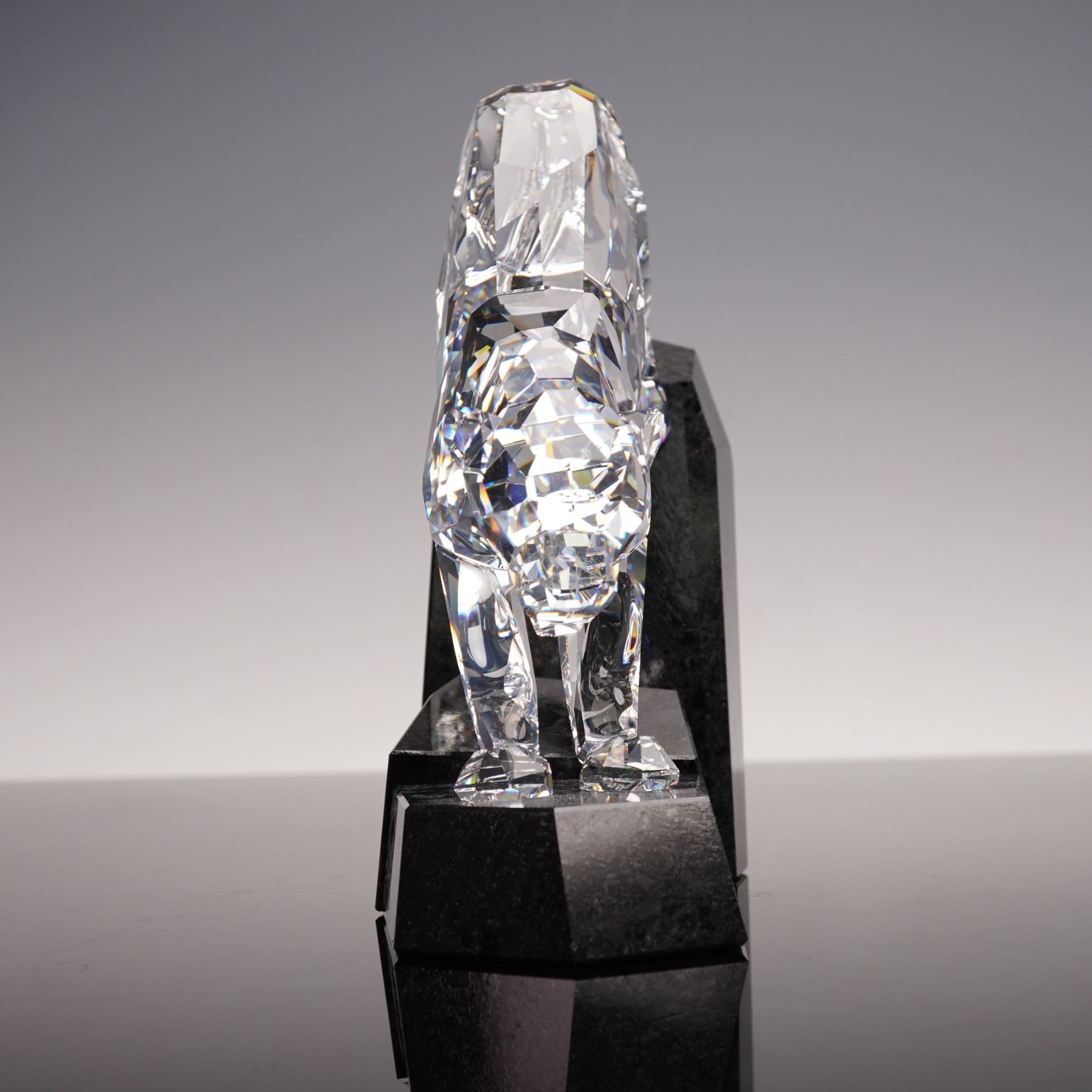 Striking Swarovski Crystal Soulmates Panther, designed and signed by Heinz Tabertshofer. This elegant sculpture depicts a panther poised in a powerful stance atop a polished black granite base, rendered in clear faceted crystal that captures both strength and grace. The piece is artist-signed and dated 2001, and etched with the Swarovski swan logo on the flank. Part of Swarovski's Soulmates Collection, this design embodies the theme "Power of Elegance," celebrating the untamed beauty of nature through sophisticated craftsmanship and dynamic form. Includes original presentation box, certificate, and polishing cloths and gloves, making it a complete collector's set. 874337.