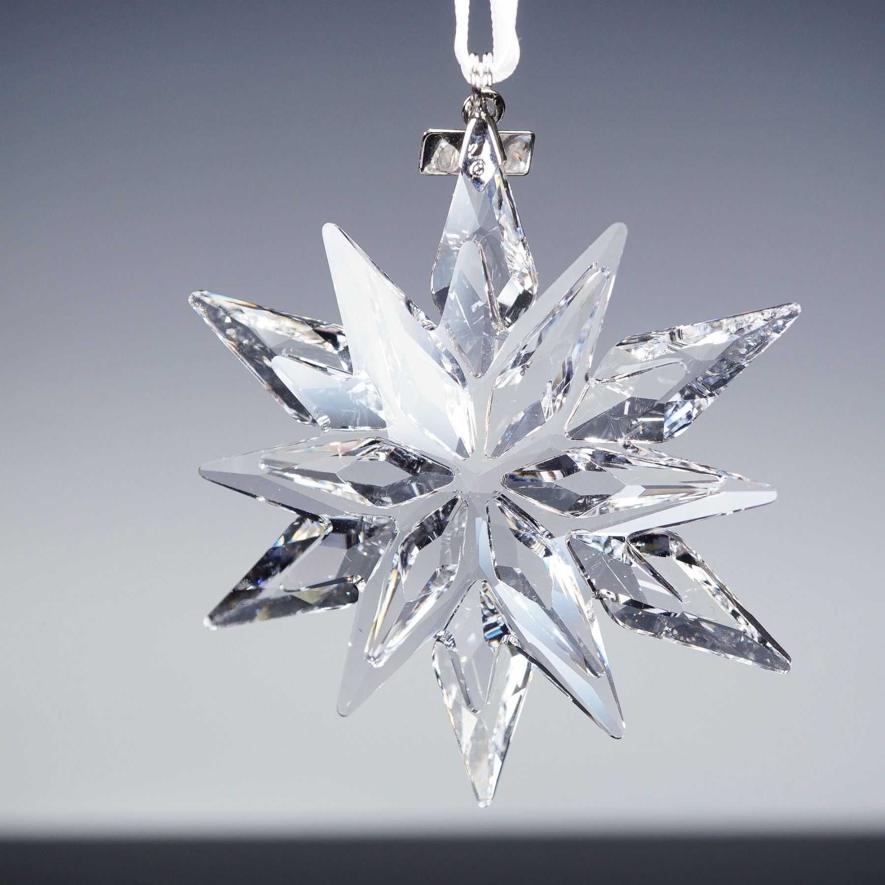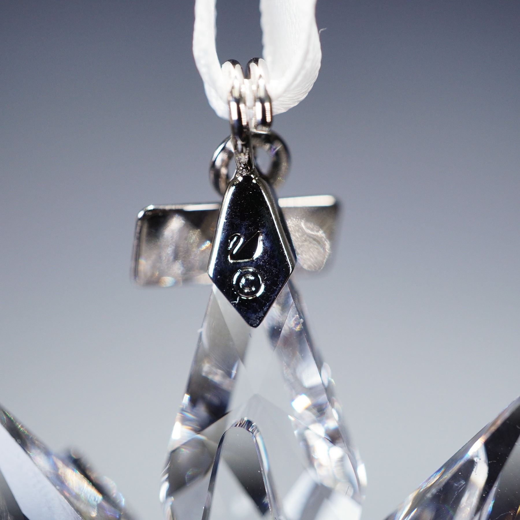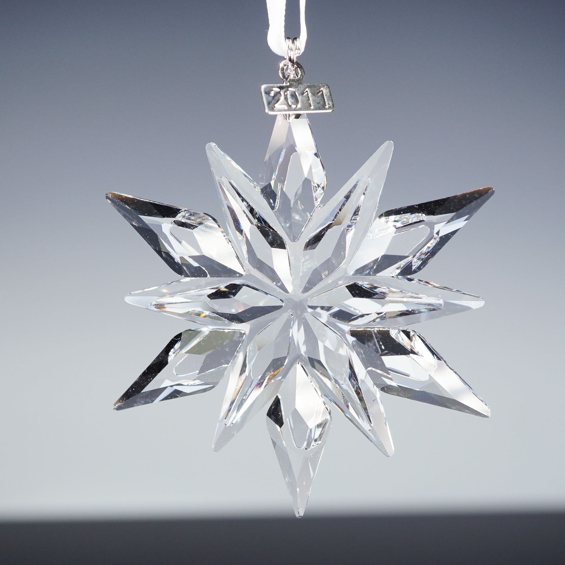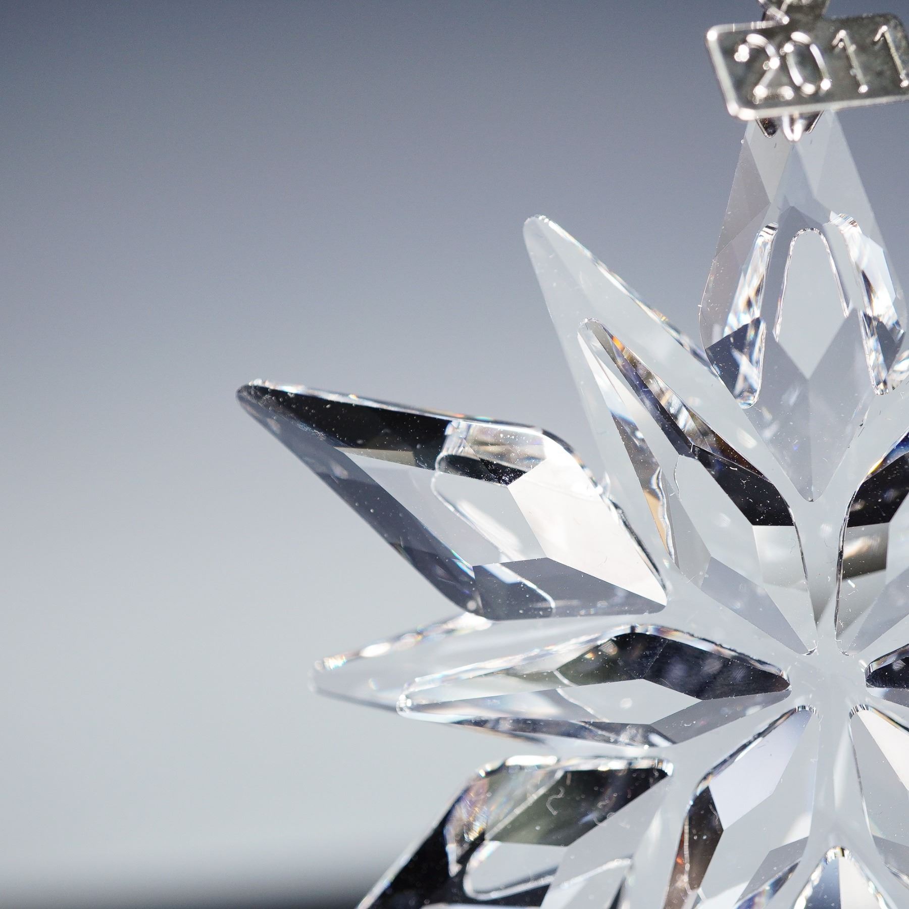 The clear faceted crystal is cut in the form of a multi-pointed star and is suspended from a white satin ribbon. The ornament features a metal tag engraved with the year 2011 and a metal clasp stamped with the Swarovski swan logo.  This item has its original box.