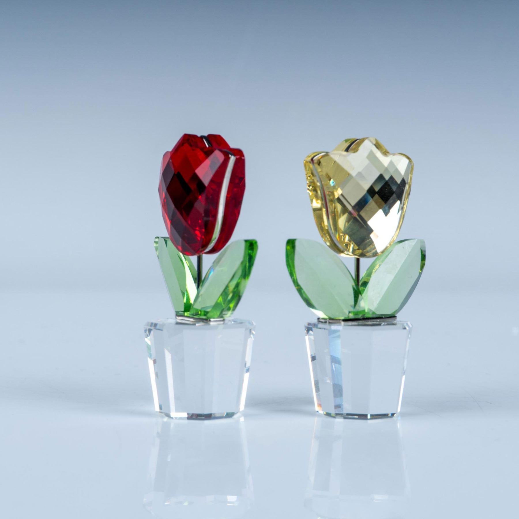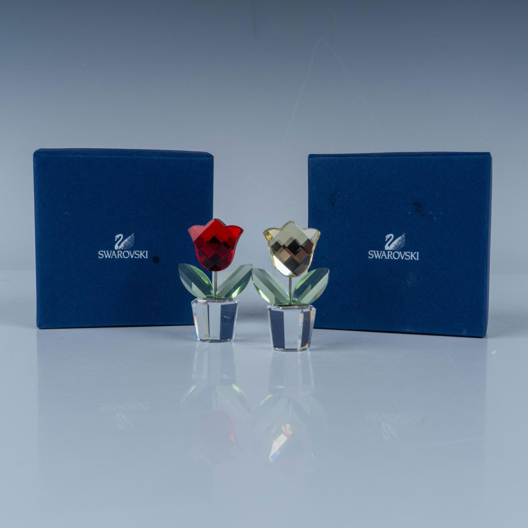 This lot features two Swarovski crystal tulip figurines, both accompanied by their original navy-blue boxes with the Swarovski logo. The figurines are crafted from precision-cut clear and colored crystals, depicting elegant tulips in a vase-like base. Dimensions: 2.5"H