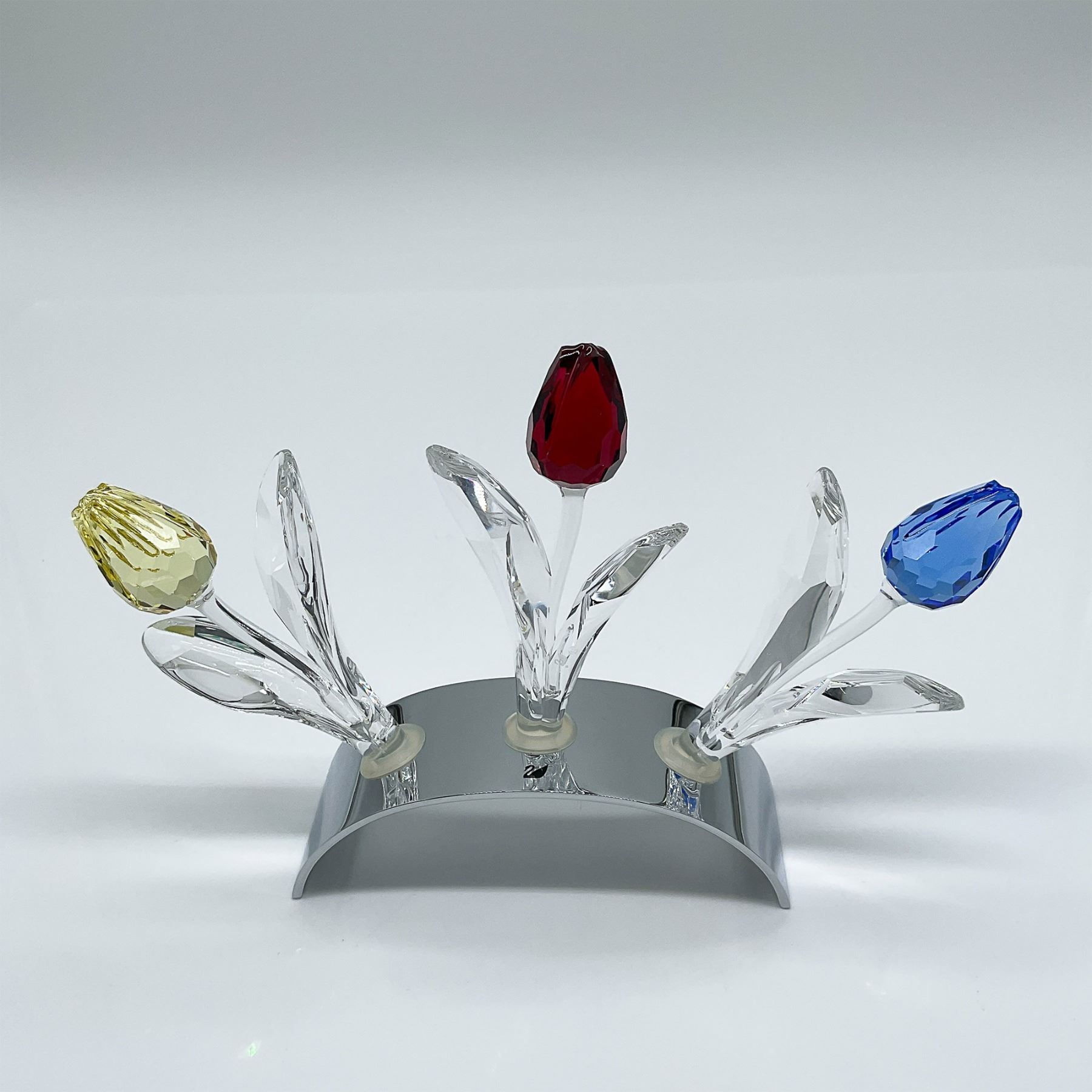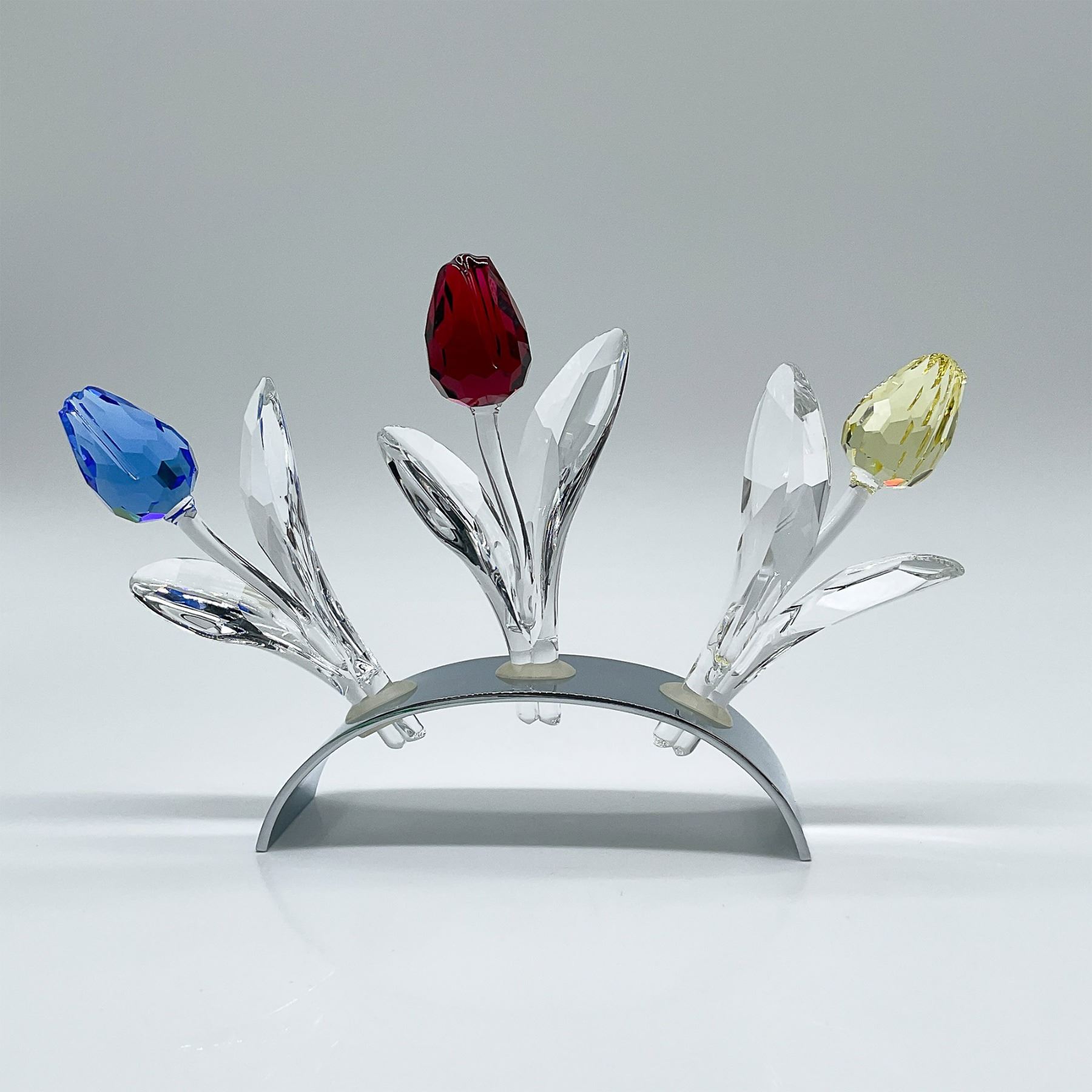 This stunning Swarovski crystal tulip set includes a sleek metal stand designed to hold three tulip figurines, creating an elegant display. The set features the Tulip Stand for 3 Tulips, code 600346, with a modern, arched design that perfectly complements the vibrant tulip colors; Tulip Blue, code 606546, a brilliantly faceted crystal tulip in a striking sapphire blue hue; Tulip Red, code 626481, a deep ruby red crystal tulip with exceptional clarity and sparkle; and Tulip Yellow, code 657335, a luminous golden yellow crystal tulip that radiates warmth and charm. Each tulip is intricately crafted with precision-cut leaves and stems, showcasing Swarovski's unparalleled attention to detail. Marked Swarovski. This collector's set was created for discerning enthusiasts and would make an exquisite addition to any Swarovski collection or as a thoughtful gift.