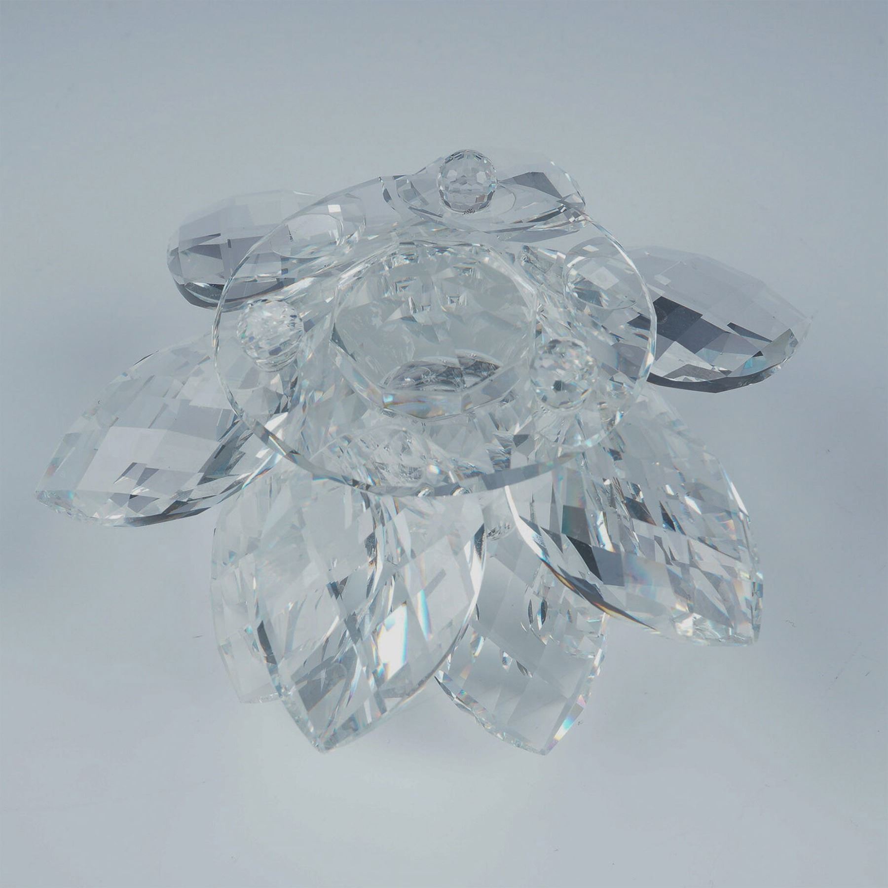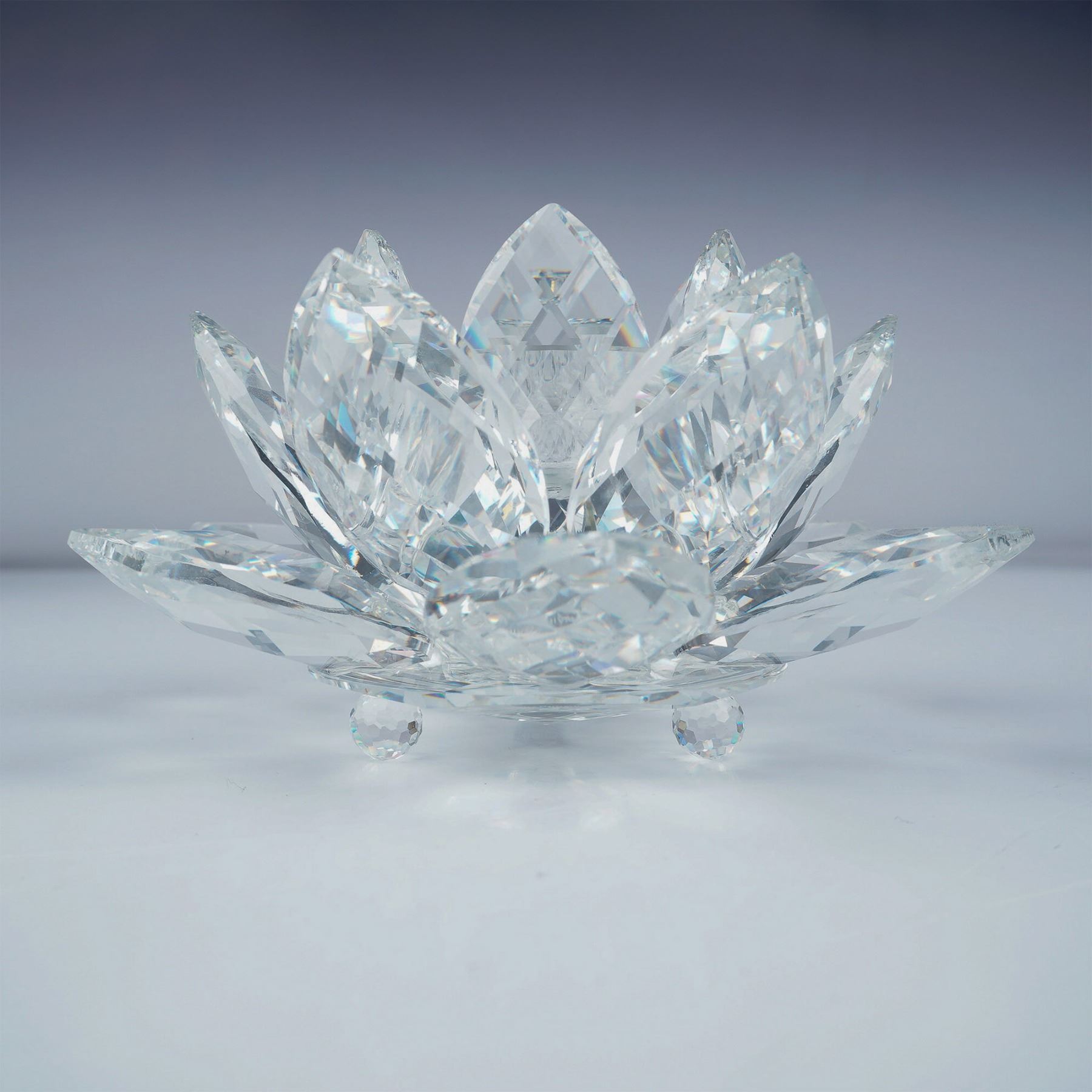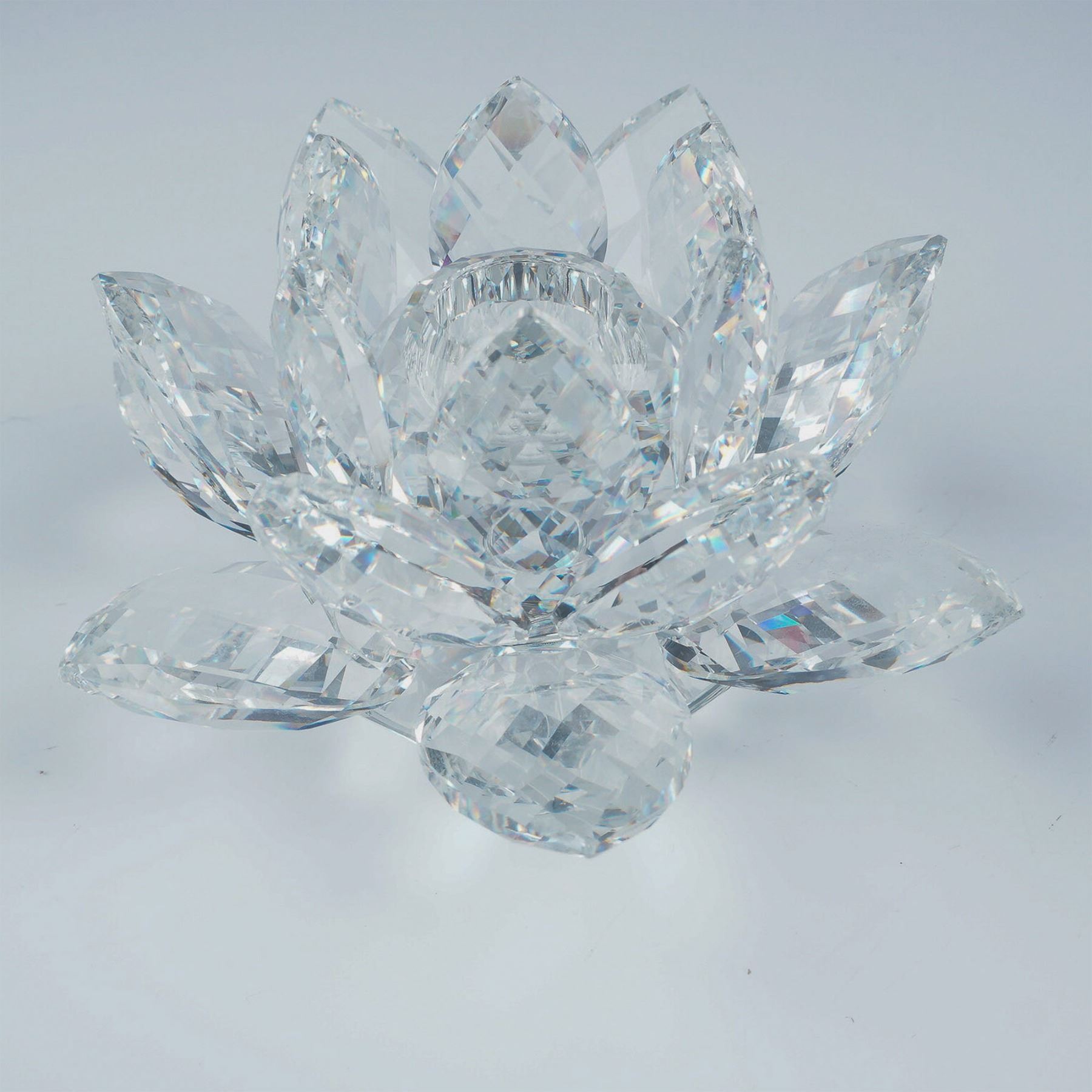Exquisite Swarovski crystal waterlily candleholder, beautifully crafted in the shape of a multi-petal waterlily. Featuring faceted crystal petals and three crystal ball feet, this large piece radiates elegance and craftsmanship. Marked with the Swarovski logo and includes its original box.