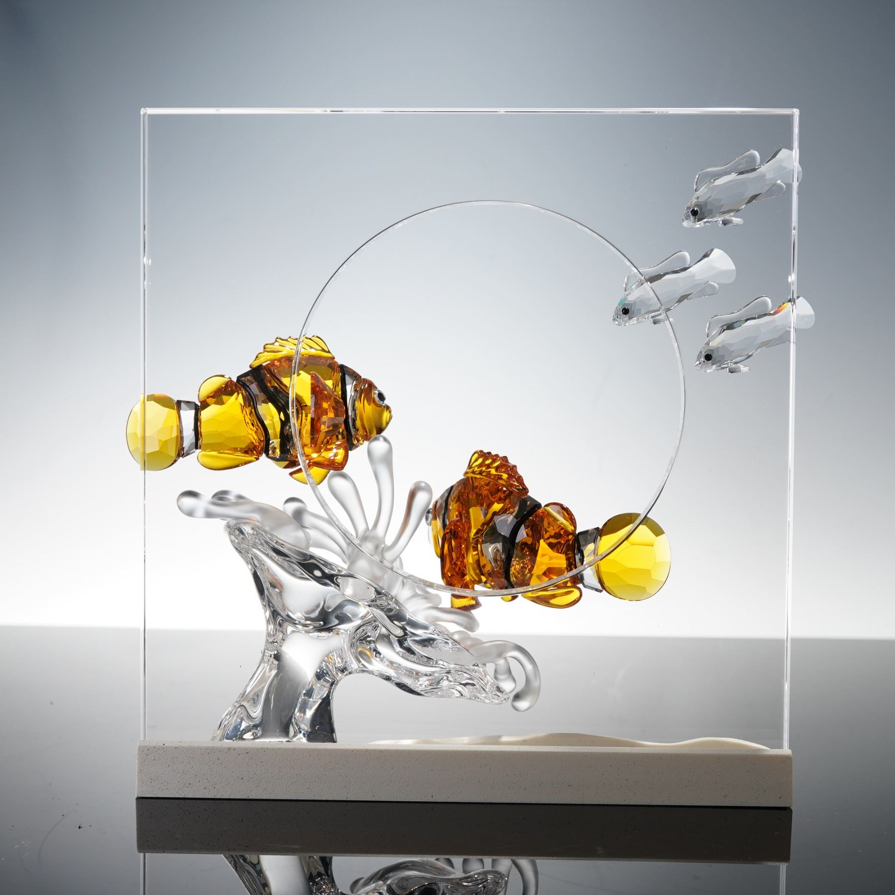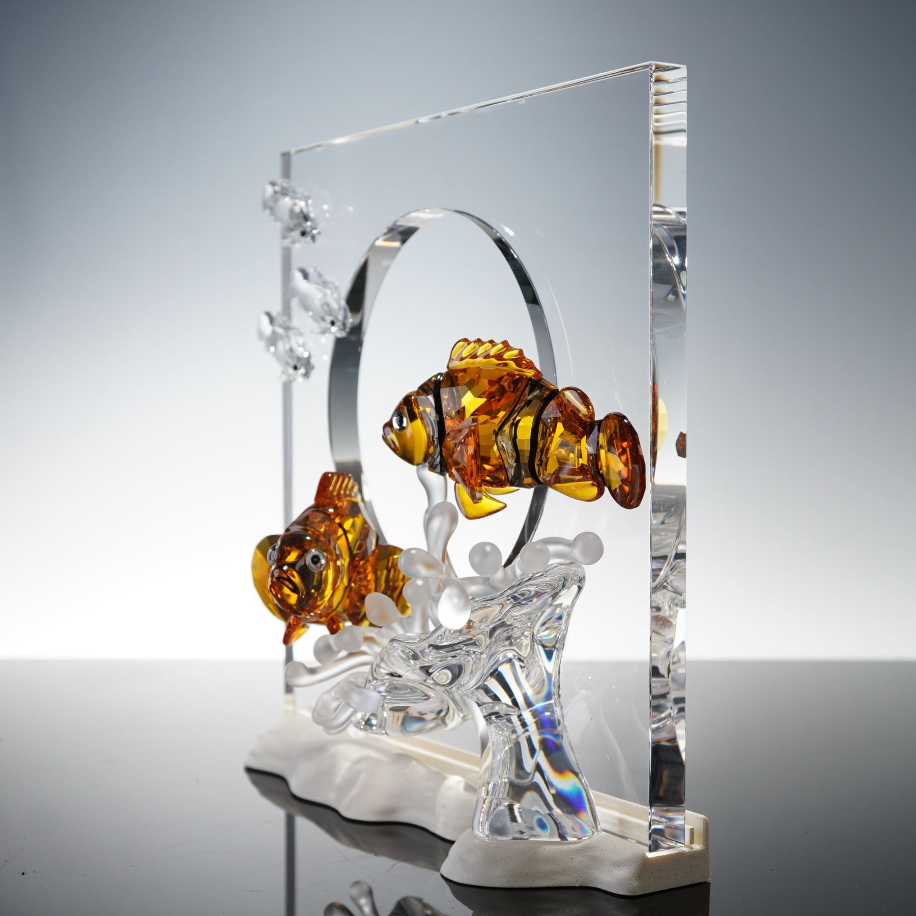 Spectacular Wonders of the Sea sculpture titled Harmony, designed by Martin Zendron. This extraordinary underwater composition showcases two vibrant clownfish in shades of Topaz crystal, swimming among frosted crystal coral and smaller clear fish, all mounted within a clear rectangular backdrop and resting on a wave-like base. A member of Swarovski's renowned Wonders of the Sea trilogy, this piece embodies the grace and serenity of marine life through expert crystal artistry. Signed with the Swarovski swan logo and inscribed M.Z. 2005 on the base, it is presented in its original box with background display card. 657120.