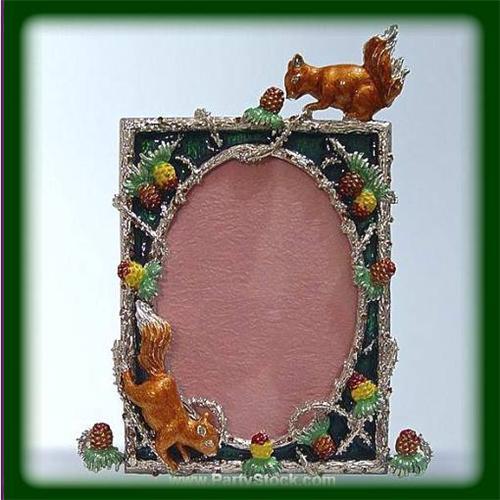 Two playful squirrels grace this whimsical picture frame. Lots of acorns are featured on a dark green backdrop. Set with genuine Swarovski crystals and detailed in 24K gold.