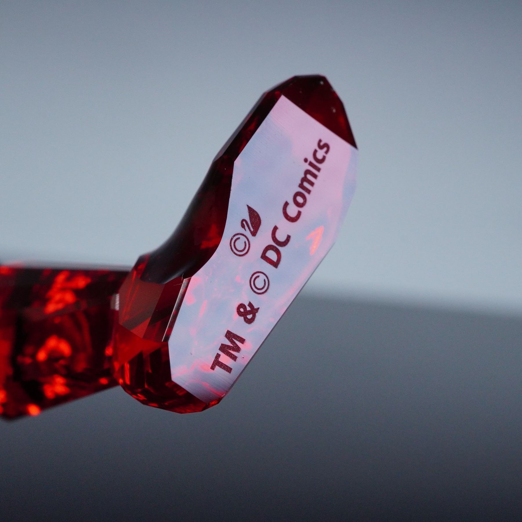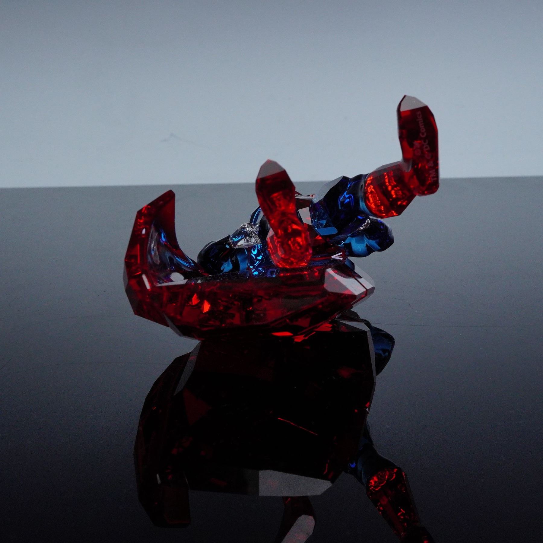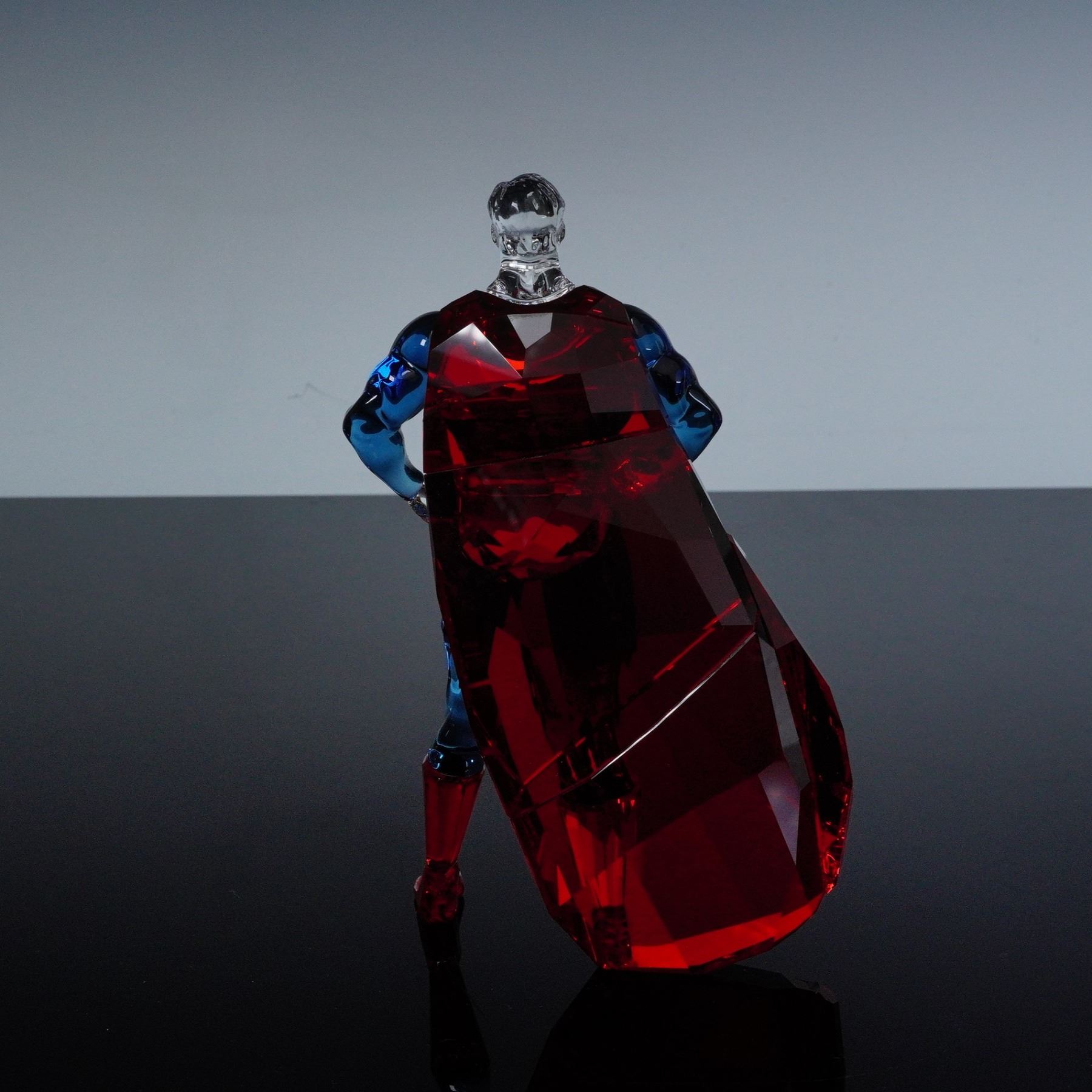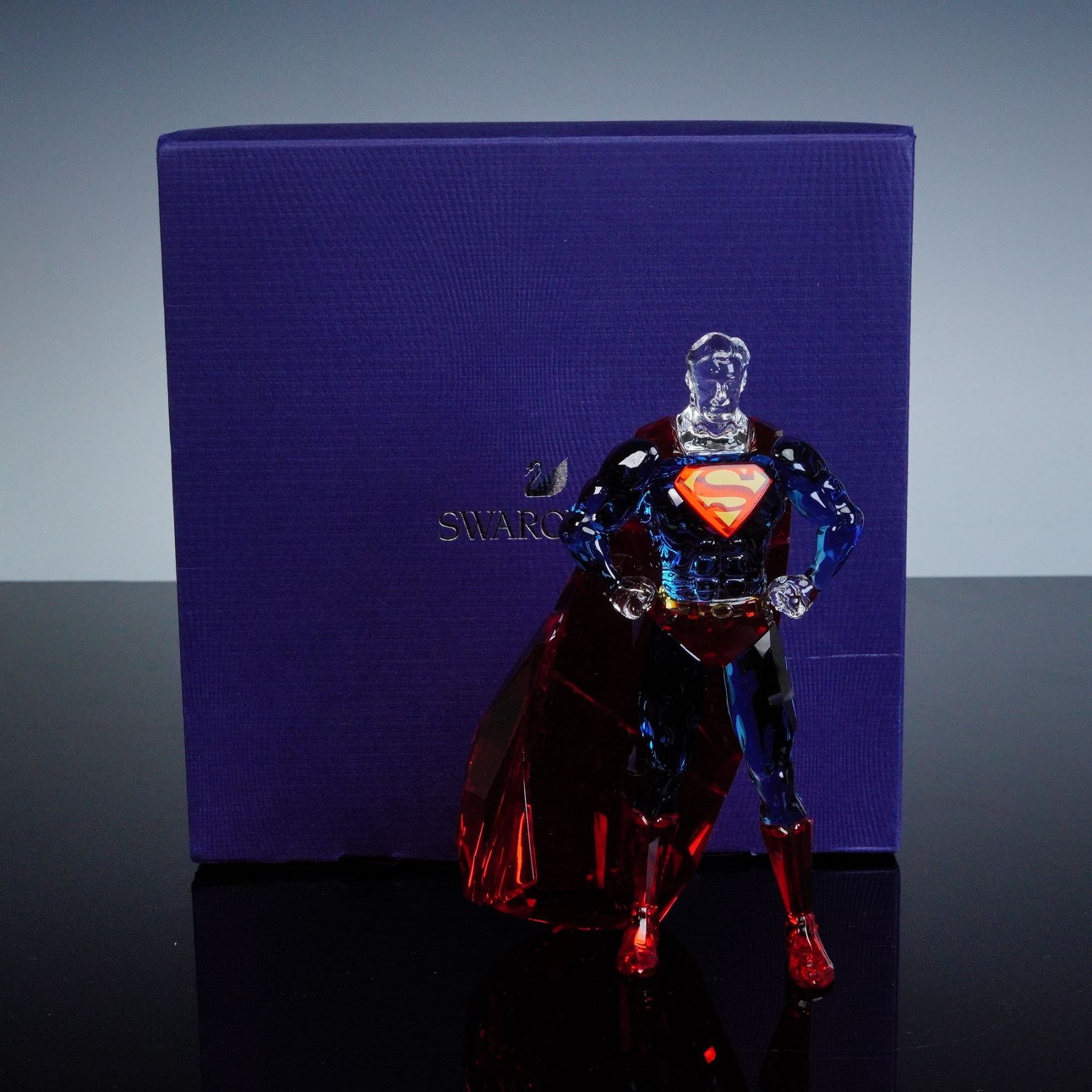 A bold Swarovski crystal figurine representing Superman, the legendary hero from DC Comics. Crafted in vivid red, blue, and clear crystal, this powerful design portrays the Man of Steel standing in a commanding pose with his cape flowing behind him. The bright yellow and red S-shield emblem gleams on his chest, symbolizing hope and heroism. This striking composition showcases Swarovski's expert craftsmanship and dynamic attention to form. The figurine bears the Swarovski swan logo and DC Comics markings. Includes original Swarovski box. Model 5556951.