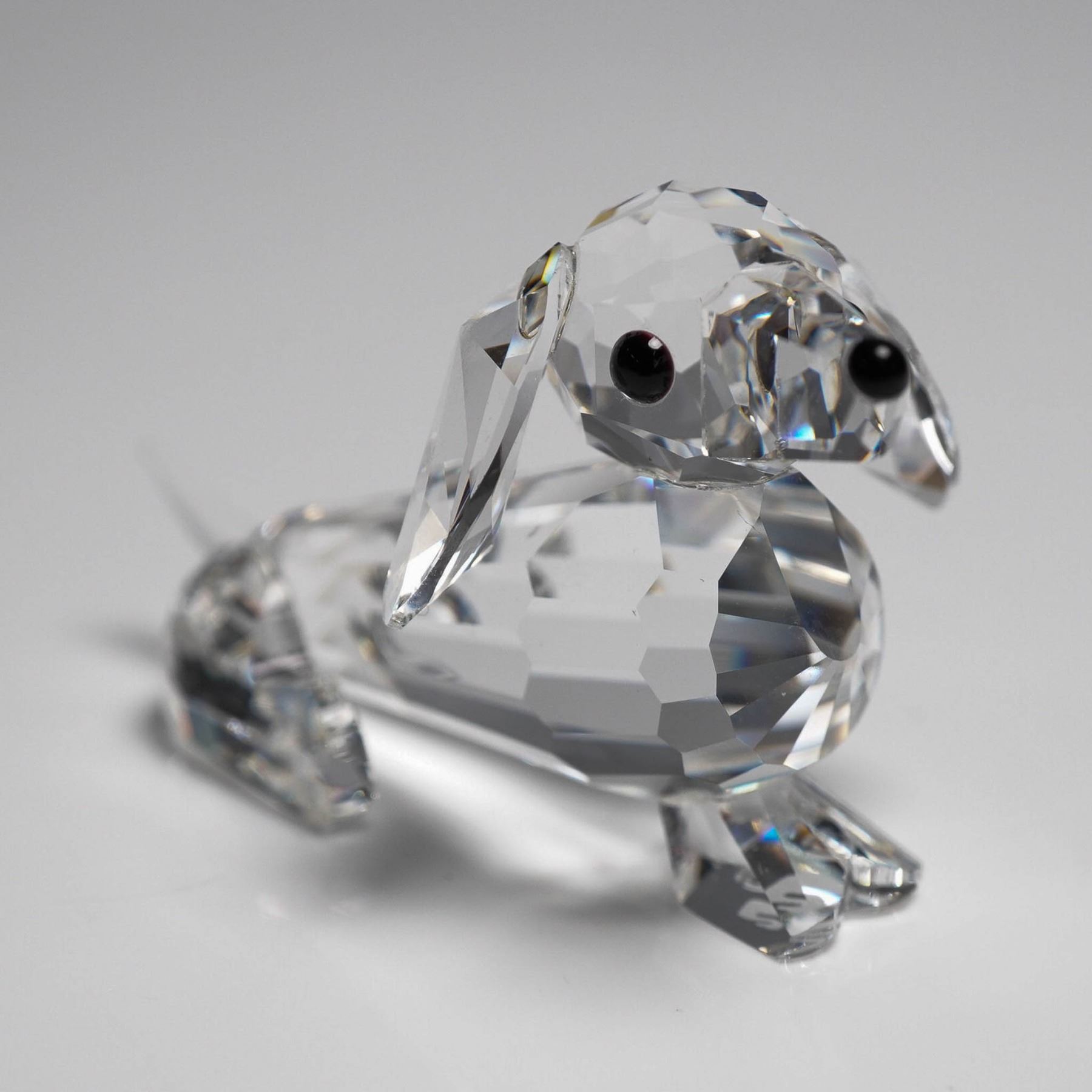 A charming Swarovski Silver Crystal figurine titled Dachshund Mini, featuring the Variation 2 design with a frosted crystal tail. This finely faceted miniature figurine captures the lovable dachshund breed with remarkable precision. Crafted from clear faceted crystal, the figurine features black crystal eyes and a frosted tail, distinguishing it as Variation 2 in the series. Introduced in 1992 and retired in 2006, this piece belongs to the Pet's Corner theme group and was part of the Swarovski Miniature Dog series. Includes the original fitted cylindrical box with swan logo.