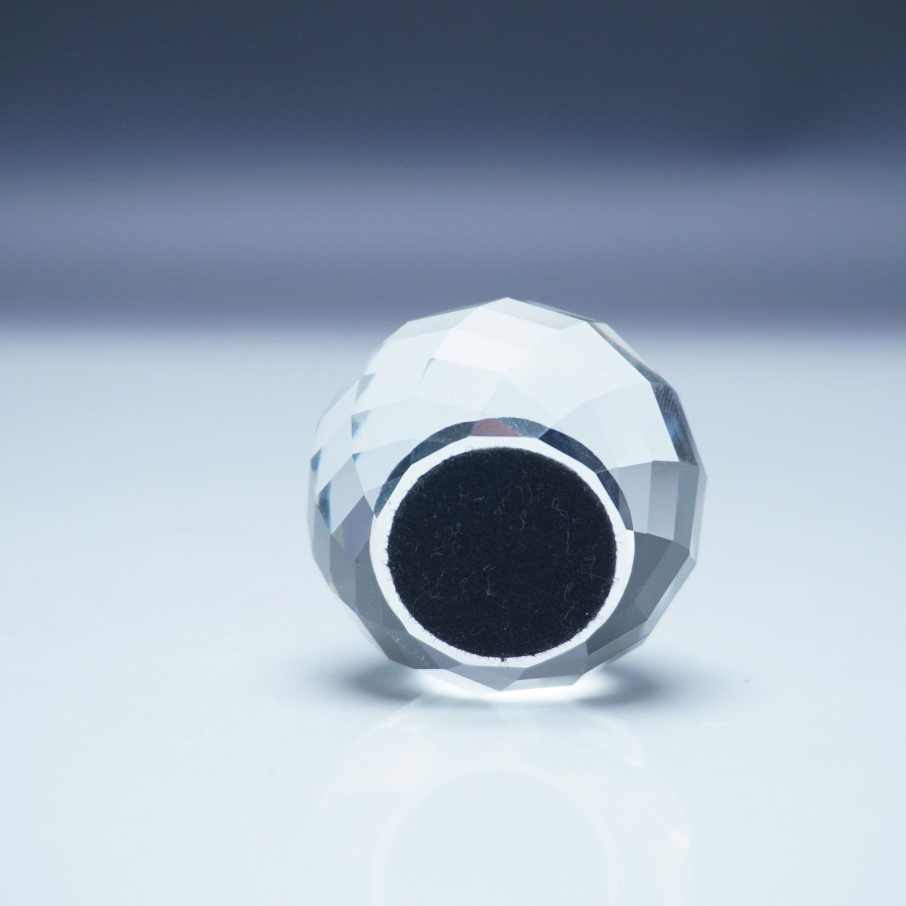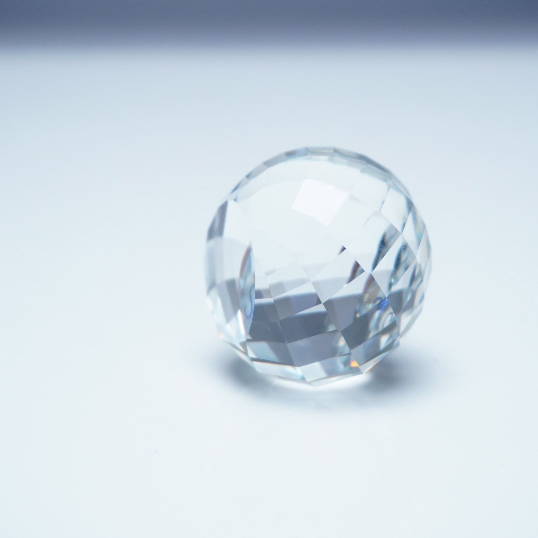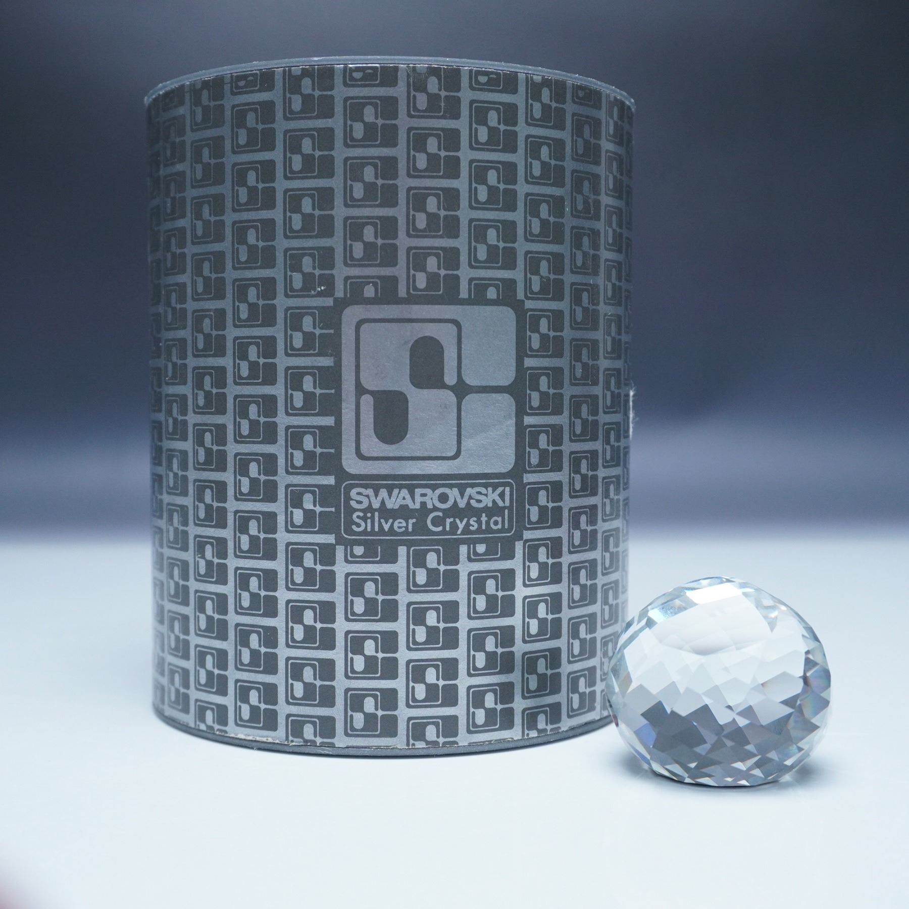 This retired Swarovski crystal paperweight was presented to dealers in the Charter year of the Swarovski Collector's Society. It features a multifaceted clear crystal design with the SCS logo in blue and a small blue edelweiss flower, symbolizing the exclusivity of the society. This collectible piece comes with its original box and bears the Swarovski mark.