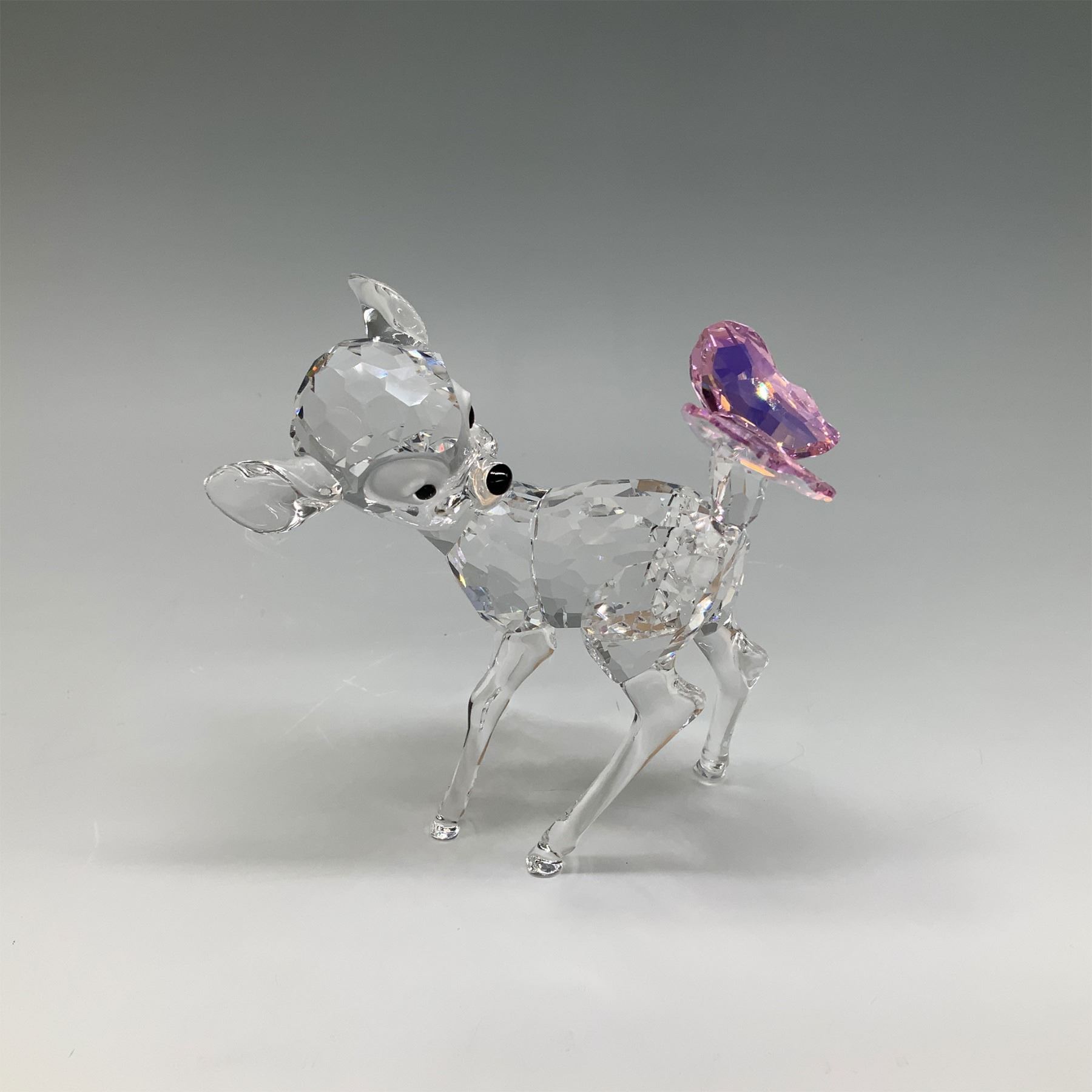 Swarovski crystal figurine depicting Disney’s Bambi, featuring a faceted clear crystal body with unfaceted legs and a delicate Aurora Borealis Rosaline crystal butterfly perched on the tail. The figurine includes Jet Crystal eyes and nose, capturing the character's charming expression. Designed by the Swarovski team, this piece was introduced in 2008 and retired in 2012. Backstamp includes the Swarovski swan logo. Comes in the original Swarovski blue box with product code 943951.